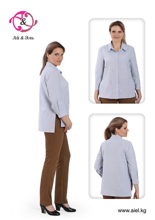 Model 3 Turkish fabric, 100% cotton Women's loose-fitting shirt with a stand-up collar and a supate fastener. On the shelf there are two patch pockets at chest level. On the sleeves, one-button cuffs, 7/8 length. The bottom of the shirt has a comfortable cut along the side seam and an asymmetrical length, corresponding to the fashion trend of this season. Size 48-58