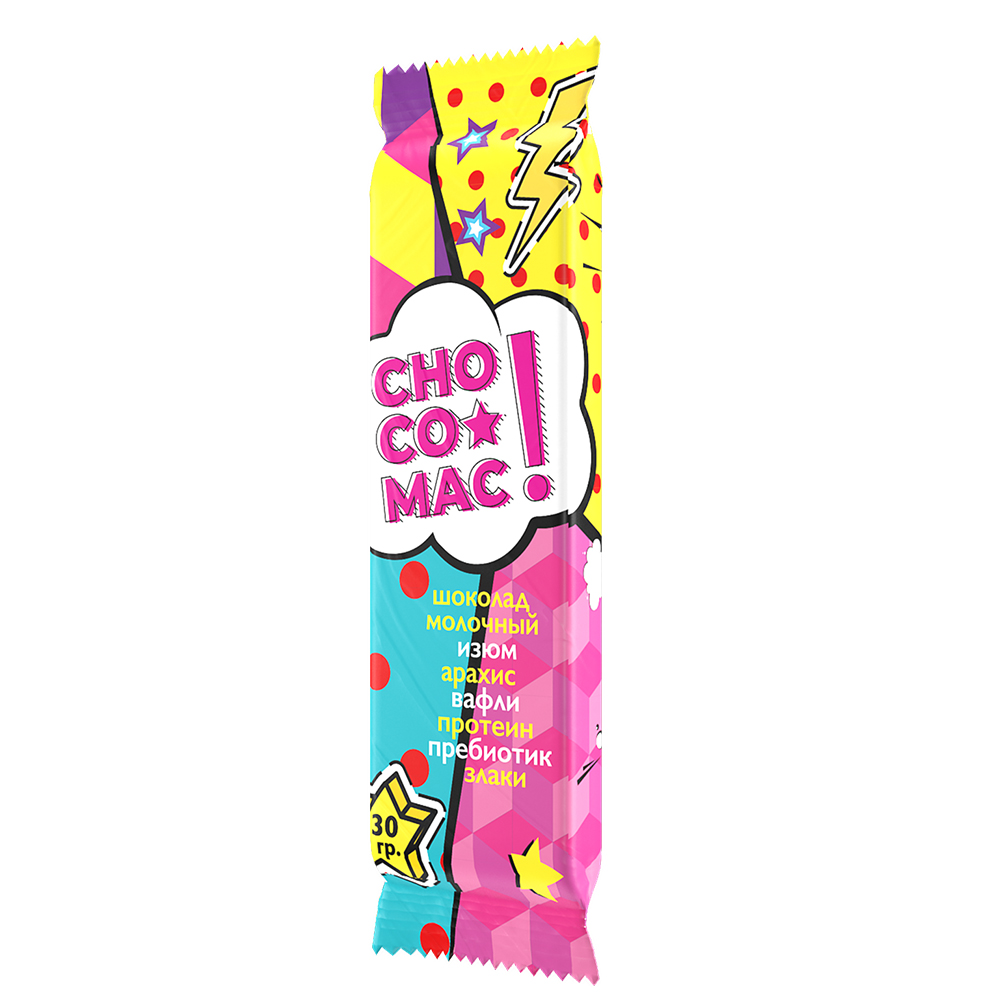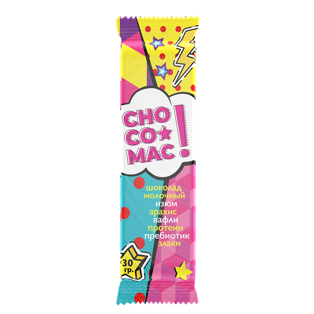 Chocolate "CHOCO-MAC" white with raisins, peanuts, cereals, waffles, protein and prebiotic, 30g - 62013
