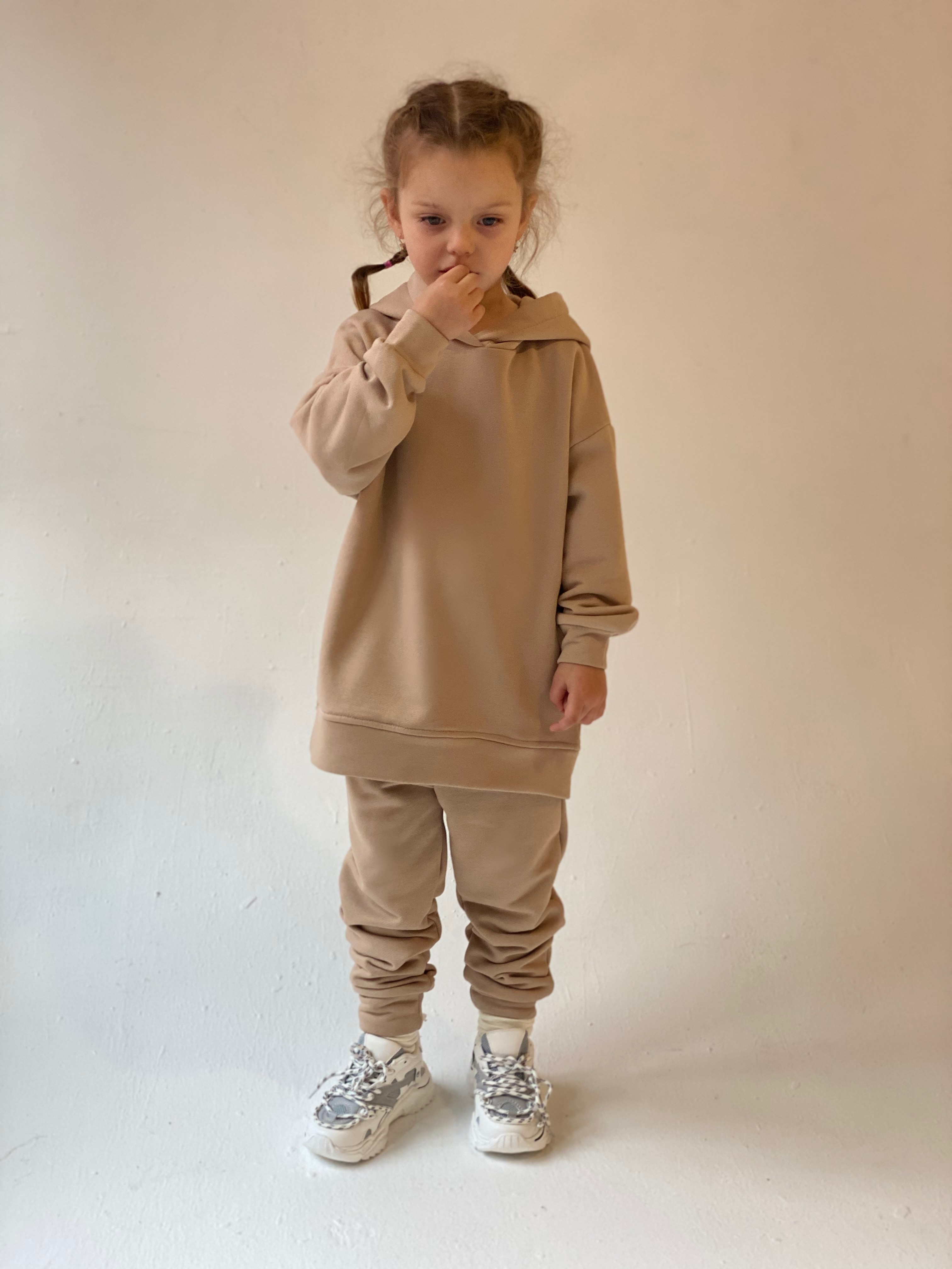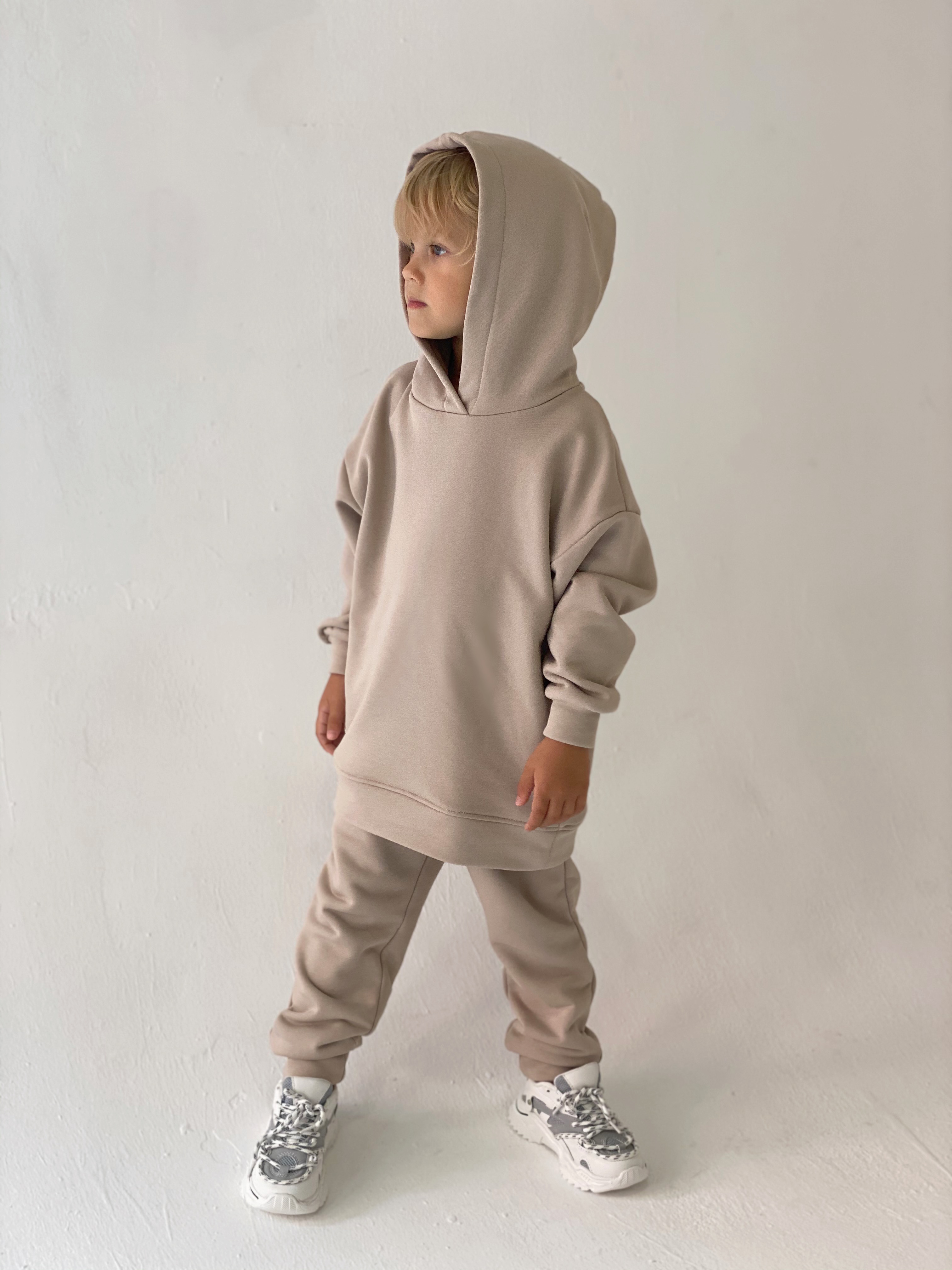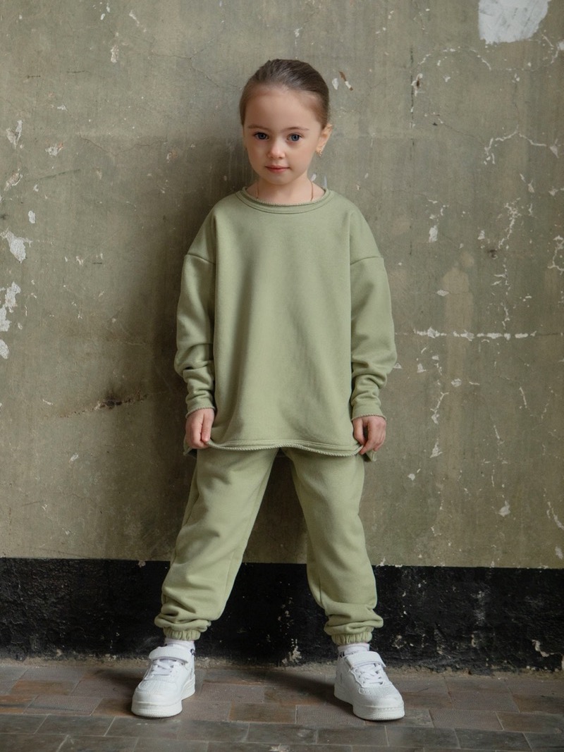 The style of our clothes is minimalism and oversized. Beauty is in simplicity. Spectacular costume. The basic model of the suit. The set consists of an elongated sweatshirt, trousers and a kashkors cap. Dense jersey of the highest quality - "singing". Does not stretch or shrink when washing and wearing. Not childishly stylish model.