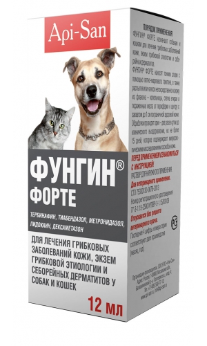 ОСОБЕННОСТИ И ПРЕИМУЩЕСТВА: • Обладает выраженной противогрибковой активностью, способствует уменьшению воспалительных процессов в коже и заживлению поврежденных тканей.• Оказывает противоаллергическое, десенсибилизирующее, иммунодепрессивное, противошоковое и антитоксическое действие.Описание: Фунгин Форте — препарат для лечения грибковых заболеваний кожи, экзем грибковой этиологии и себорейных дерматитов у собак и кошек.Общие сведения: Торговое наименование лекарственного препарата: Фунгин Форте (Fungin Forte). Международное непатентованное наименование: тербинафин, тиабендазол, метронидазол, лидокаин, дексаметазон.Лекарственная форма: раствор для наружного применения. Фунгин Форте в 1 мл в качестве действующего вещества содержит: тербинафина гидрохлорида – 10 мг, тиабен- дазола – 10 мг, метронидазола – 10 мг, лидокаина гидрохлорида – 50 мг, дексаметазона фосфат натрия – 1 мг, а в качестве вспомогательных веществ: бензиловый спирт – 300 мг, диметилсульфоксид – 100 мг, апельсиновый терпен – 5 мг и по- лиэтиленгликоль-400 – до 1 мл. По внешнему виду препарат представляет собой раствор от светло-желтого до темно-желтого цвета.Выпускают Фунгин Форте в стеклянных флаконах по 10, 12 и 15 мл, укупоренных резиновыми пробками с аллюминие- выми колпачками; в полимерных флаконах с механическими распылительными головками по 20, 30, 40 и 50 мл или в по- лимерных флаконах с крышками-капельницами с контролем первого вскрытия по 10, 12 и 15 мл. Каждую потребительскую упаковку снабжают инструкцией по применению.Хранят препарат в закрытой упаковке производителя, отдельно от пищевых продуктов и кормов, в сухом, защищенном от прямых солнечных лучей месте при температуре от 0 °С до 25 °С. Срок годности Фунгина Форте при соблюдении условий хранения в закрытой упаковке производителя – 2 года со дня производства, после вскрытия флакона – 30 суток. Запрещается применение Фунгина Форте по истечении срока годности.Фунгин Форте следует хранить в местах, недоступных для детей.Неиспользованный лекарственный препарат утилизируют в соответствии с требованиями законодательства.Фунгин Форте относится к комбинированным противомикробным лекарственным препаратам. Тербинафин – противогрибковое средство группы аллиламинов, активен в отношении возбудителей дерматомикозов жи- вотных. Механизм действия заключается в подавлении скваленэпоксидазы в клеточной мембране гриба. Это приводит к дефициту эргостерола и внутриклеточному накоплению сквалена, что вызывает гибель клетки возбудителя. В зависимости от концентрации тербинафин проявляет фунгицидный или фунгистатический эффект. Благодаря высокой липофильности молекулы тербинафина накапливаются в роговом слое дермы, волосяных фолликулах, сальных железах; при местном при- менении в системный кровоток препарат проникает в незначительной степени. Тиабендазол – фунгицид из класса азолов. Активен в отношении возбудителей трихофитии и микроспории животных родов Trichophyton, Microsporum, Epidermophyton, Achorion. Как и другие азолы, блокирует активность ферментов, участвующих в 14-деметилировании ланостерола, что ведёт к нарушению синтеза эргостерола. Изменение структуры цитоплазматической мембраны грибковых клеток приводит к нарушению ее проницаемости, выходу из клетки биологически активных веществ и разрушению клеточной стенки
