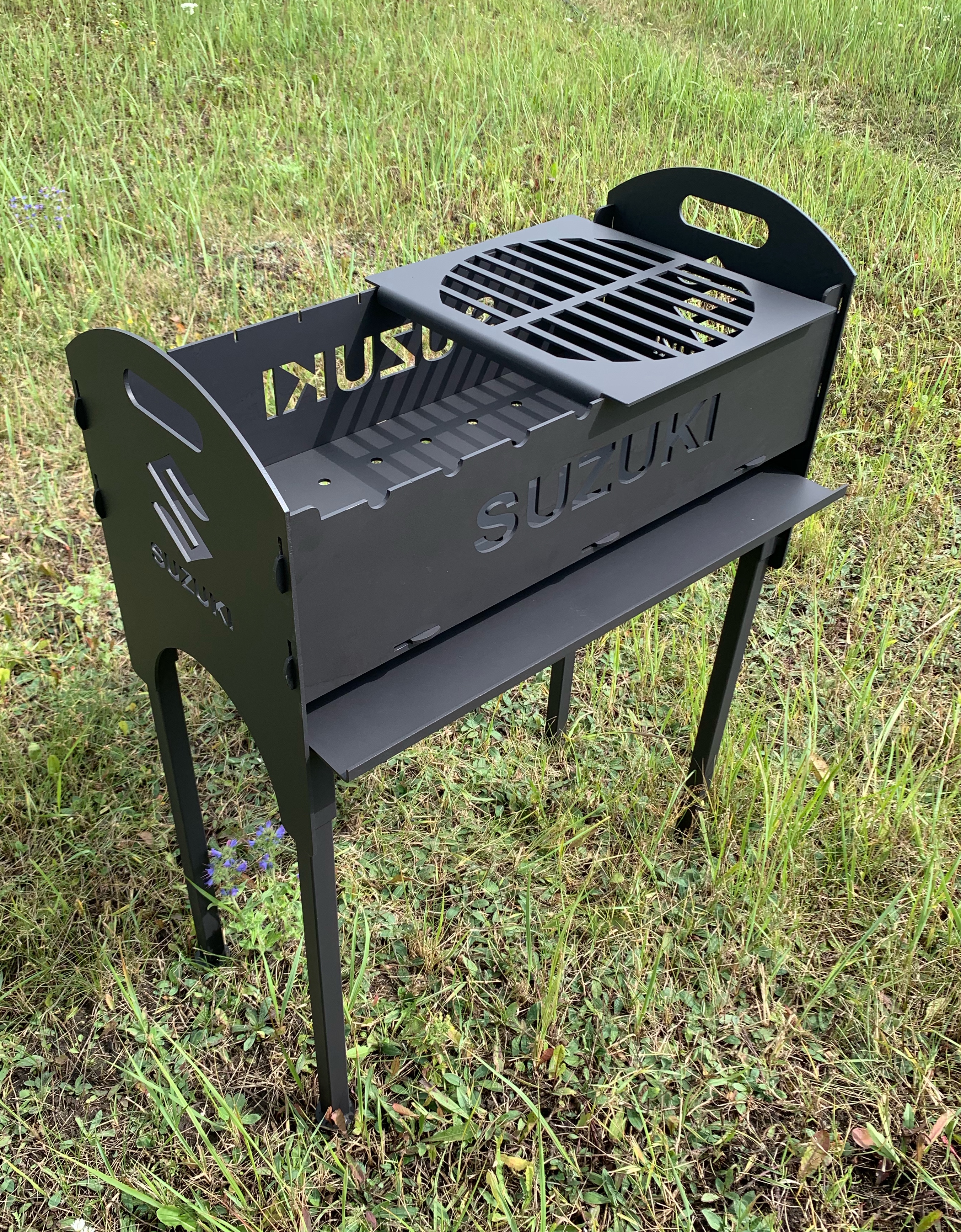 可折叠火盆由 4 毫米钢制成。 尺寸 h-890 毫米,w-320 毫米,d-650 毫米,火盆高度 150 毫米。 涂有耐热涂料,可承受高达 1200 度的高温。 可以使用您需要的标志、汽车品牌、铭文或图案进行制造。 火盆易于组装和拆卸,您可以将其放在家里或随身携带到大自然中。 该套装包括额外的腿、一个烟灰缸、一个餐具架(水壶、平底锅、盘子)。