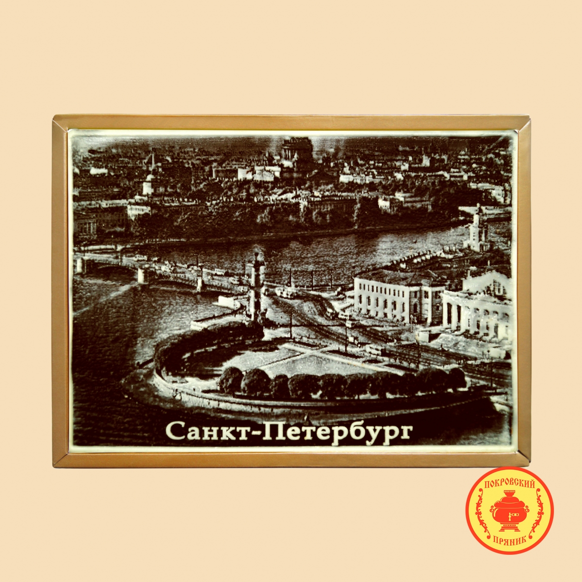 Традиционное тесто, изготовленное и выпеченное по старинным русским рецептам, покрывается слоем шоколадной глазури «Премиум» класса на которую наносится тематический рисунок, а Внутрь толстый слой начинки из вареной сгущенки и грецких орехов, такой характерный для Покровского пряника.