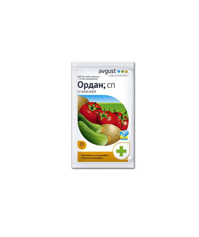 Контактно-системный фунгицид, применяемый для борьбы против альтернариоза, фитофтороза и прочих заболеваний растений на помидорах, огурцах и картофеле, а также на винограде и прочих культур.Инструкция по применению:Рабочий раствор из Ордана готовят перед проведением обработки растений. Необходимое количество препарата растворяют в небольшом количестве воды, после чего разбавляют водой при непрерывном помешивании до необходимого объема. Раствор перемешивают время от времени и во время обработки культур.При обработке Орданом декоративных комнатных растений, используют 1-5 грамм препарата на 1 л воды. Максимальное количество обработок за сезон – 3 раза. Сбор винограда и картофеля можно начинать через 3 недели после последней обработки, помидоров и огурцов открытого грунта – через 5 дней, закрытого грунта – через 3 дня.Совместимость:Ордан совместим с большинством препаратов, кроме имеющих щелочную реакцию. В любом случае, перед смешиванием препаратов необходимо проверить их на совместимость – появление осадка при смешивании говорит об их несовместимости.Меры безопасности:Ордан умеренно опасен для человека (3-й класс опасности). Имеет 2-й класс опасности для пчел и 3-й класс по стойкости в почве. Для птиц и почвенных организмов практически не вреден. Запрещено работать с препаратом около рыбохозяйственных водоемов.Работать с препаратом необходимо в защитных очках, резиновых перчатках и сапогах, спецодежде, респираторе. Запрещено пить, есть и курить, работая с препаратом, а также готовить раствор в пищевой посуде. Животные и дети не должны присутствовать во время обработки.Масса 3 гр.