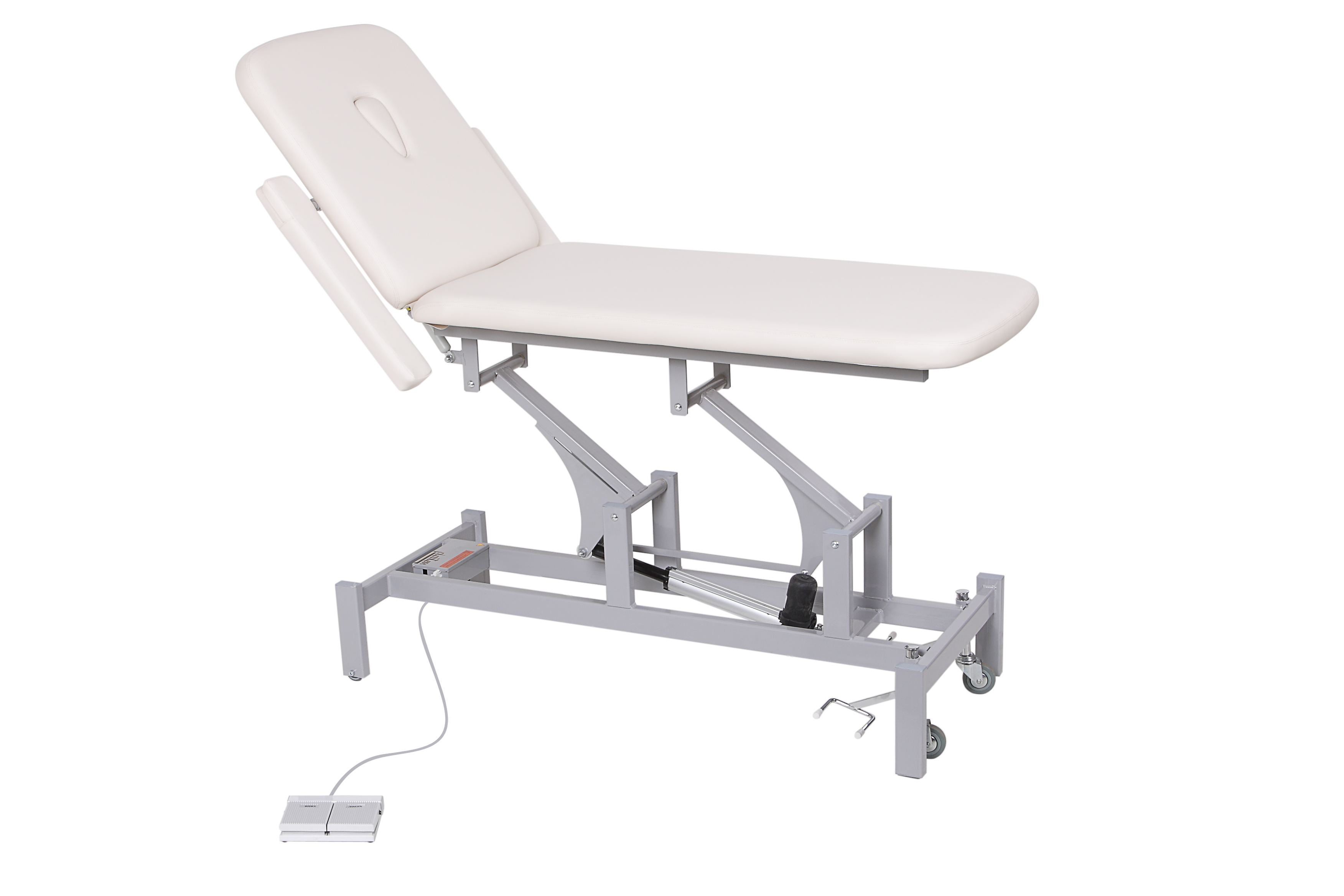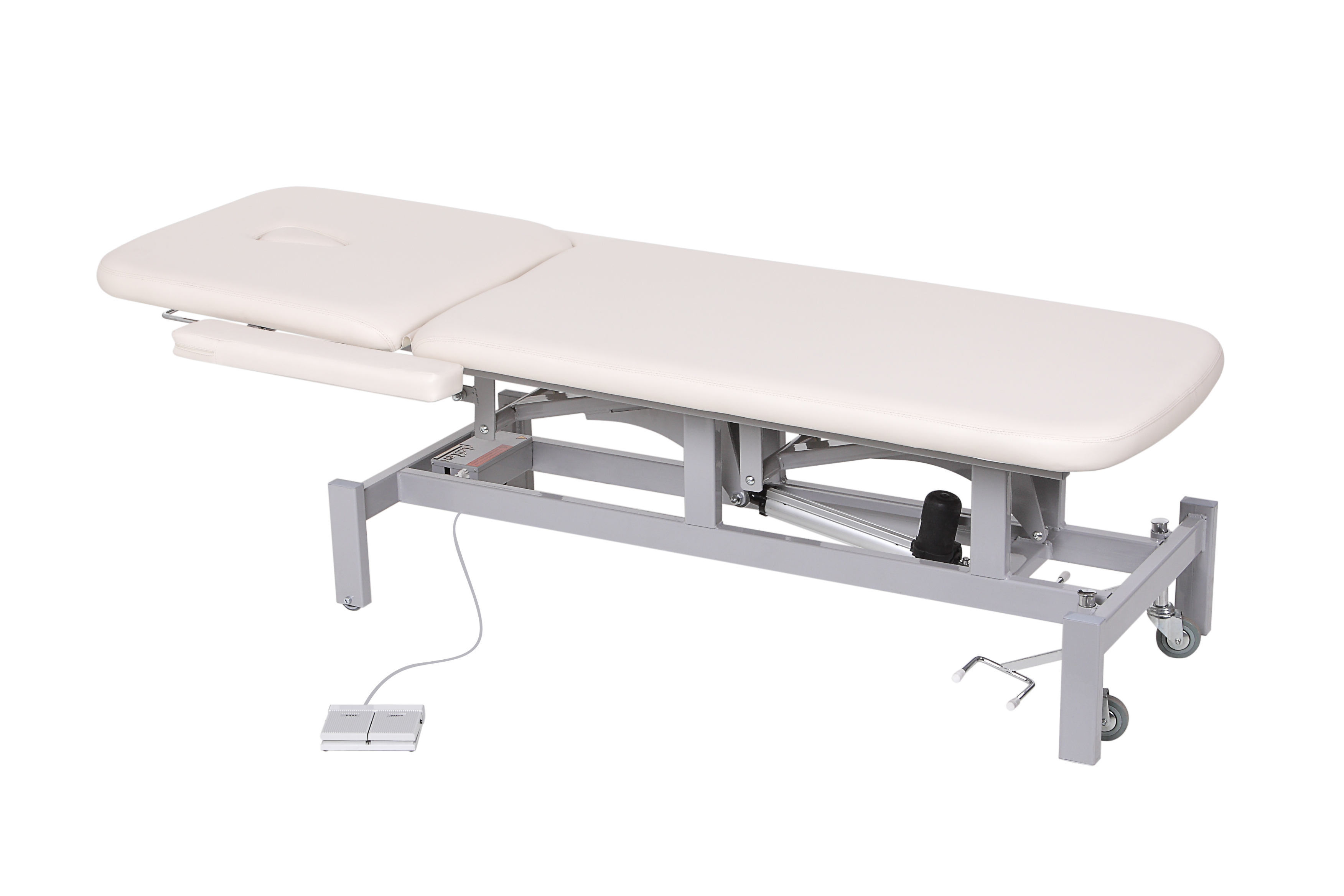 Длина-ширина-высота: 197×67×59 (107) см. Ширина с подлокотниками: 91 см. Максимальная равномерная нагрузка: 150 кг. Максимальная потребляемая мощность: 110 Вт. Вес изделия: 67 кг. Кушетка оснащена отверстием для лица, а также откидными подлокотниками. Регулировка высоты кушетки: электрическая (электропривод). Регулировка угла наклона спинки: до 60º, пневматическая (газлифт). Способ регулировки - ножная педаль управления. Для удобства перемещения кушетка оснащена колесиками. Для большей устойчивости при процедуре массажа, колесная пара поднимается и кушетка устойчиво становится на ножки. Основание кушетки покрашено порошковой краской (цвет по каталогу RAL). Кушетка оснащена одним электроприводом итальянского производства (Ciar S.p.A.), регулирующим высоту кушетки. Обивка выполнена из высококачественной экокожи, изготовленной в Германии (Konrad Hornschuch AG) — устойчивый к дезинфицирующим растворам износостойкий «дышащий» материал с широкой цветовой гаммой. Спинка регулируется при помощи газлифта немецкого производства (Stabilus GmbH).