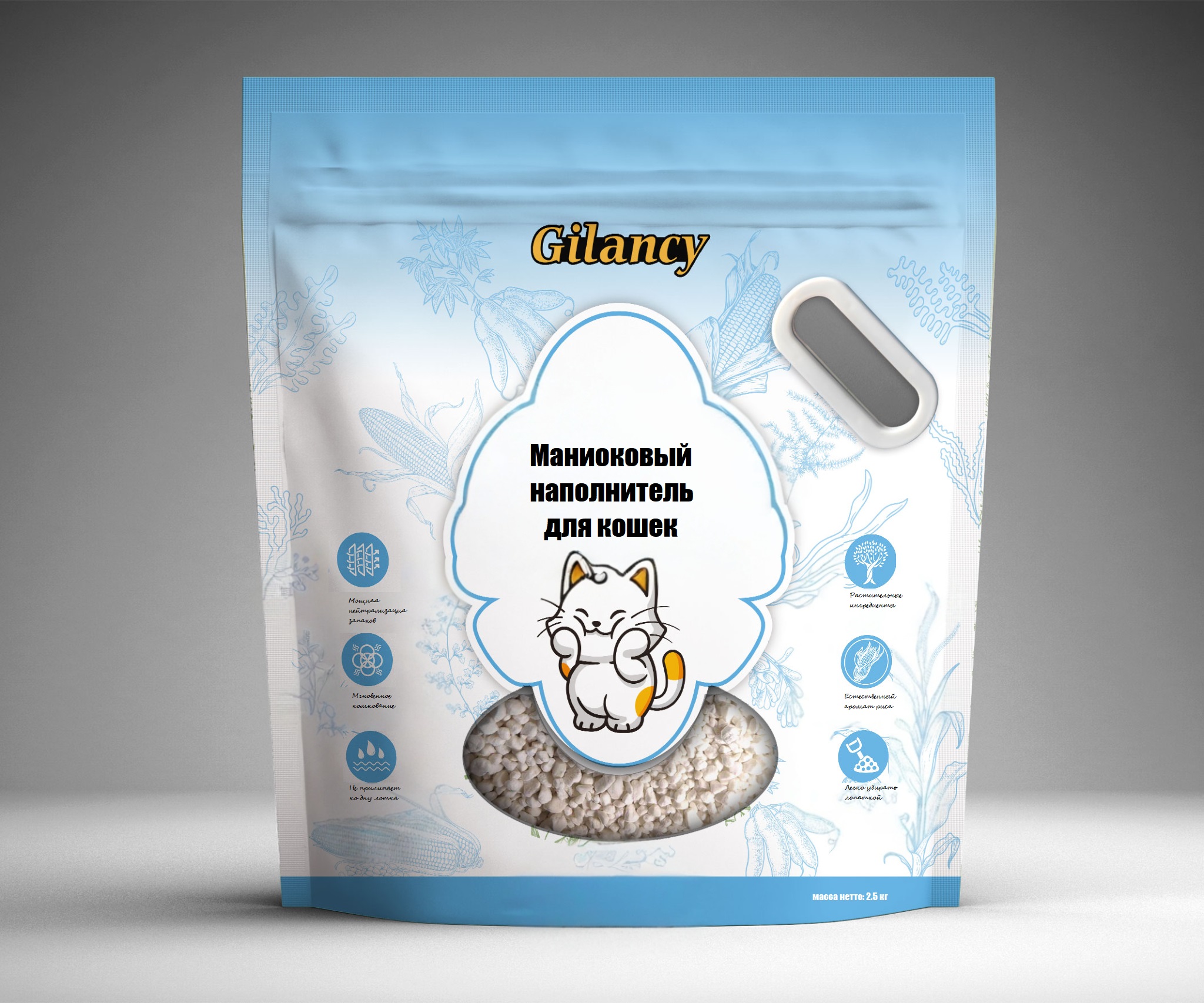 Маниоковый наполнитель Gilancy: инновационное решение для чистоты кошачьего лотка   Ключевые преимущества: Мгновенное комкование — формирует плотные комки за 3 секунды, предотвращая протечки. Высокая эффективность дезодорации — контроль запаха до 95%, благодаря сочетанию: пористой структуры натуральных крахмальных молекул; биоферментов; экстракта морских водорослей (двойной эффект дезодорации). Ультранизкая пыльность (±0,1%) — защищает дыхательную систему питомца и хозяина. Безопасность — формула без химических добавок, соответствует стандартам безопасности пищевого уровня. Биоразлагаемость — экологически чистый продукт, полностью разлагается. Состав: премиальный натуральный крахмал маниоки; кукурузный крахмал; биоферменты; экстракт морских водорослей. Особенности технологии: Пористая структура молекул крахмала обеспечивает превосходное поглощение запахов. Ультранизкая пыльность — специальная обработка гранул. Прочные, влагостойкие комки — надёжно удерживают отходы, не рассыпаются при уборке. Для кого подходит: кошки всех возрастов; питомцы с чувствительным дыханием (благодаря минимальному содержанию пыли); владельцы, заботящиеся об экологии (биоразлагаемый состав); люди, ценящие удобство и гигиену (быстрое комкование, эффективный контроль запаха). Дополнительные возможности: индивидуальный подбор ароматов; различные варианты упаковки; высокое качество, подтверждённое международными тестами безопасности.