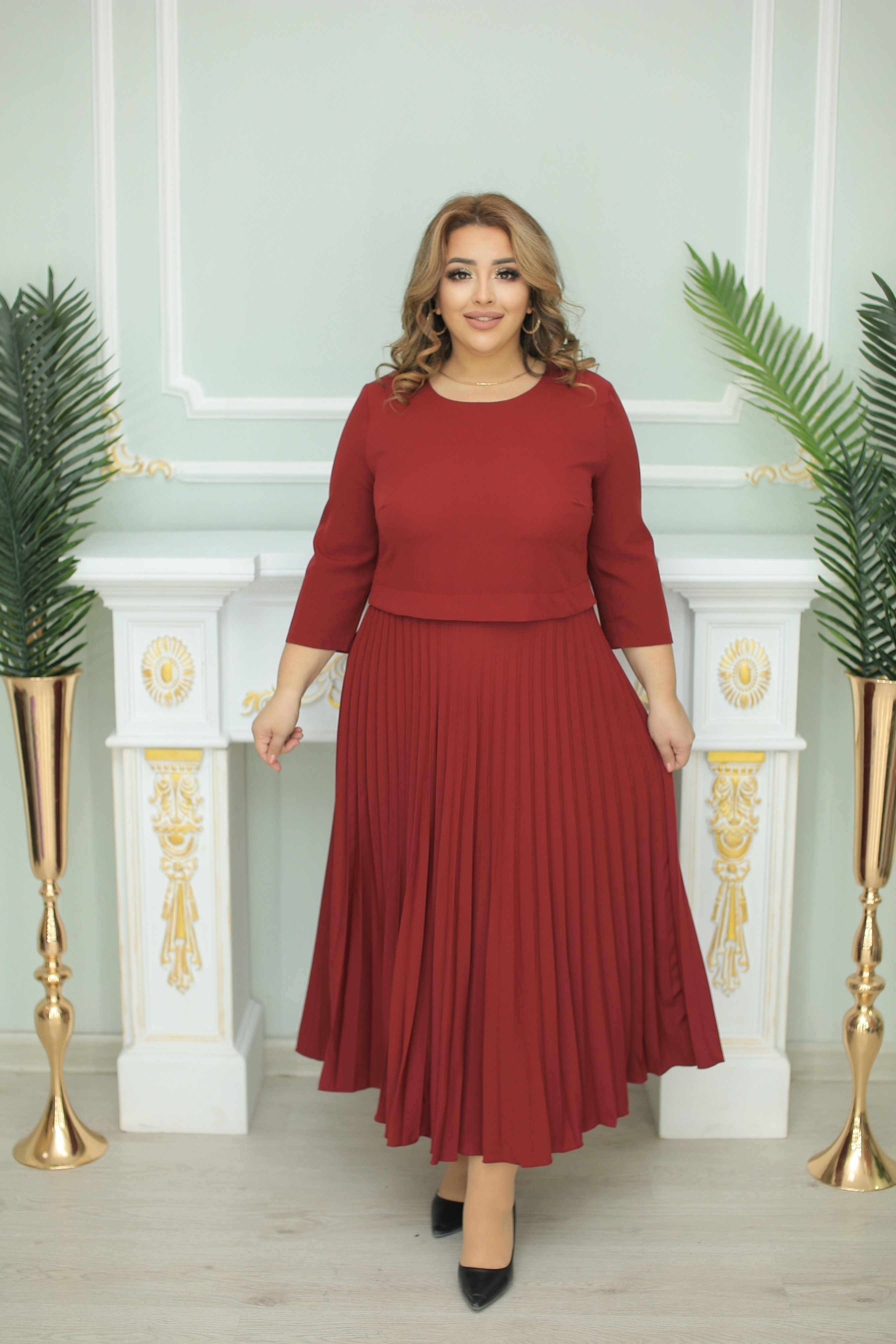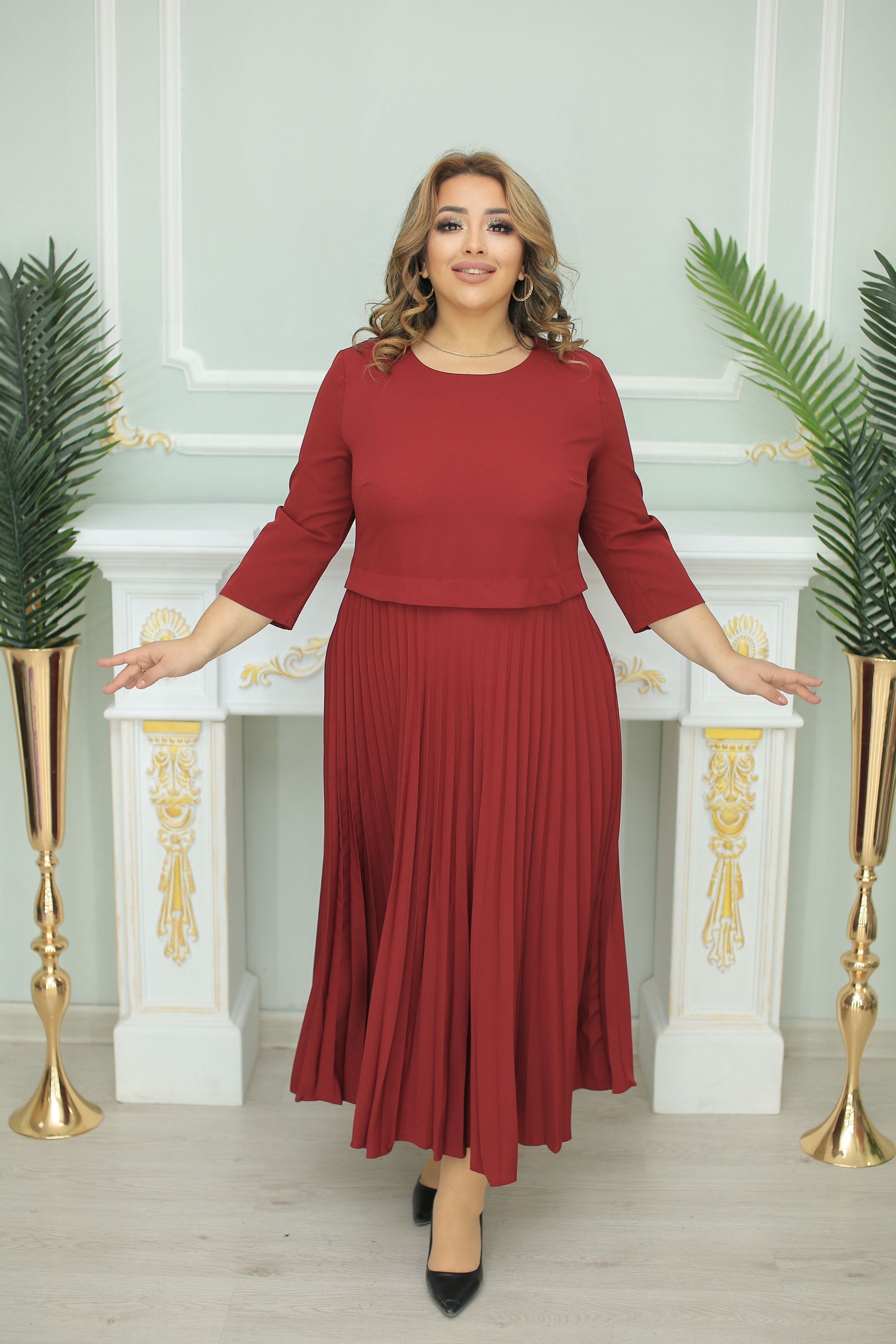 Women's dresses. Size range: 50-64. Color: maroon, burgundy, gray, orange, red.