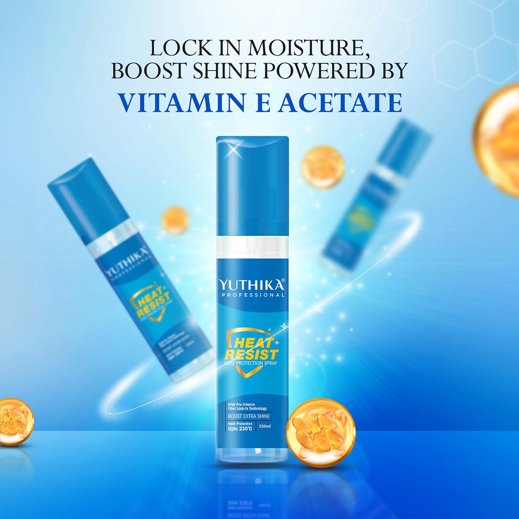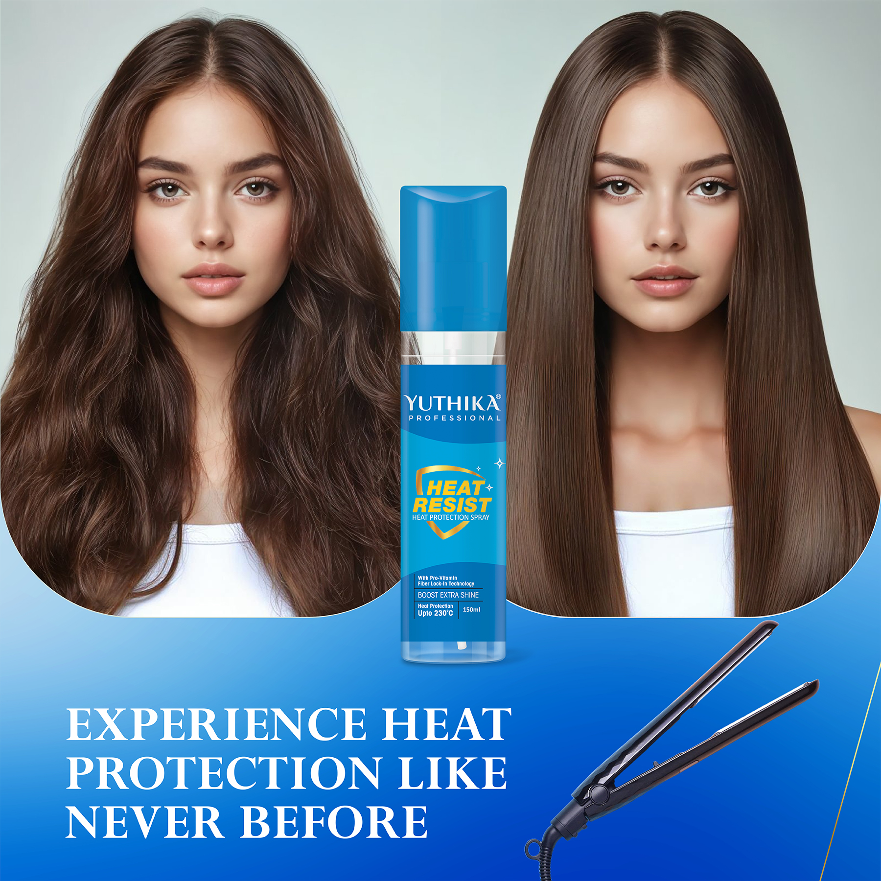 Yuthika Professional Heat Protection Spray 150ml With Pro-Vitamin B5 & Fiber | Heat Protection up to 230°C | Extra Shine Hair Spray Mist For Women & Men | Ideal For Styling, Curling & Straightening - 107881