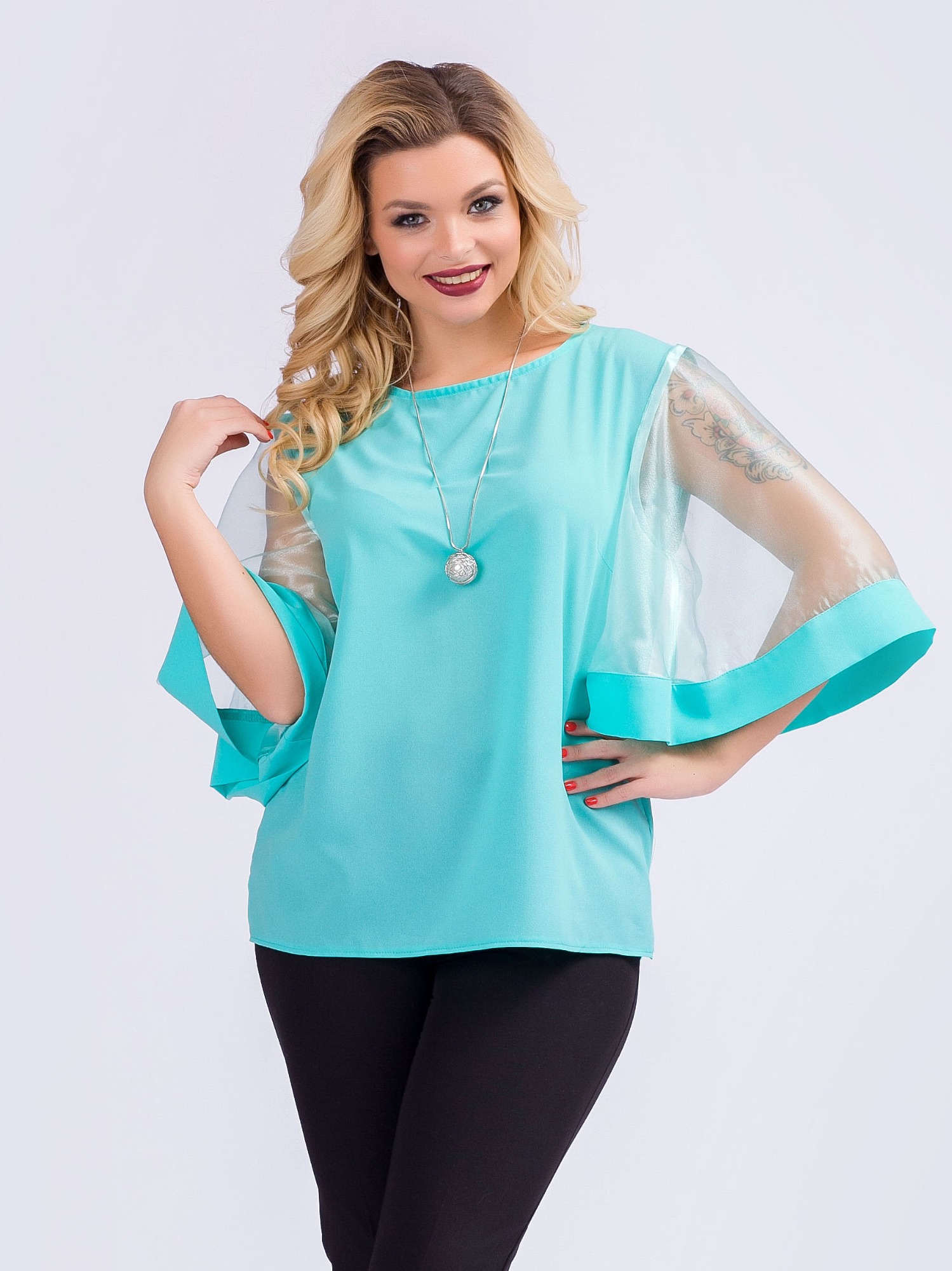 Оригинальная блуза полуприлегающего силуэта. Выполнена из однотонного крепа. Круглый вырез горловины обработан внутренней тонкой косой бейкой. Широкие втачные рукава длиной 37 см. выполены из огранзы и дополнены по низу широкой полосой из крепа. Вытачки обеспечат отличную посадку по фигуре. Низ прямой. В боковых швах аккуратные разрезы.