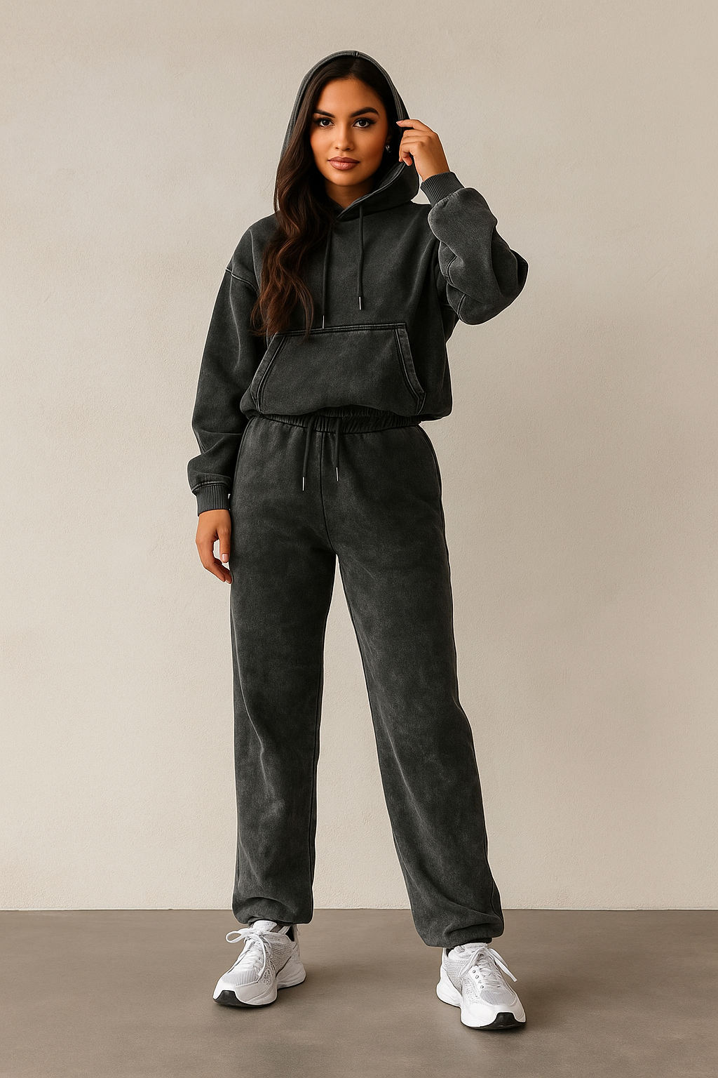 Женский спортивный костюм в стиле городской эстетики.Элегантный комплект в стиле премиум casual для современного ритма жизни. Свободное худи с капюшоном и прямые брюки из мягкого трикотажа с эффектом washed denim создают безупречный баланс комфорта и стиля. Худи оснащено вместительным карманом-кенгуру и регулируемым капюшоном с премиальной фурнитурой. Брюки с высокой посадкой и эластичным поясом на шнурке подчёркивают лёгкость и свободу движений.Идеальный выбор для городских прогулок, путешествий и активного отдыха — там, где стиль имеет значение. ✅ Материал: натуральный хлопок с добавлением полиэстера для мягкости и износостойкости✅ Посадка: свободная, с продуманной конструкцией для абсолютного комфорта✅ Размеры: 42–52✅ Цвет: графитовый washed