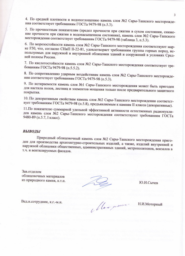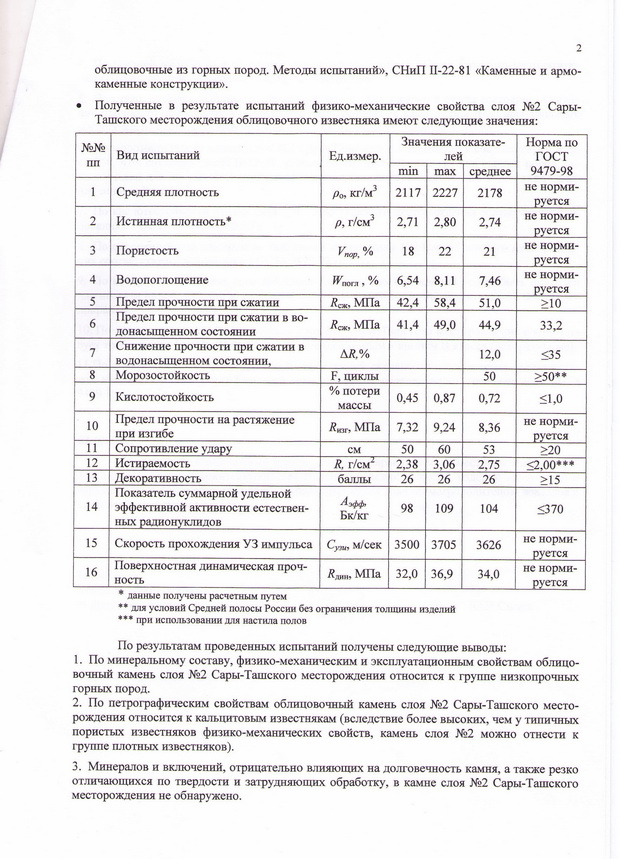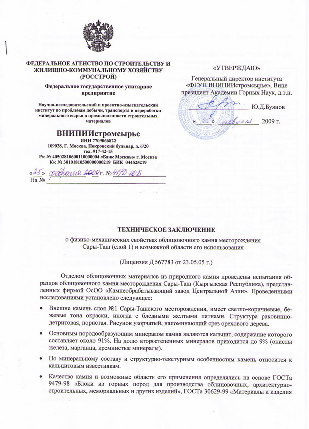 Согласно технического заключения, выданного Научно-исследовательским и проектно-изыскательским институтом Федерального агентства по строительству и жилищно-коммунальному хозяйству Российской Федерации (РОССТРОЙ) 25.02.2009 года за №40/Д-10Б и №41/Д-10Б, природный облицовочный камень месторождения «Сары-Таш» пригоден для производства архитектурно-строительных изделий, а также изделий для внутренней и наружной отделки общественных, административных зданий, жилых комплексов и коттеджей, а также метрополитенов, вокзалов и других сооружений, в том числе и вентилируемых фасадов.