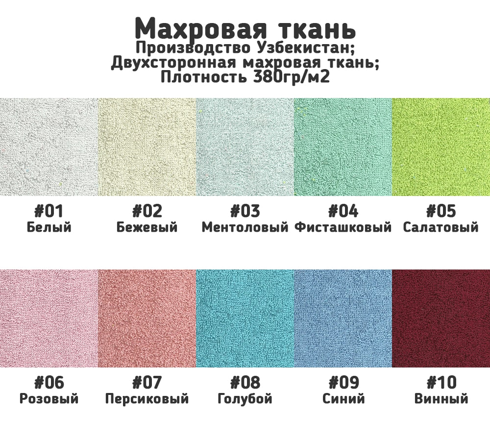 Двухсторонняя махровая ткань, 100% хлопок; Ширина 215см; Страна Узбекистан; Поверхностная плотность 380гр/м2; Рулон от 20 до 30 кг, отгрузка от 1 рулона; Цена указана за 1 кг; 10 расцветок, цвета по палитре.