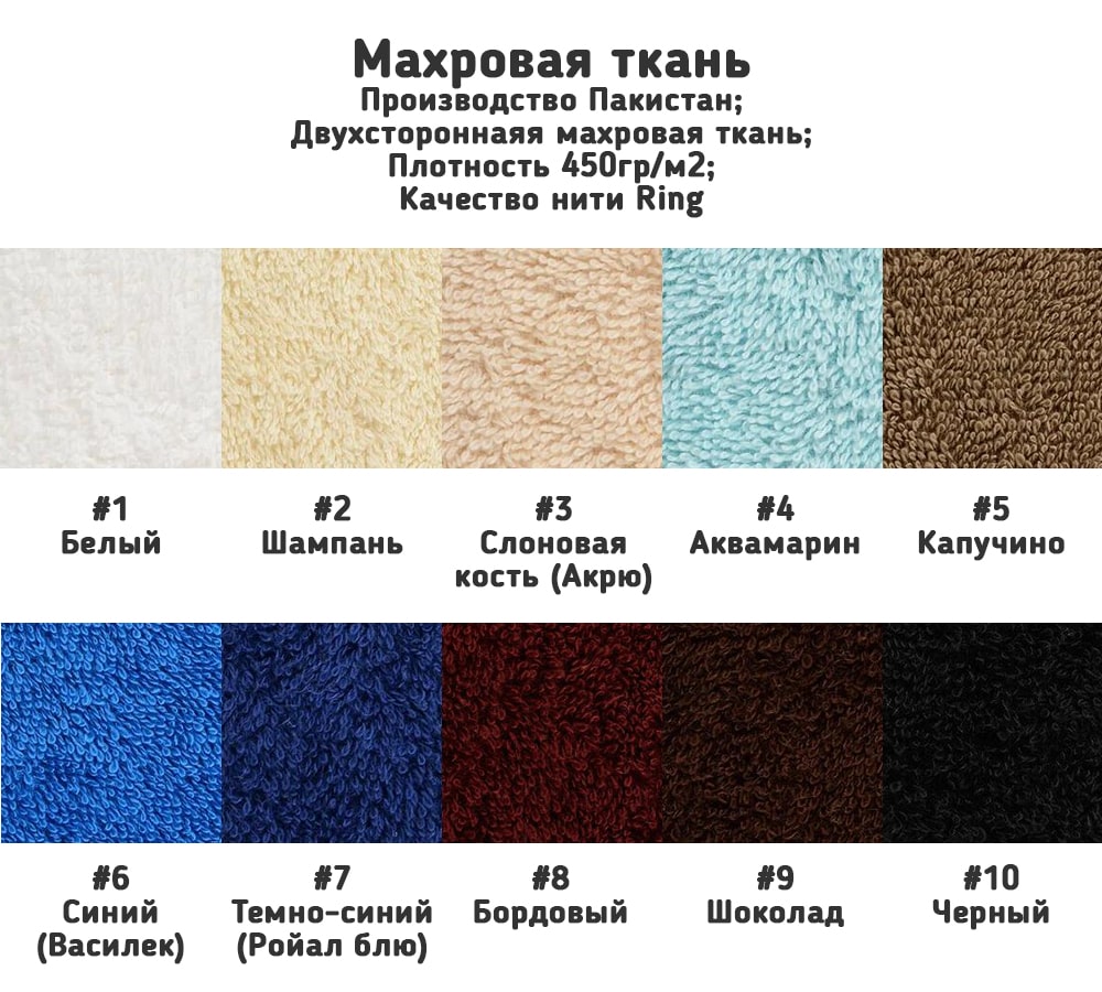 Двухсторонняя махровая ткань, 100% хлопок; Ширина 220см; Плотность 450гр/м2; Страна Пакистан; Качество нити Ring; Рулон от 33 до 50 кг, отгрузка от 1 рулона; Цена указана за 1 кг; 10 расцветок, цвета по палитре.