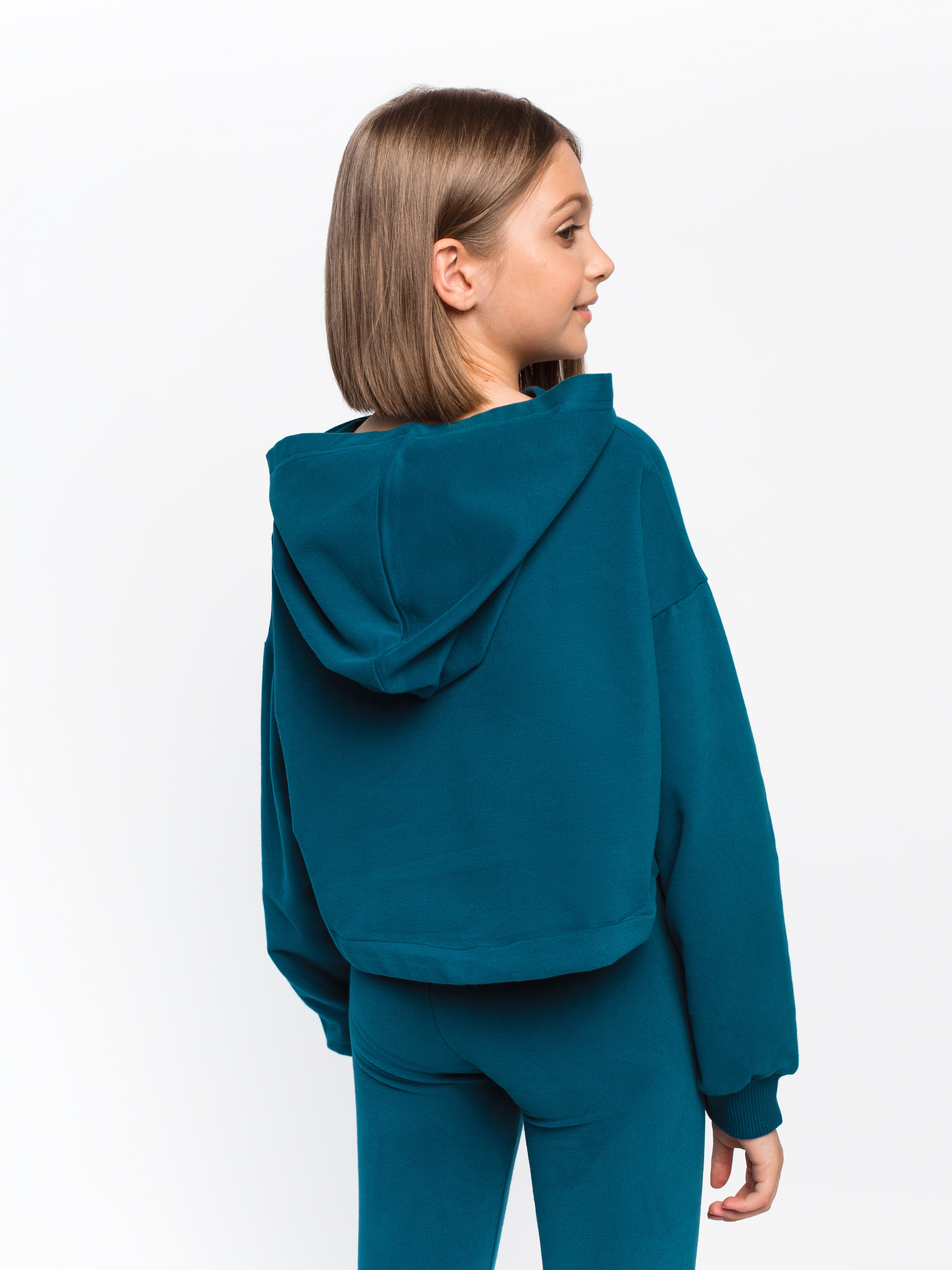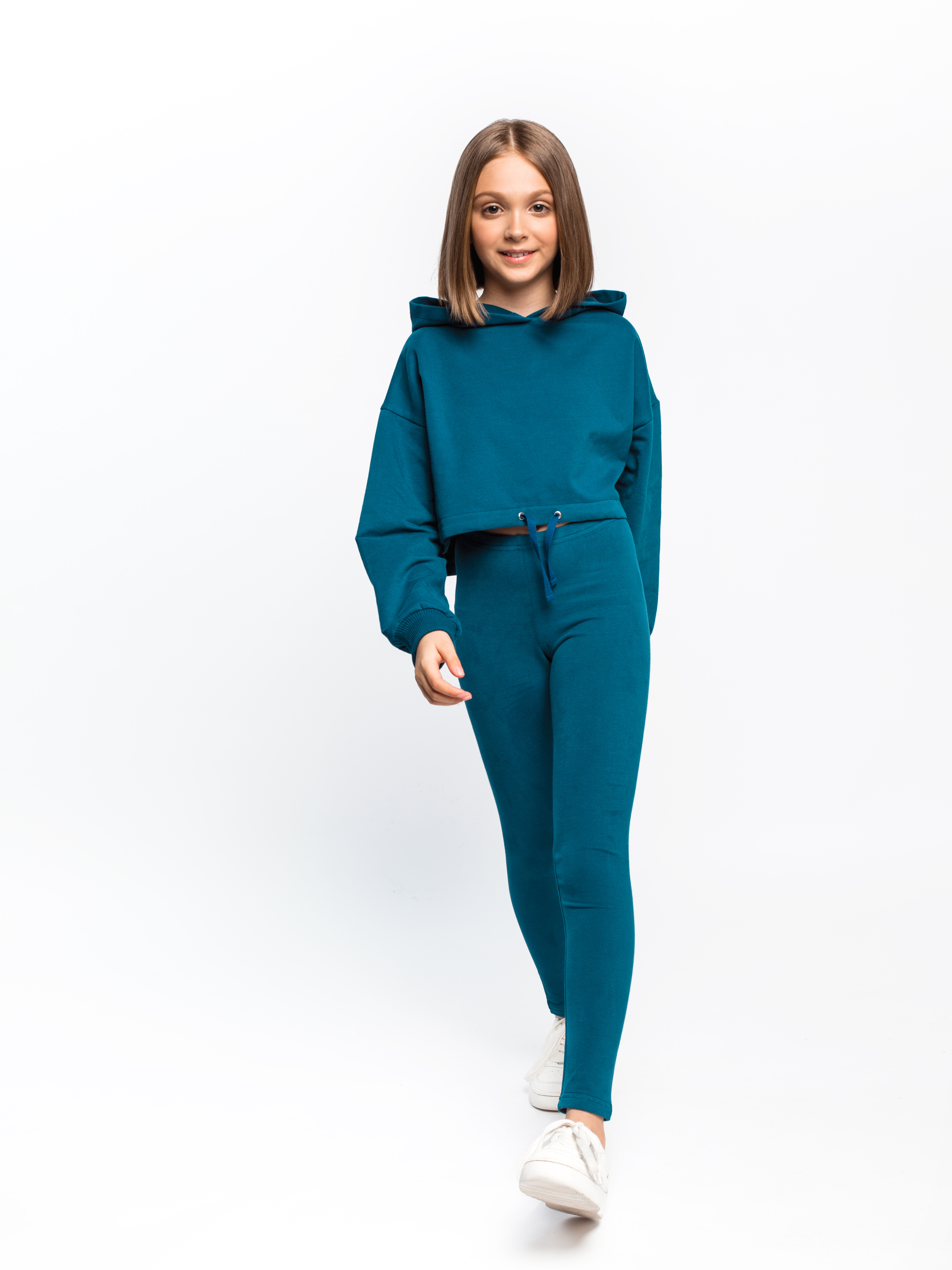 Спортивный трикотажный костюм для девочки из футера: худи (свитшот) с капюшоном и леггинсы. Худи укороченный, оверсайз, объёмный. Худи с длинным рукавом, рукав спущенный с манжетом. Леггинсы (лосины) плотные, не просвечивают, облегающие, сохраняют форму, не вытягиваются.