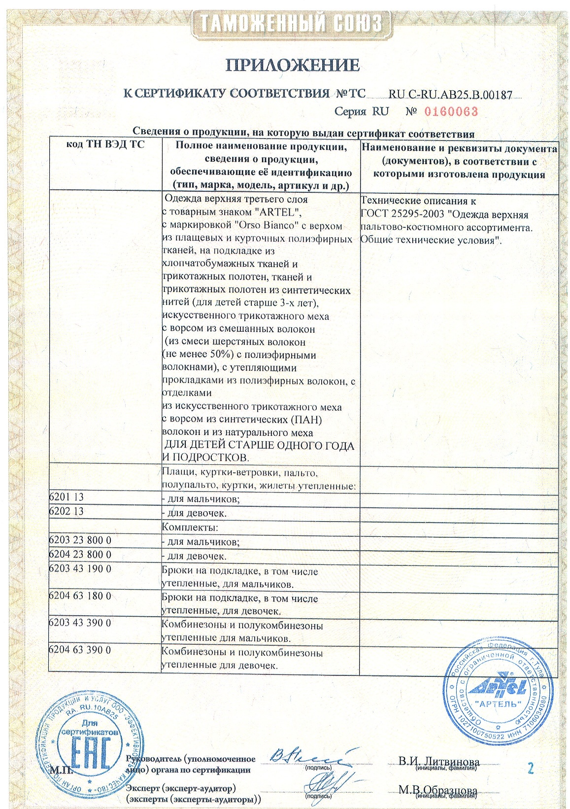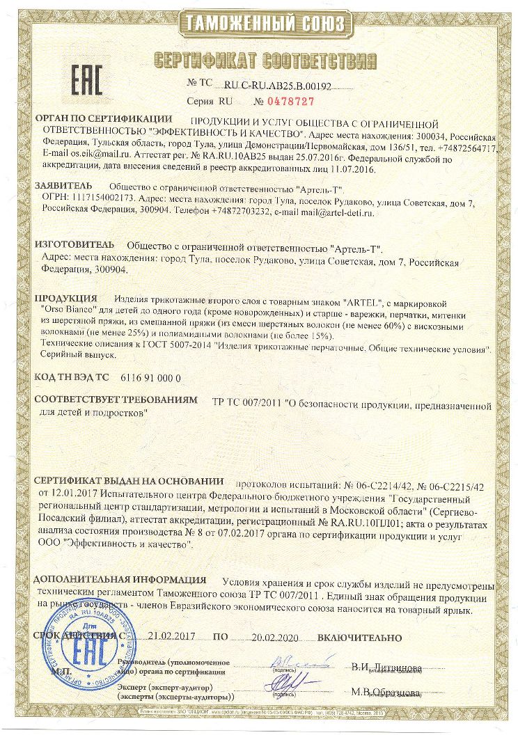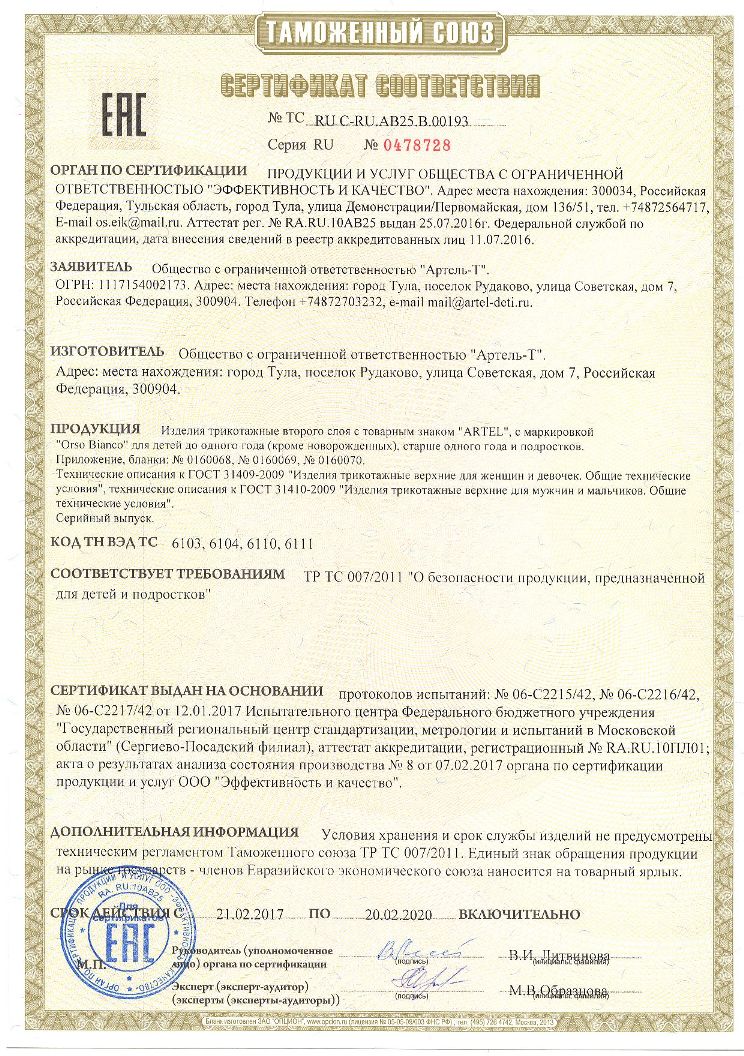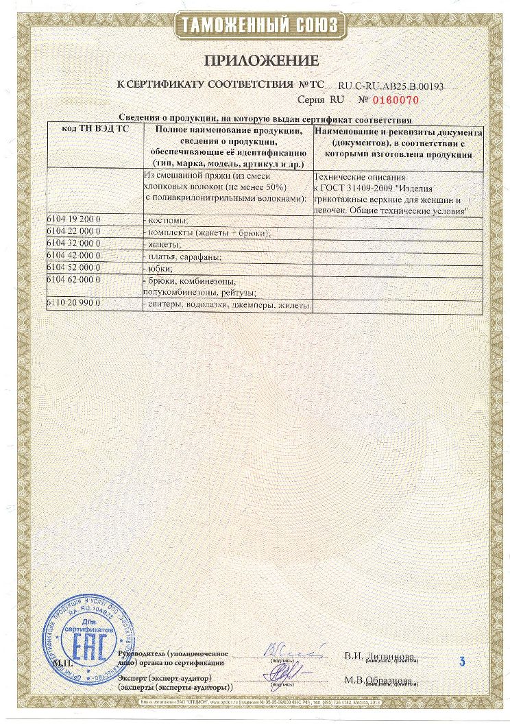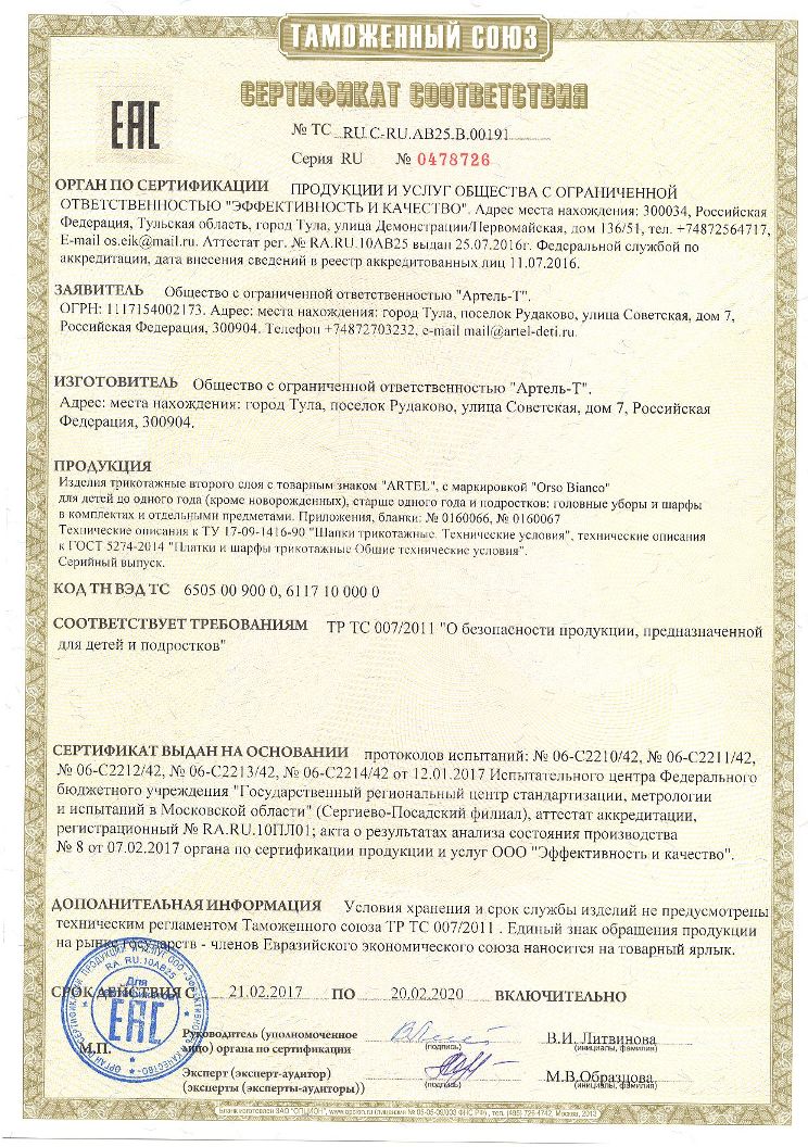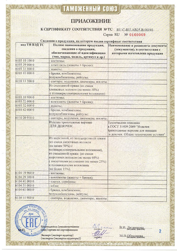 Список товаров: шапки, комплекты, варежки; комбинезоны, ветровки; комбинезоны-трансформеры, головные уборы; полукомбинезоны, краги; куртки, пальто, жилетки; брюки и др. виды детской верхней одежды и вязаного трикотажа.