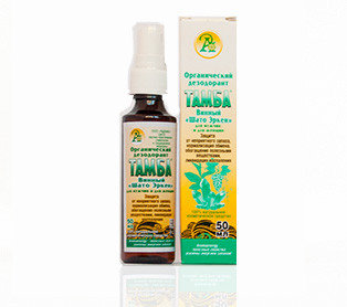 ТАМБА дезодорант для женщин Свежесть, защита от неприятного запаха, нормализация обмена, увлажнение, ликвидация воспаления. Действие обусловлено специфическими свойствами  квасцового камня, лечебной грязи о. «Тамбукан», минеральных вод, растений, эфирных масел,  витаминов, использованием гомеопатической технологией приготовления, подбором компонентов с учётом их индивидуального воздействия. Состав: вода и экстракт Тамбуканской иловой грязи Алунит, (квасцовый камень, квасцы – алюмокалиевые). Экстракты: Мяты перечной (травы). Розмарина аптечного (листа)  Зелёного чая (листа) 100% натуральные эссенциальные (эфирные)  масла Герани, Лемонграсса, Лаванды и Мяты. Лечебная грязь озера Тамбукан -иловая грязь (пелоиды), являясь продуктом жизнедеятельности различных бактерий, рачков и сине-зеленых водорослей озера, содержат широкий спектр полезных компонентов: макро - и микроэлементы, антиоксиданты, биогенные стимуляторы и фенолокислоты липидный комплекс. Пелоиды. как и большинство природных лечебных факторов, обладают иммуномодулирующим действием нормализуется продукции антител, задерживается развитие аллергических реакций немедленного и замедленного типа нормализуются показатели неспецифического иммунитета. Ценным терапевтическим действием пелоидотерапии является нормализация микроциркуляции, как в очаге воспаления, так и во всех тканях организма Восстанавливается проницаемость капилляров, уменьшается отечность тканей, исчезает неравномерность просеем сосудов, уменьшается внутрисосудистый стаз и микроагрегация форменных элементов крови. Восстановление микроциркуляции благоприятно влияет на местный воспалительный процесс: происходит рассасывание патологических продуктов воспаления, улучшается снабжение тканей энергетическими и пластическими веществами, что способствует восстановлению разрушенных структур. Противовоспалительное действие грязи в большей степени проявляется на стадии пролиферации (увеличение числа клеток вследствие их размножения) и обратно: и развития воспалительного процесса. В целом лечебные факторы грязи способствует нормализации измененных болезные окислительно-восстановительных процессов и стабилизации мембранных структур, благоприятно влияют на процессы регенерации тканей. Улучшая трофику тканей, грязь способствуют размягчению рубцов, рассасыванию спаек стимуляции процессов регенерации. Оказывает мощное витализирующее действие на клетки  кожи головы и волосы, повышает их иммунокорректирующие. антиоксидантные, противовоспалительные и антибактериальные свойства. Активизирует кровообращения кожи головы. За счёт этого улучшается питание волос, они получают больше питательных веществ, быстрее растут и наполняются жизненной силой. Алунит (квасцовый камень, квасцы – алюмокалиевые): Избирательно подавляет развитие и рост бактерий ответственных за неприятный запах, помогает нормализовать состояние проблемной кожи, используется после бритья для предупреждая раздражение кожи, останавливает мелкие кровотечения (при порезах) и способствует заживлению ран, применяется наружно в растворах для полоскания, промывания и спринцевания, при воспалительных процессах кожи и слизистых оболочек, эффективно применяется для борьбы с перхотью, молочнице, герпесом пародонтозо