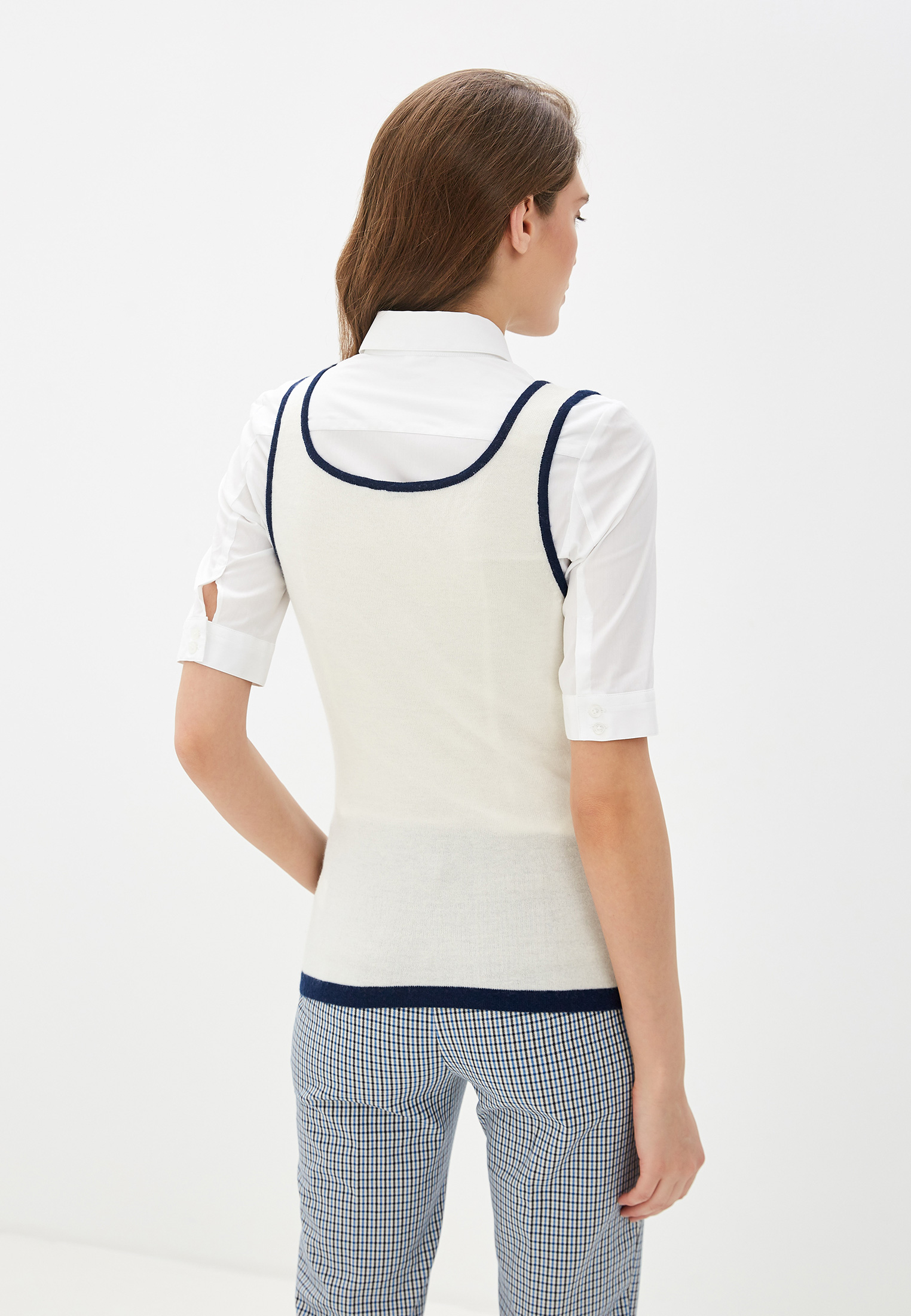 Эта искусно выполненная безрукавка с закругленной горловиной, идеально подходит для носки поверх сорочки. Позволит обладательнице выглядеть безупречно и свежо в офисе и на прогулке.