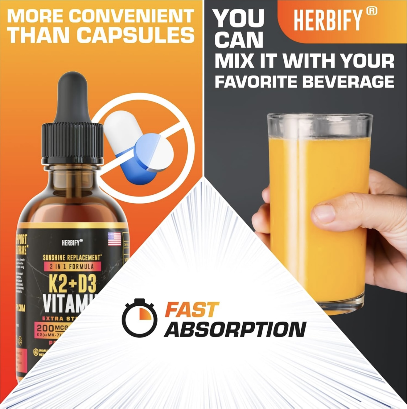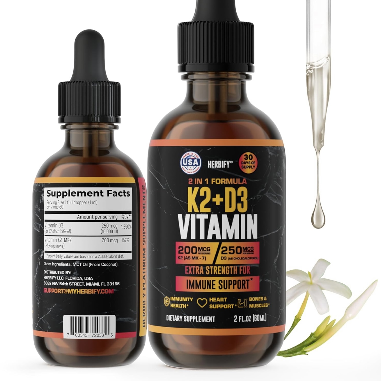Жидкие капли D3 K2 для мужчин и женщин – это добавки для укрепления костей и зубов для всей вашей семьи. Прием витаминной добавки K2 D3 предотвращает новые переломы костей и повышает прочность костей.  Витамин K2 D3 помогает поддерживать здоровье сердца и эластичность кровеносных сосудов, что, как сообщается, способствует улучшению кровообращения, поскольку здоровая кровь является ключом к общему хорошему самочувствию. Витамины и пищевые добавки K2 также известны как витамины для сердца.  Добавки с витамином D помогают вашему организму усваивать кальций и фосфор, обеспечивая поддержку иммунитета. Эти сладкие капли представляют собой жирорастворимые витамины и добавки для поддержания иммунитета, которые могут модулировать врожденные и адаптивные иммунные реакции.  Добавки с витамином К2 и жидкие капли D3 также способствуют повышению настроения и наполняют организм природной энергией на весь день. Жидкий витамин D3 с К2 также называют энергетическими витаминами – это пищевые добавки для женщин и мужчин, которые стимулируют энергию и обмен веществ.