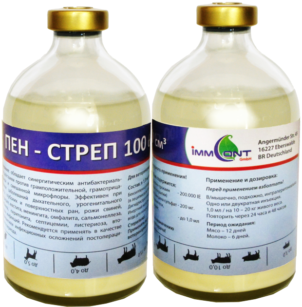 ОбЩИЕ СВЕДЕНИЯВ 1 мл. препарата, в качестве действующего вещества содержится: 50 мг. энрофлоксацина.Вспомогательные вещества: пропиленгликоль-50 мг, гидроксид калия-10 мг, бензиловый спирт-10 мг, метилпарабен-1 мг, вода для инъекций до 1 мл. ФАРАМКОЛОГИЧЕСКИЕ СВОЙСТВАКомбинация бензилпенициллин-прокаина и дигидрострептомицин сульфата обла¬дает синергидным действием, что обеспечивает широкий спектр антимикробного действия против грамположительных и грамотрицательных микроорганизмов (Staphylococcus spp., (3- гемолитические стрептококки, Corynebacterium spp., Erysipelothrix, Actinobacillus spp., Pasteurella spp. и др.), включая резистентные к пенициллину штаммы.Бензил пенициллина прокаиновая соль - антибиотик из группы пенициллинов дли-тельного действия. Обладает узким спектром действия, с преимущественным влиянием на грамположительные микроорган измы. К пенициллину чувствительны: стрептококки, стафилококки, пневмококки, диплокок¬ки, спирохеты. В терапевтической дозе действую!' на микробную клетку бактериостатически. Дигидрострептомицина сульфат являются антибиотиком аминогликозидной группы. Механизм действия связан с нарушением синтеза белка на уровне рибосом. Активен в отно¬шении большинства грамположительных и грам отрицательных микроорганизмов, в том чис¬ле резистентных к другим антибиотикам (пенициллину, левомицетину, тетрациклину).При парентеральном введении бензилпенициллин и дигидрострептомицин быстро резорбцируются и пик концентрации антибиотиков к плазме крови достигается в течение 1 часа. Присутствие в составе бензилпенициллин-прокаина обеспечивает пролонгированный терапевтический эффект в течение 24 часов. Антибиотики выводятся из организма преимущественно с мочой. маститах, роже свиней, клостридиозе, с целью предотвращения вторичных бактериальных инфекций, в том числе в послеоперационный период. Пен-стреп вводят всем видам животных внутримышечно, подкожно или виутри- брюшинно из расчета: 1,0 мл на 10-20 кг массы тела животного 1 раз;в день через 24 ч и 4В ч. При необходимости лечение необходимо продолжить до полного выздоровления. Если в течение 3 дней не наблюдается клинического улучшения, рекомендуется повторно провести проверку на чувствительность микроорганизмов к пенициллину и дигидрострептомицину.ПОРЯДОК ПРИМЕНЕНИЯ ПРЕПАРАТАПен-стреп применяют крупному рогатому скоту, мелкому рогатому скоту, лоша¬дям, свиньям, собакам и кошкам при инфекциях дыхательных, путей (пневмония, бронхит, трахеит), желудочно-кишечного тракта (энтерит, перитонит, сальмонеллёз, диарея), мочепо¬ловой системы (циститы, метриты), инфекционных заболеваний кожи и мягкий тканей (раны, абсцессы, инфекции копыт, гнойное воспаление суставов, пупочный сепсис), мыте лошадей.Перед применением необходимо встряхнуть флакон до получения однородной суспен¬зии. В случае если препарат требуется вводить в больших объемах, общая доза делится из расчета 15 мл для лошадей, 6 мл для крупного рогатого скота, 3 мл для мелкого рогатого скота и 1,5 мл для свиней на каждое место введение. При применении препарата возможны аллергические реакции, нейромышечная блокада, возникновение вестибуло- и нефротоксических реакций. У кормящих свиноматок и свиней на откорме может наблюдаться саливация, рвота, нарушение координации движений, общее недомогание.МЕРЫ ЛИЧНОЙ ПРОФИЛАКТИКИПри работе с пре