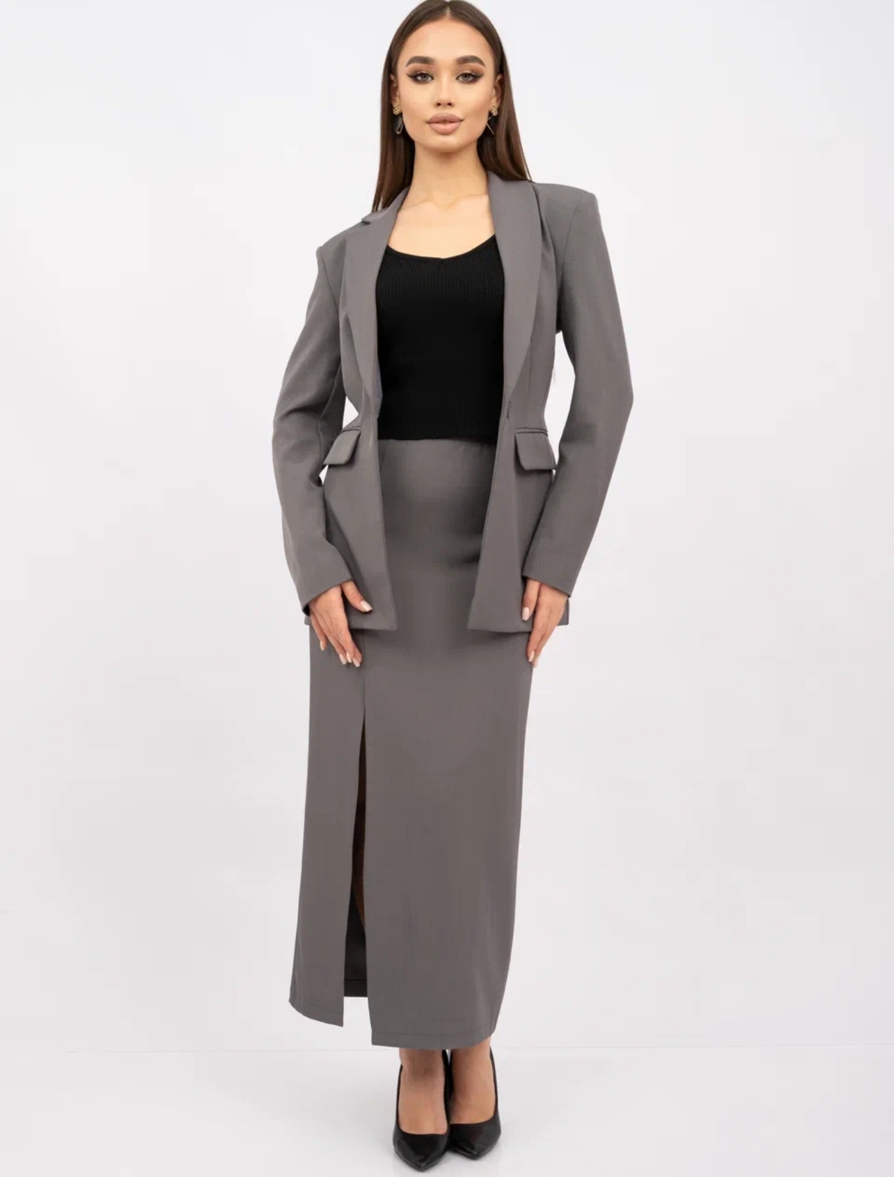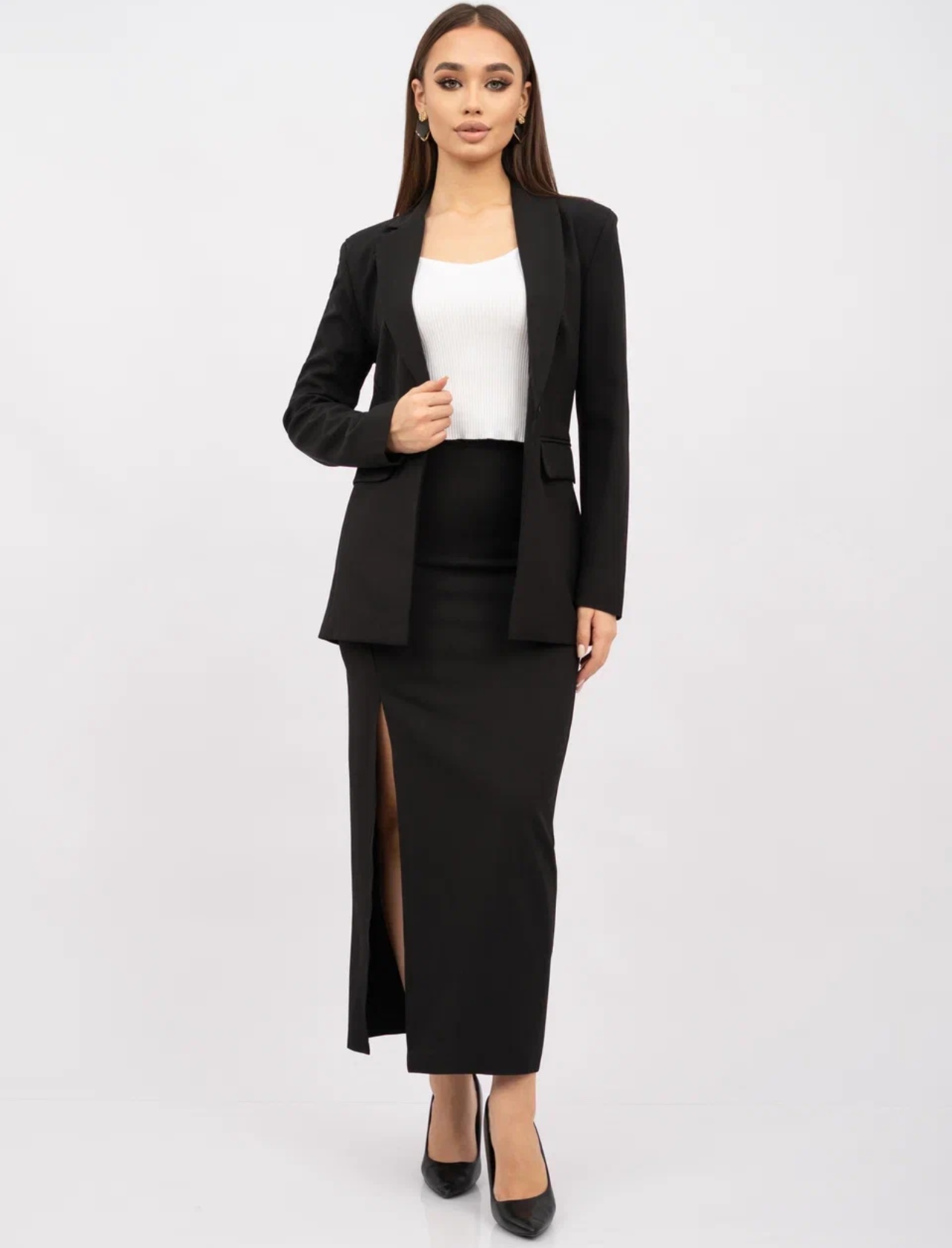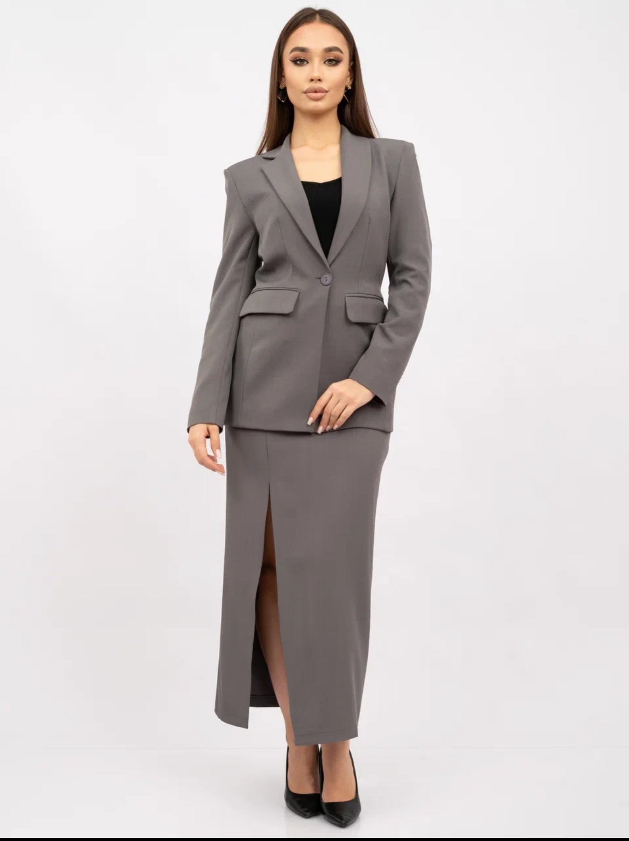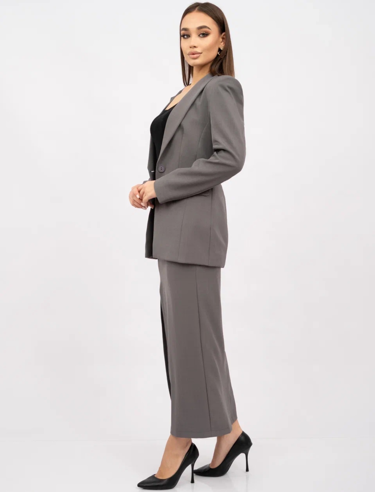 Женский классический костюм-двойка состоит из приталенного пиджака и длинной юбки с разрезом. Главная изюминка костюма – асимметричный воротник. Одна сторона выполнена в виде классического отложного воротника, другая – в форме шальки.