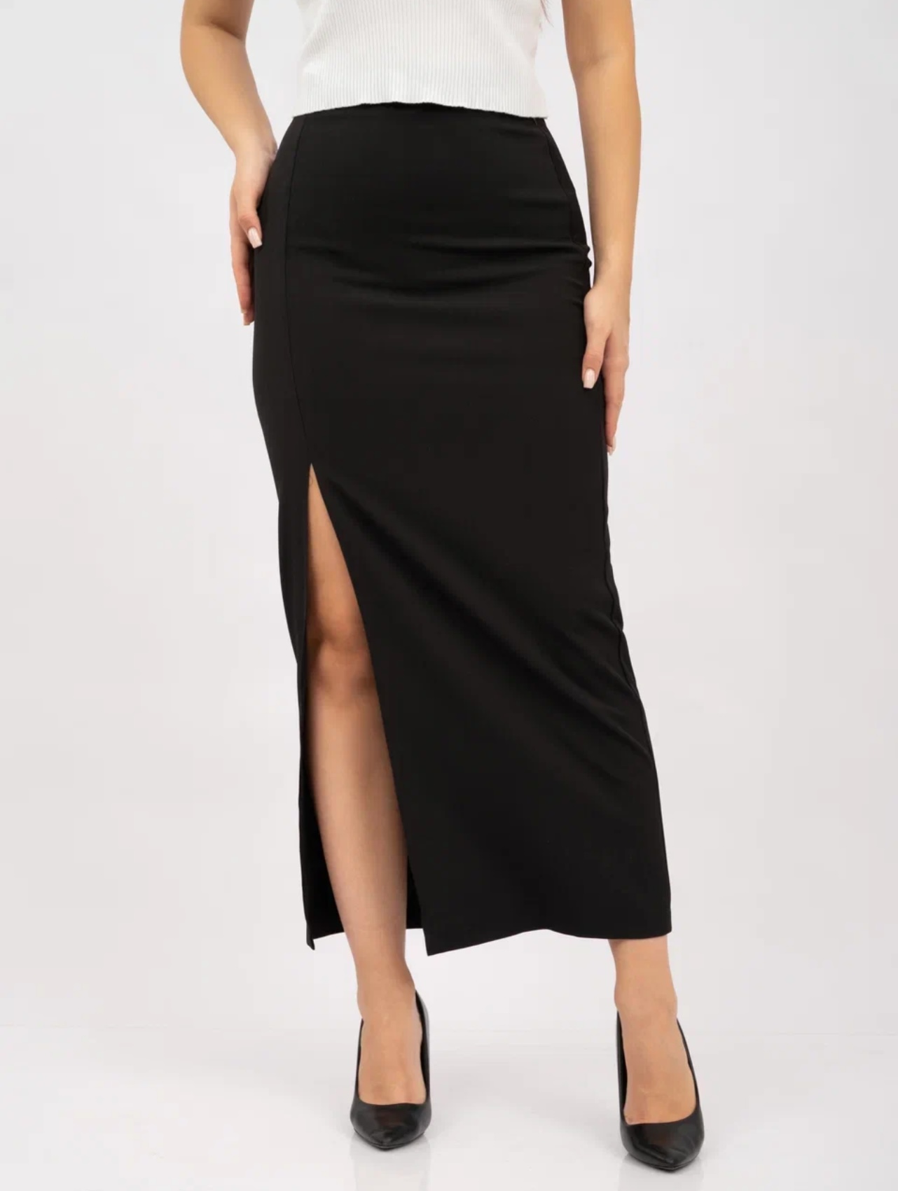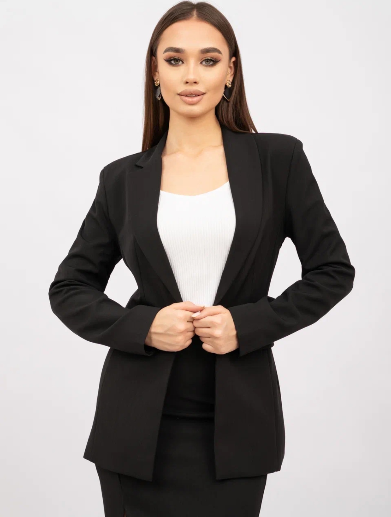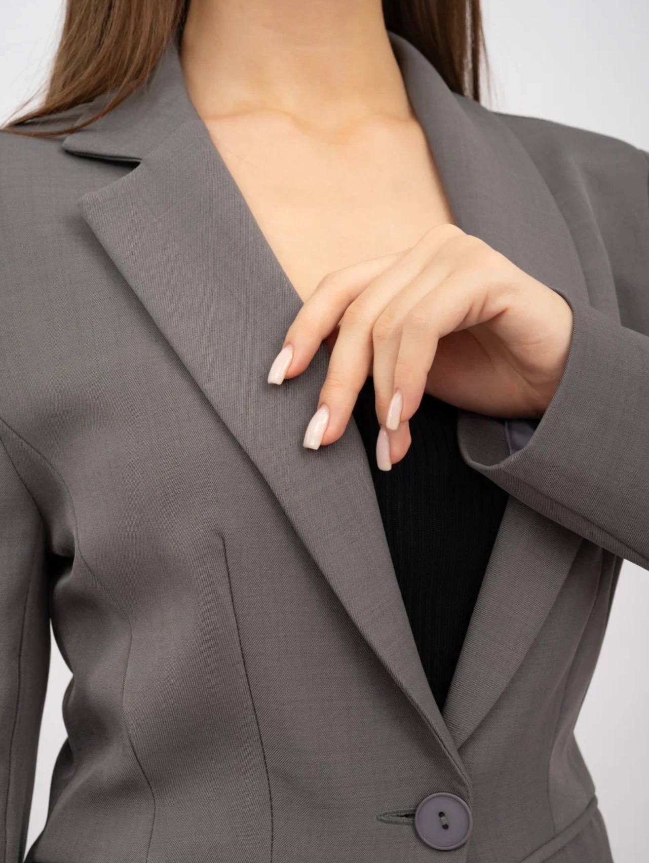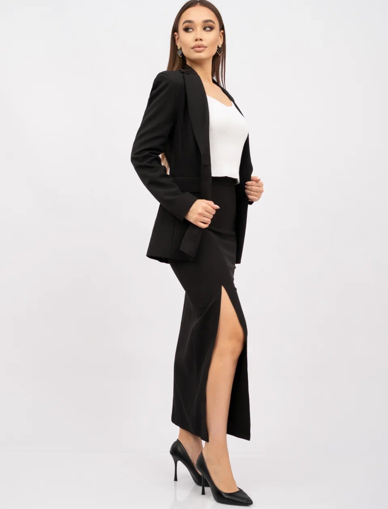 Женский классический костюм-двойка состоит из приталенного пиджака и длинной юбки с разрезом. Главная изюминка костюма – асимметричный воротник. Одна сторона выполнена в виде классического отложного воротника, другая – в форме шальки.