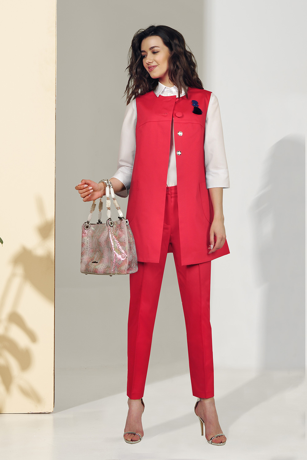 Одно из важных достоинство удлиненного жилета — это то, что он вытягивает фигуру и стройнит любой силуэт. Комплект женский состоит из Жилета и Брюк.Жилет( на подкладке)длиной по спинке 78 см.Брюки(с карманами)Длина 92 см .Изготовлен комплект из хлопчатобумажной ткани.Состав:Х/б 97%, эластан 3%.Подкладка ПЭ 100%.Брошь входит в комплект (вид может меняться).Изделие подойдет на рост 164-170.