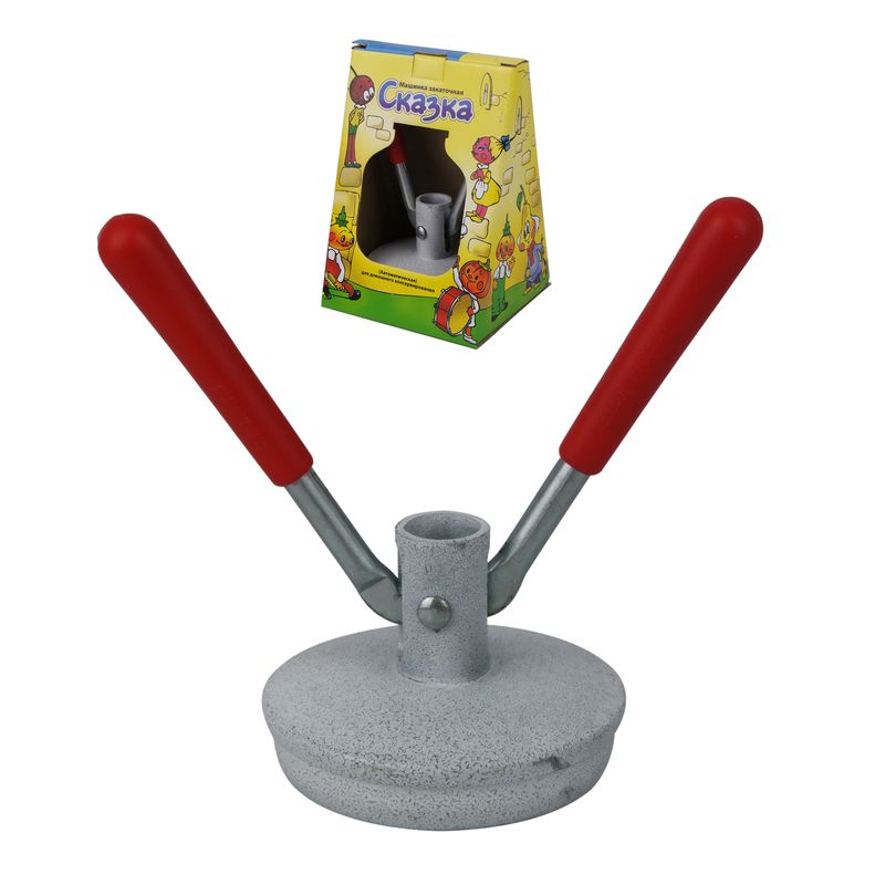 Машинка закаточная Сказка автомат - машинка обжимного действия, используется для укупорки стеклянных банок с размером горловины 82 мм. жестяными крышками СКО 82 посредством обжима при домашнем консервировании. Из всех машинок для закатывания банок многочисленные отзывы выделяют именно автомат. Принцип работы его весьма прост, без особенных усилий справиться с укупориванием сможет даже ребенок, ведь сил прикладывать практически не нужно. Крышка из металла надевается на стеклянную тару, сверху прижимается приспособлением для закатки. Машинка закаточная Сказка автомат оснащена двумя рычагами, на которые необходимо нажимать одновременно. Все, банка надежно укупорена. Можно повторить действия, провернув немного прибор, это гарантирует, что емкость герметично закрыта и содержимое (салат, маринад или варенье) сохранятся длительное время.