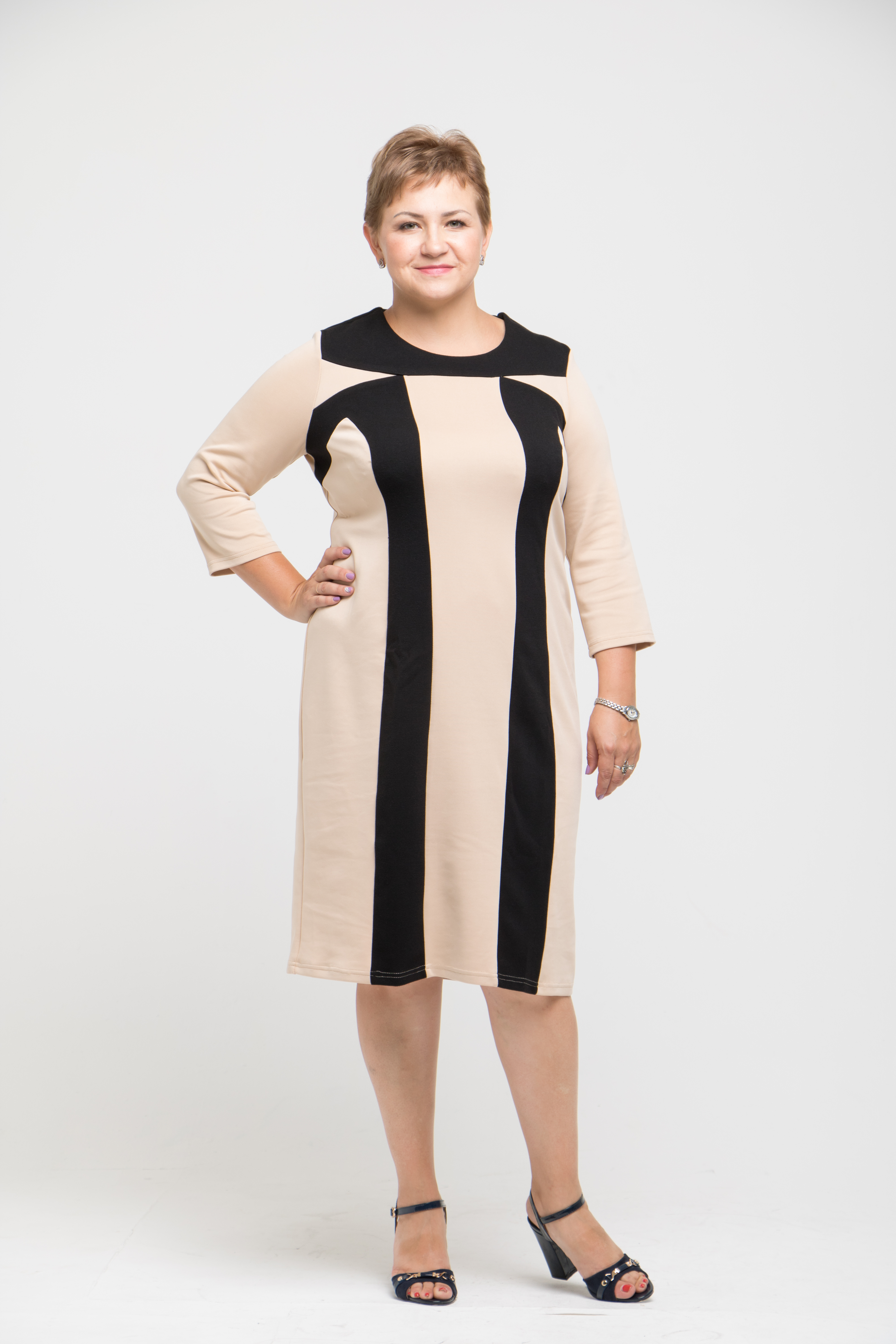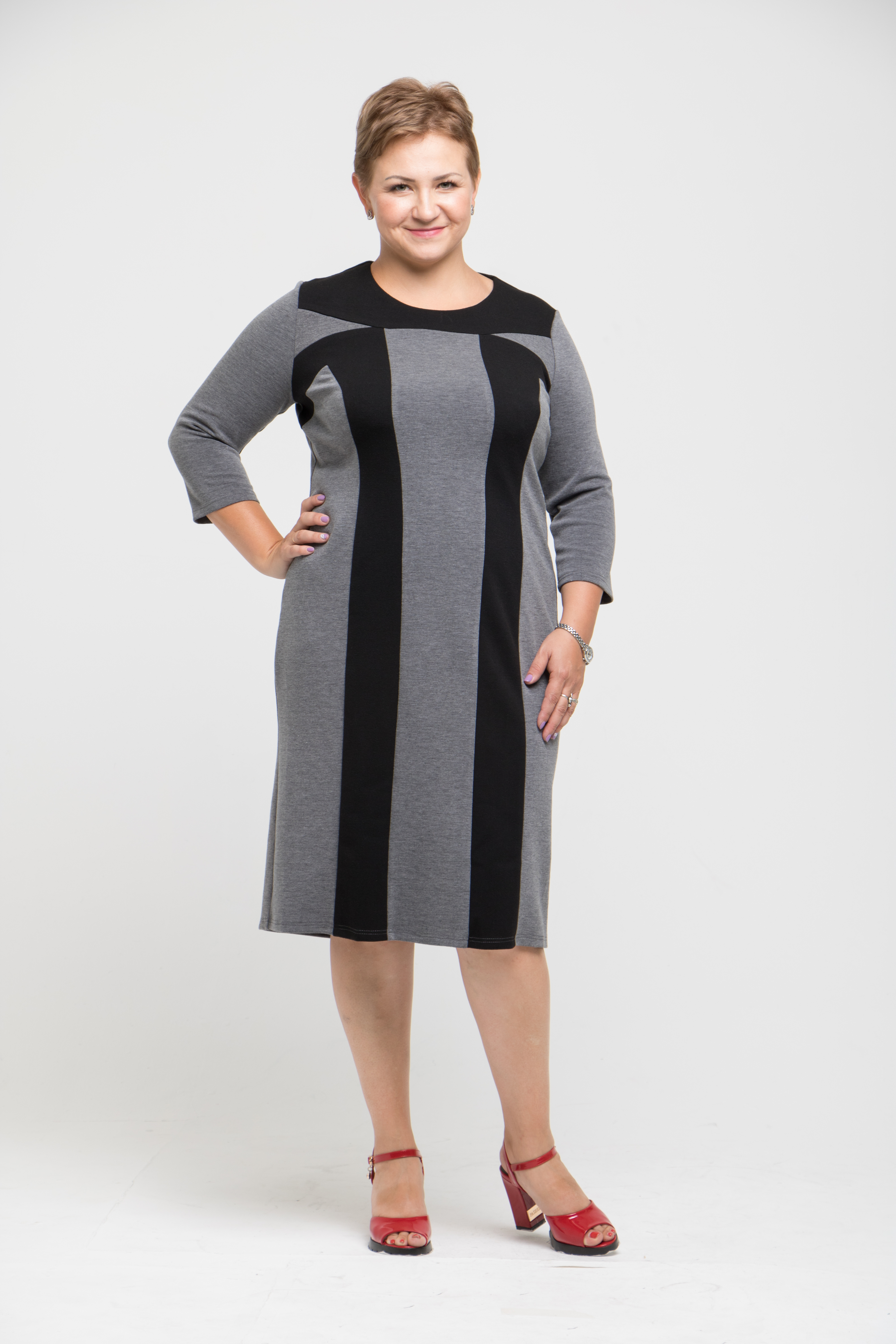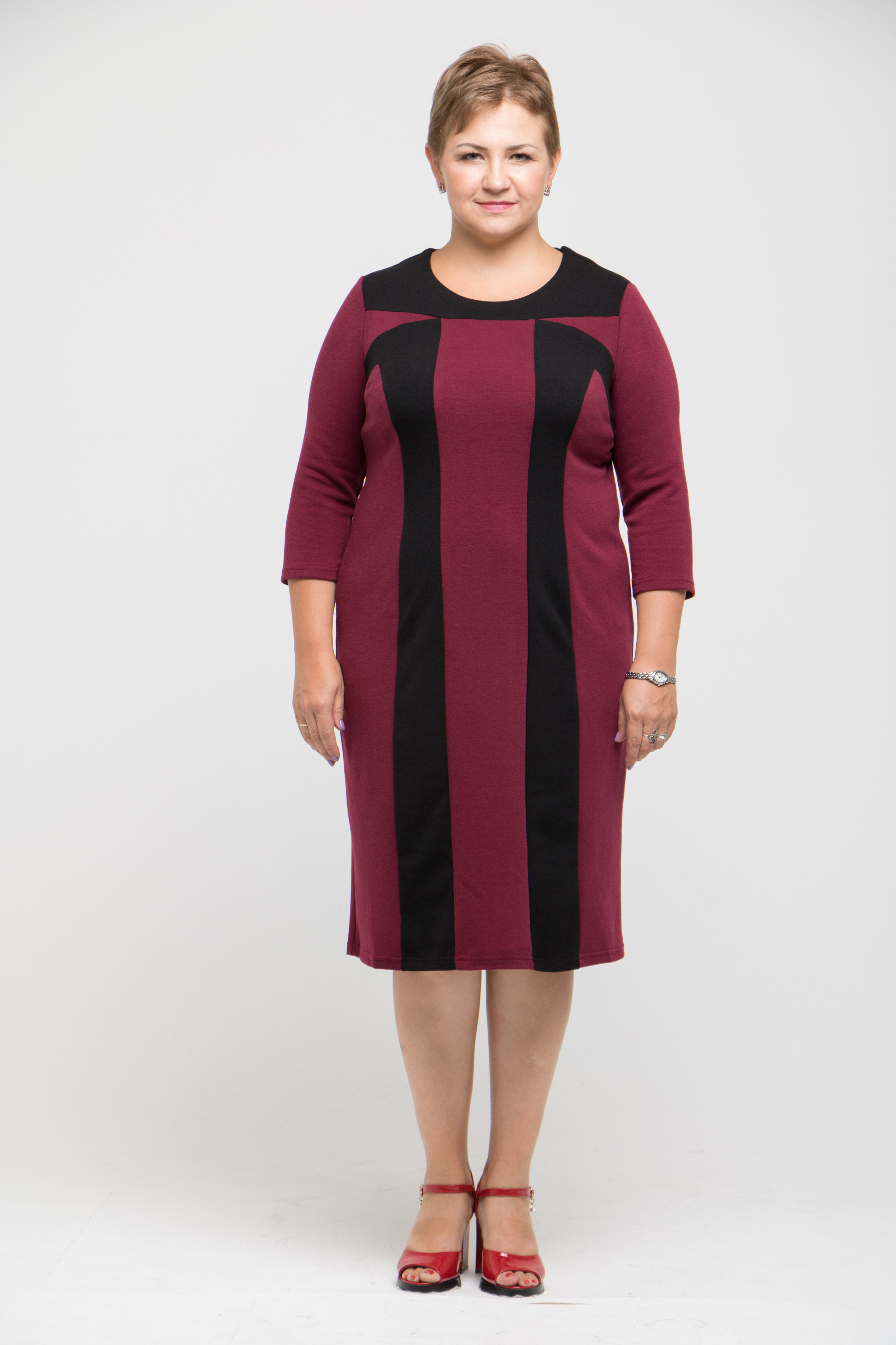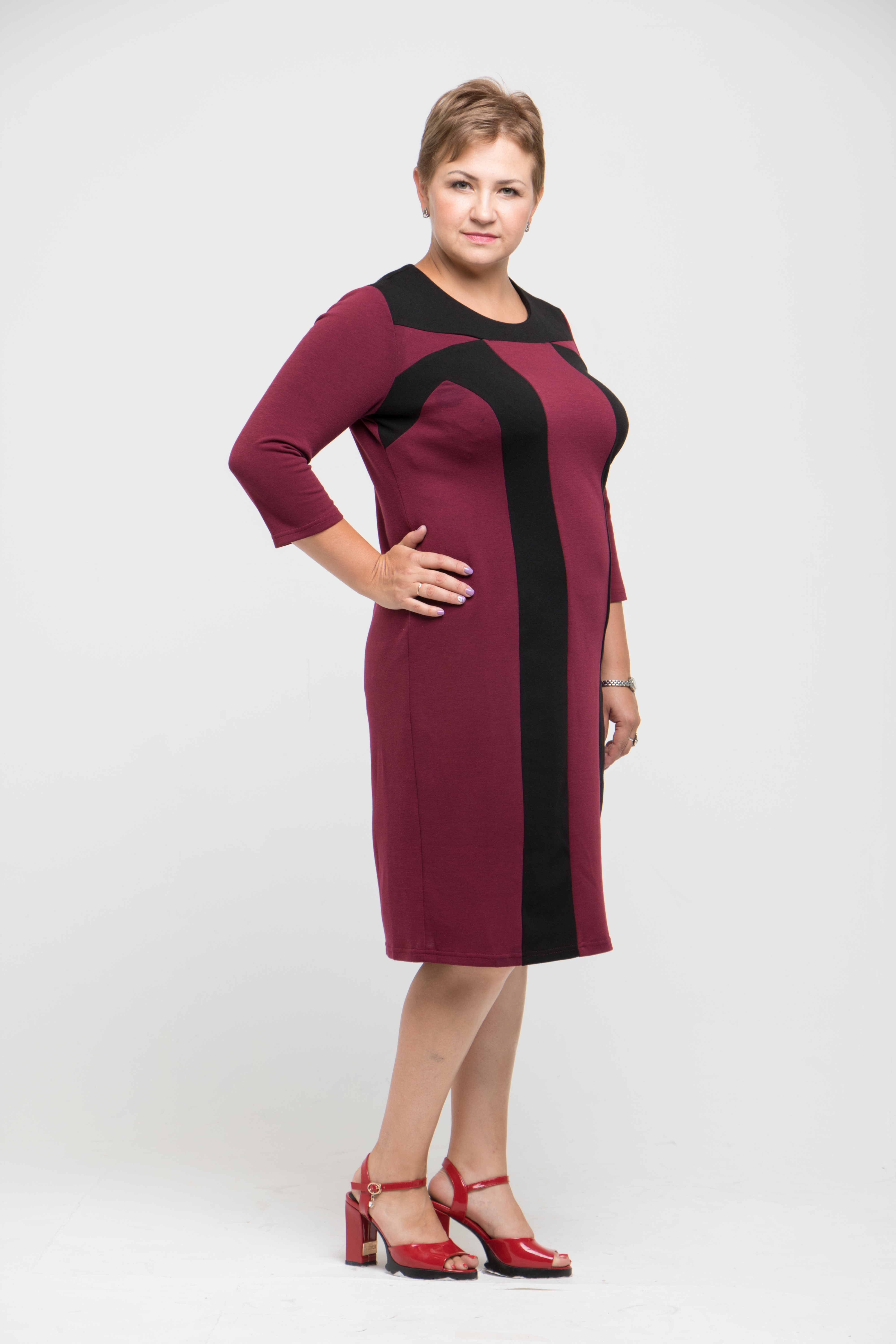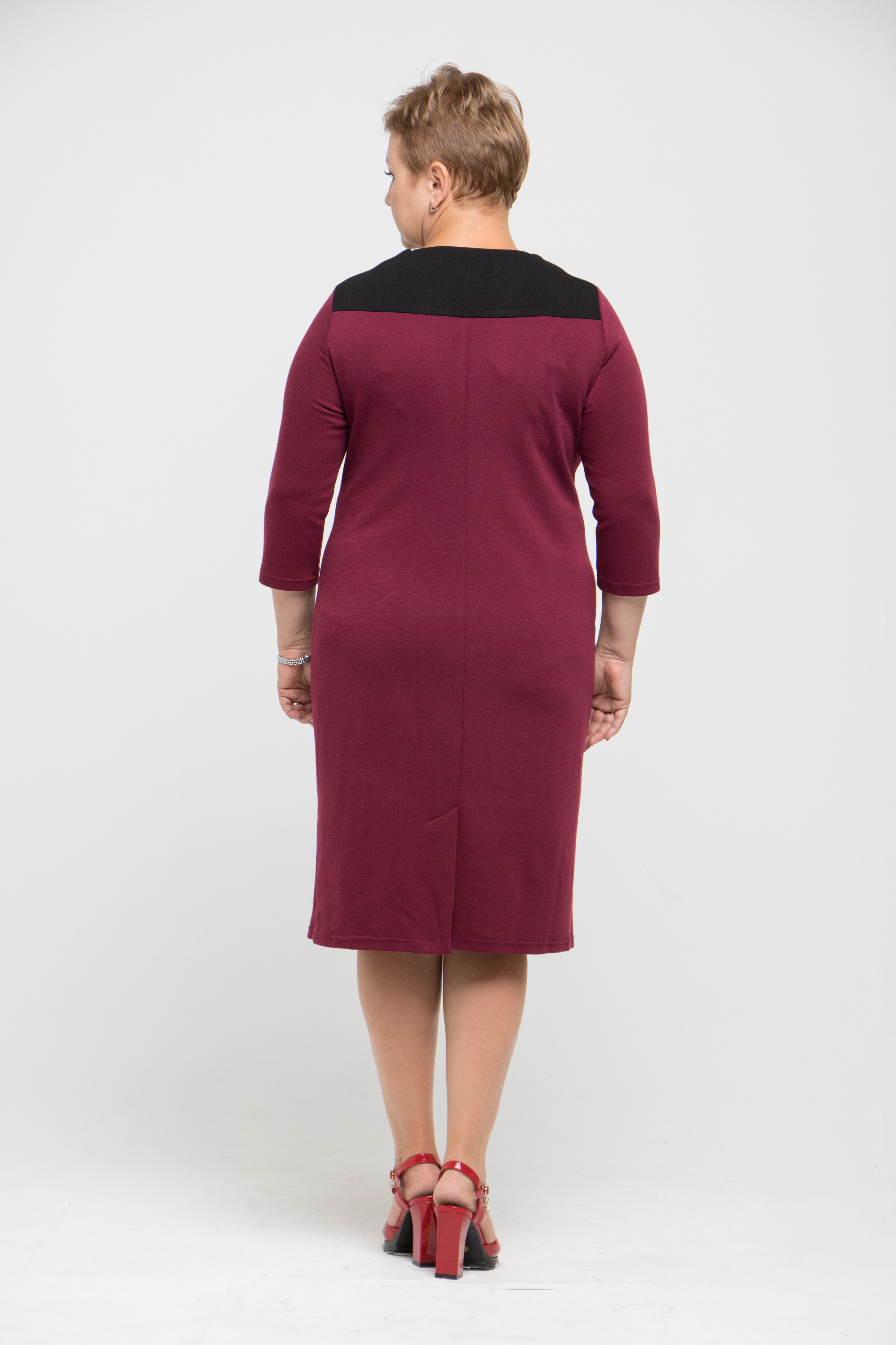 Платье полуприлегающего силуэта, выполнено из однотонного плотного мягкого трикотажа типа джерси. По переду рельефы со вставками из контрастного трикотажа. По переду и спинке - кокетки, также выполненный их отделочного материала.Рукав втачной , зауженный к низу. Спинка стачная со шлицей. Преимущество этой модели в прекрасном гладком и мягком трикотаже, который обеспечит комфорт в холодное время года. А вертикальные линии членения, придадут стройность и подчеркнут достоинства женской фигуры. Это платье станет незаменимым в гардеробе современной женщины.Модель очень удобна в эксплуатации. Подходит как для повседневной носки , так и для небольшого торжества (при использовании некоторых аксессуаров).Рекомендации по уходу: ручная или машинная стирка в машине - автомат в режиме " деликатная стирка". Размерный ряд : 52-54-56-58