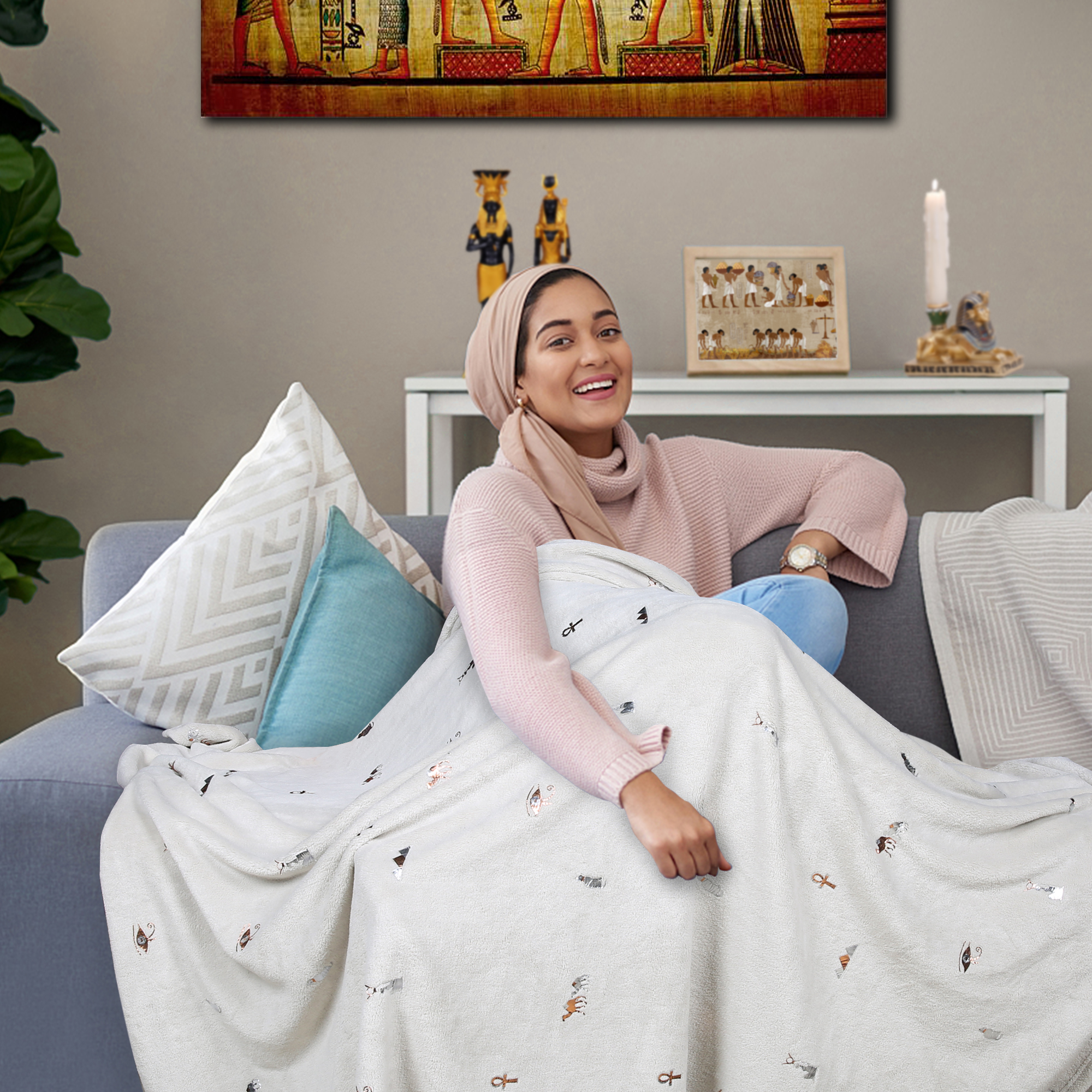 •Уникальный и Дизайнерский Флисовый Плед “Египетские сны”.  •Мягкий и уютный плед даст вам ощущение теплого песка нагретого   Египетским солнцем и заполнит атмосферу помещения уютом, богатством и роскошью Египетских сокровищ. •Материал Флис- мягкий, легкий, воздушный •Размер 50/70 инч 127 / 177см •Цвет- Серый Теплый •Рисунок- Золотые и Серебряные штампы с тематикой Древний Египет •Особый Дизайн Упаковки •Уникальный Подарок. •Подходит для любого сезона.