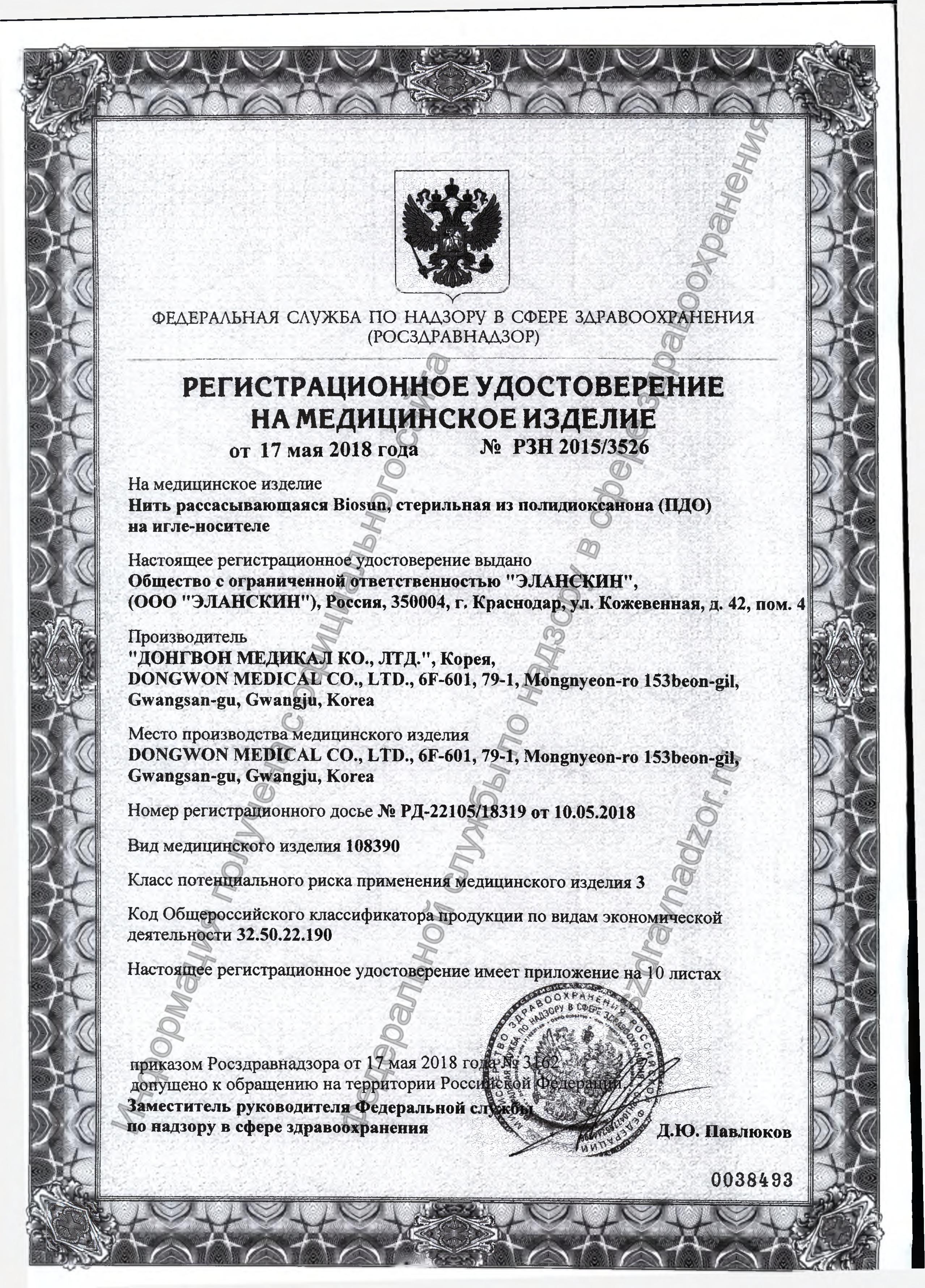 Мезонити BIOSUN зарегистрированы как медицинское изделие – «НИТЬ РАССАСЫВАЮЩАЯСЯ BIOSUN, СТЕРИЛЬНАЯ ИЗ ПОЛИДИОКСАНОНА (ПДО) НА ИГЛЕ-НОСИТЕЛЕ».