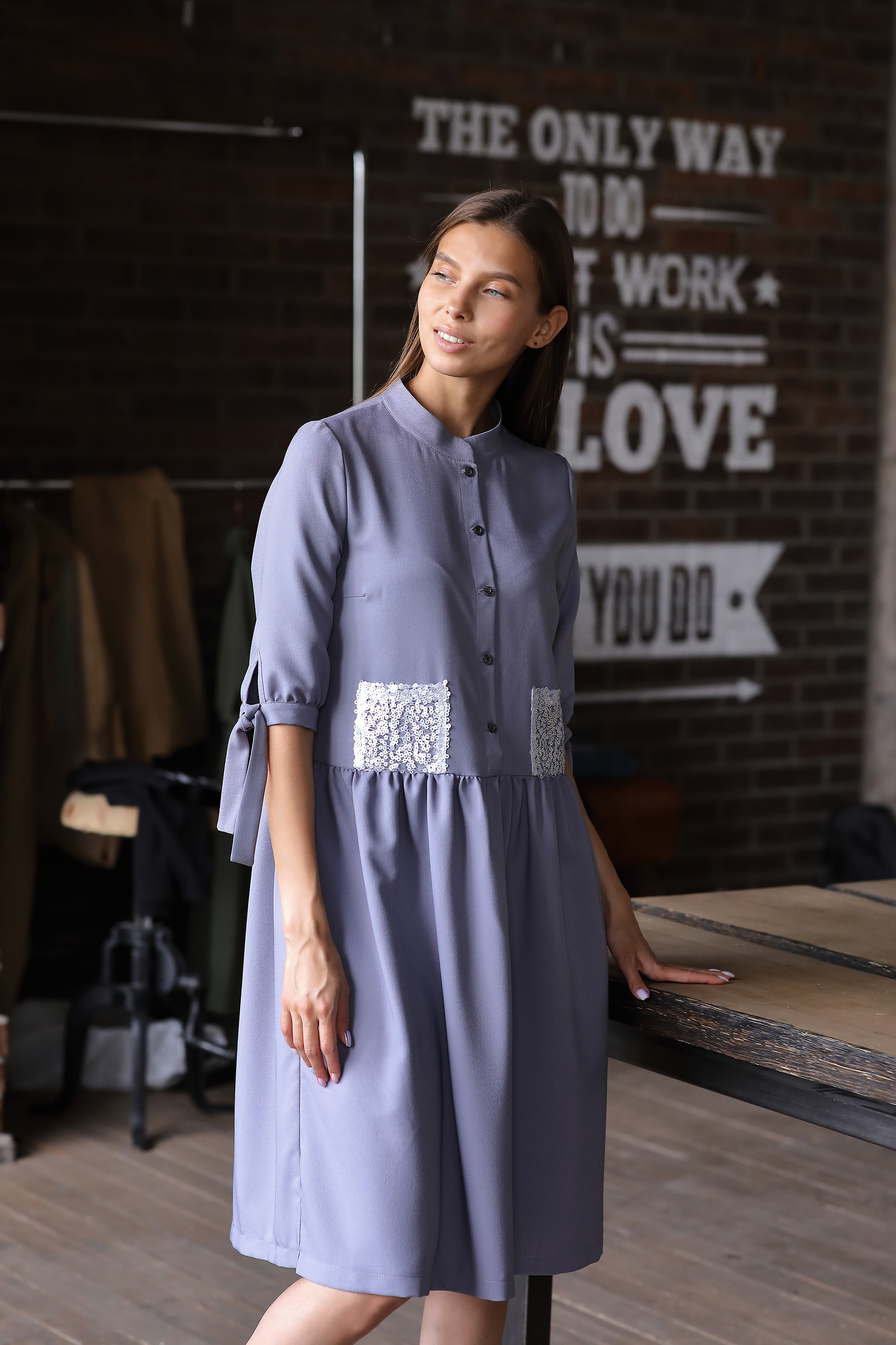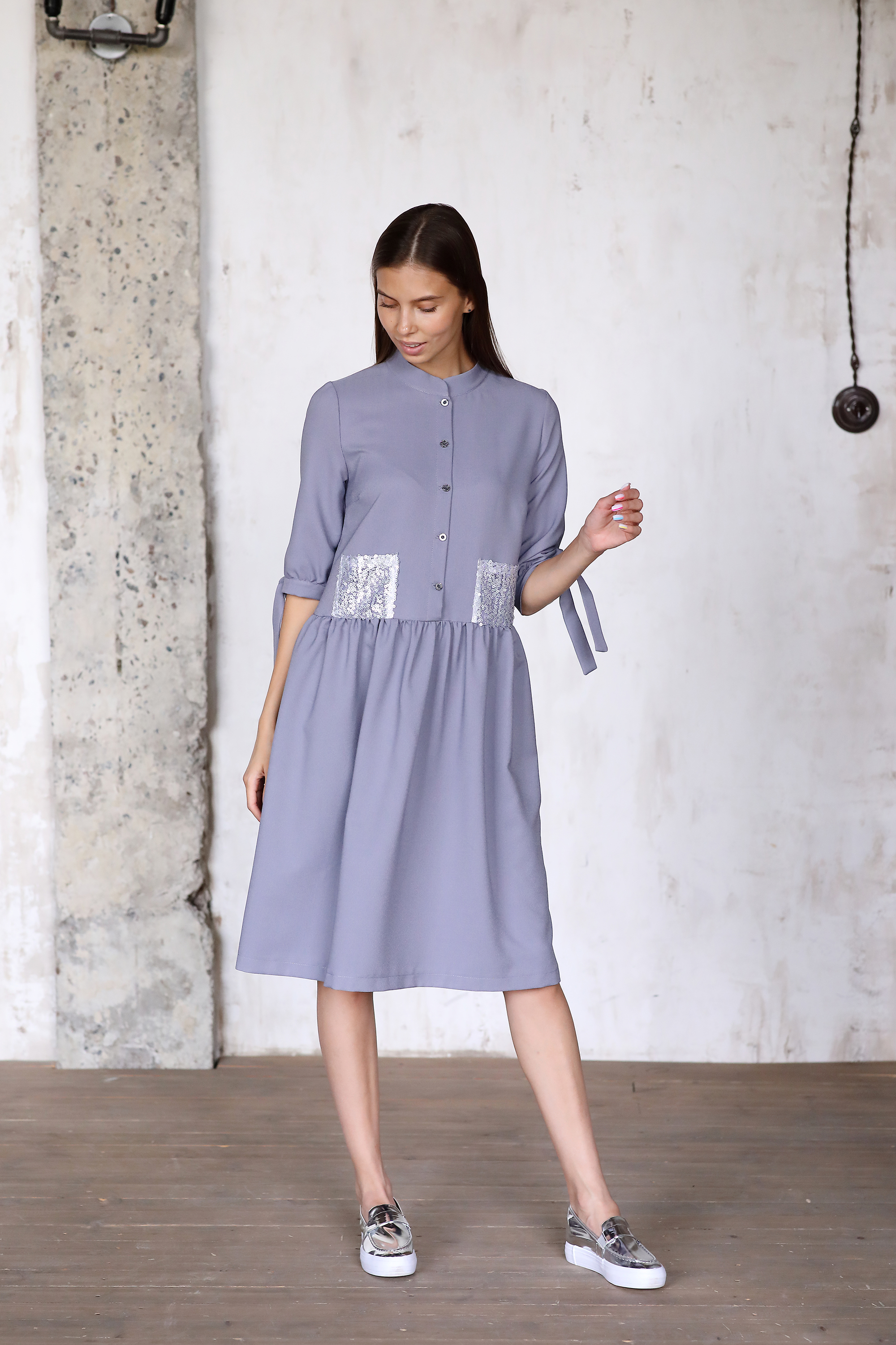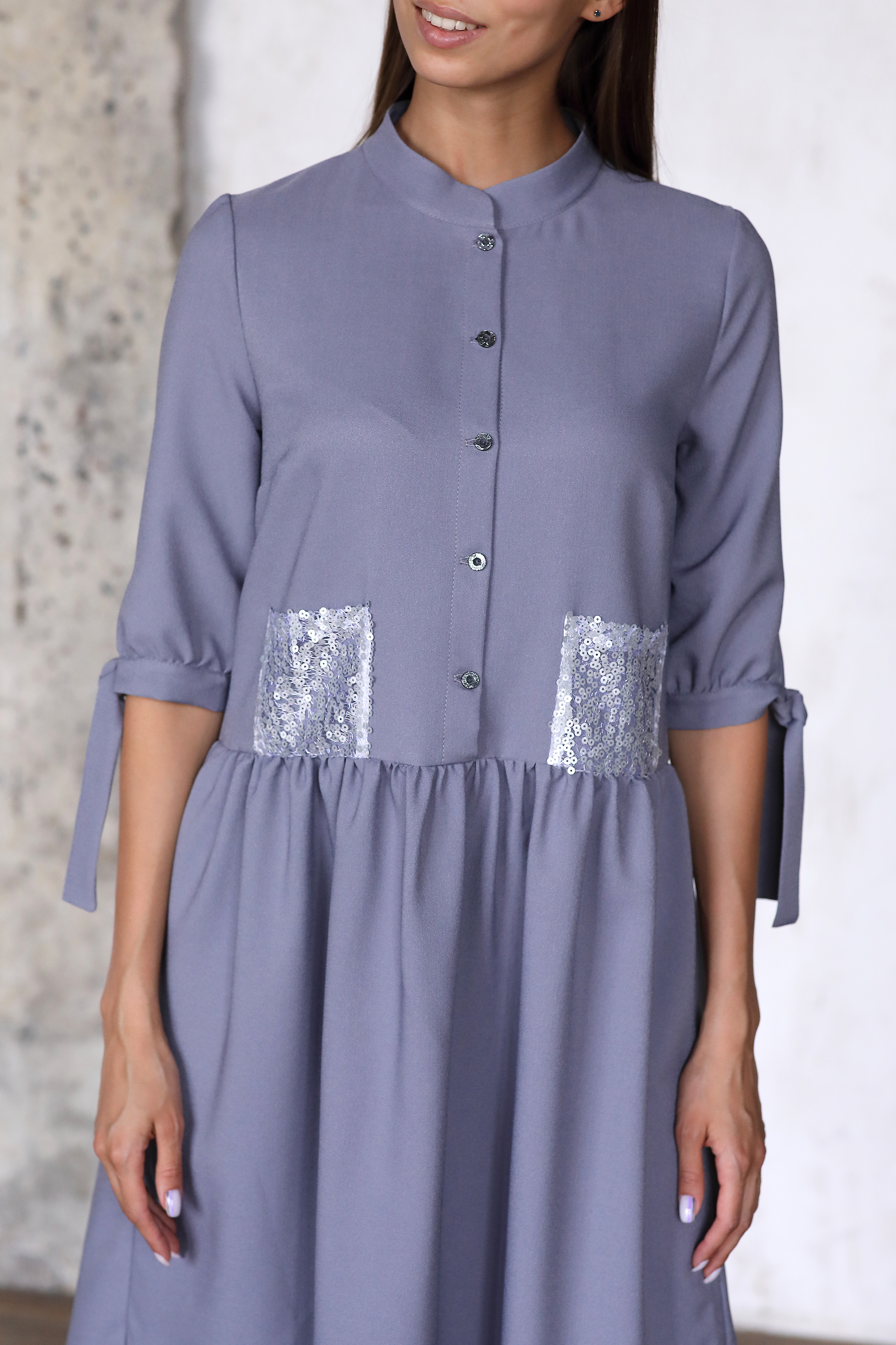 Состав ткани: 95% полиэстер, 5% спандекс Ткань: Плательная Цвет: Серо-синий Длина изделия: по спинке: 104 см* Комплектация: Платье Размер на фотомодели: XS Рост фотомодели: 173 см Параметры фотомодели: 84/63/96 см Стильное платье из мягкой плательной ткани красивого серо-синего цвета. Модель свободного кроя на пуговицах со сборкой. Рукав 3/4 с завязками, которые при желании можно завязать в изящный бант. Декорировано накладными карманами из мелких пайеток. Отличный повседневный вариант на все случаи жизни. * Числовой параметр соответствует размеру XS (удлинение по размерной сетке на 0,5 см)