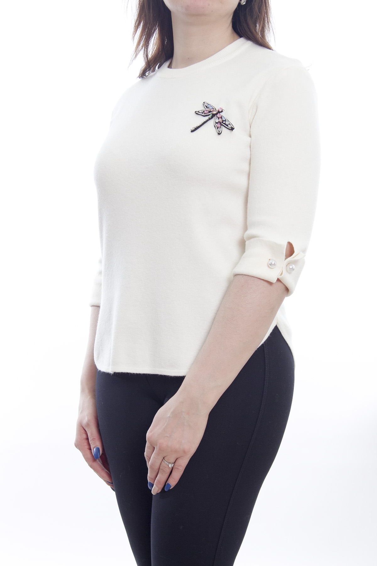 женская кофта приталенного кроя. изделие имеет рукава три четверть.