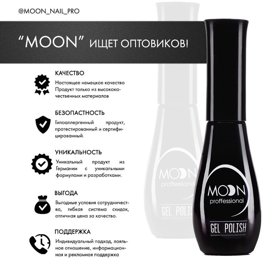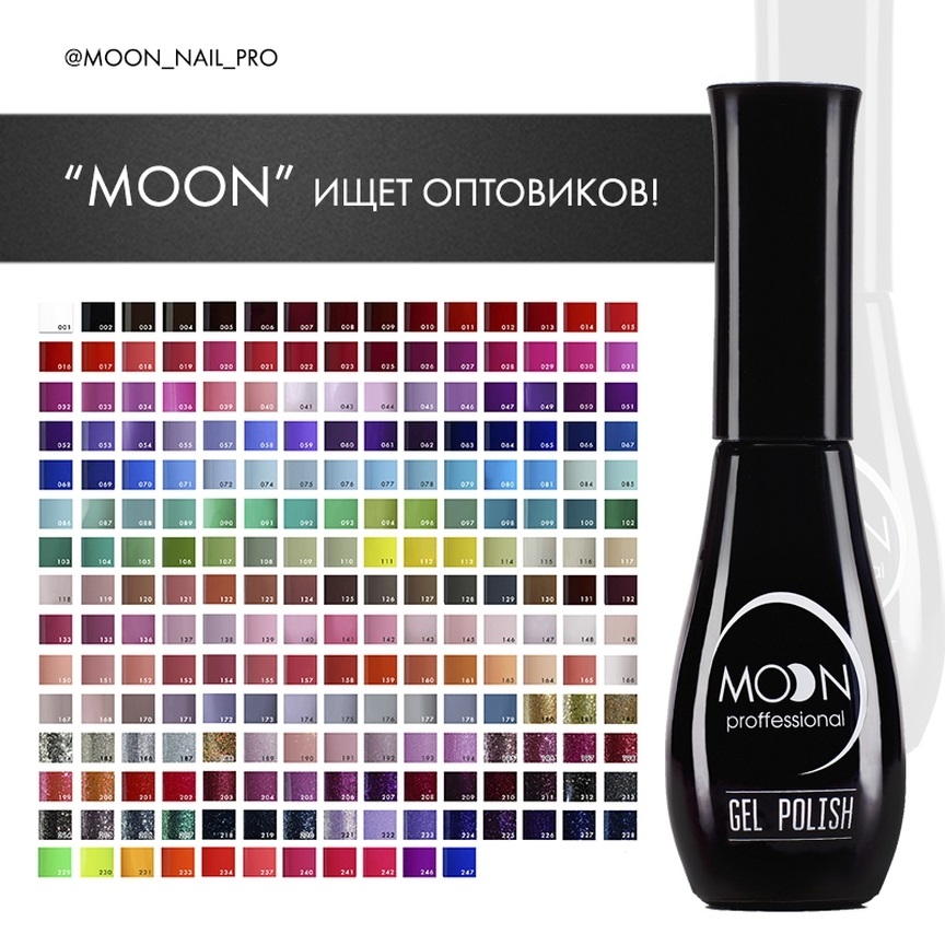 Новая торговая марка "MOON Professional" представляет уникальную гель-лаковую продукцию для nail-индустрии премиум класса. MOON - это высокое качество и идеальный результат, это богатая палитра цветов и легкость в использовании. MOON - это настоящий шедевр из Германии. Гель-лаки "MOON" - это: * лаки премиум класса как для профессионального, так и для домашнего использования; * гипоаллергенный состав идеально подходит для чувствительной кожи, не ухудшает состояние ногтевой пластины; * идеальное нанесение в 1 слой, желеобразная структура гель-лака с удобной кисточкой; * стойкое покрытие без потери цвета и блеска, без сколов, расслоений до 4 недель стойкости; * быстрое снятие не более 15 минут со стандартными средствами; * широкая палитра оттенков из более чем 200 цветов высокопигментированных лаков; * экономичное использование (одного флакона хватит на 20 применений!); * отличная цена за невероятно высокое качество премиум класса. Мы являемся официальными представителями немецкой торговой марки "MOON Professional" по России. Покупая продукцию у нас, Вы оберегаете себя от подделок и приобретаете товар по выгодной цене. Осуществляем доставку с помощью почты России и с привлечением транспортных компаний по территории РФ и в другие страны. Заказ можно оформить, написав нашему торговому представителю сообщение в группе. Ждем за оптовыми покупками магазины косметики, салоны красоты, маникюрные салоны. Гель-лаки марки "MOON" в розницу можно приобрести только у наших партнеров, указанных на сайте.