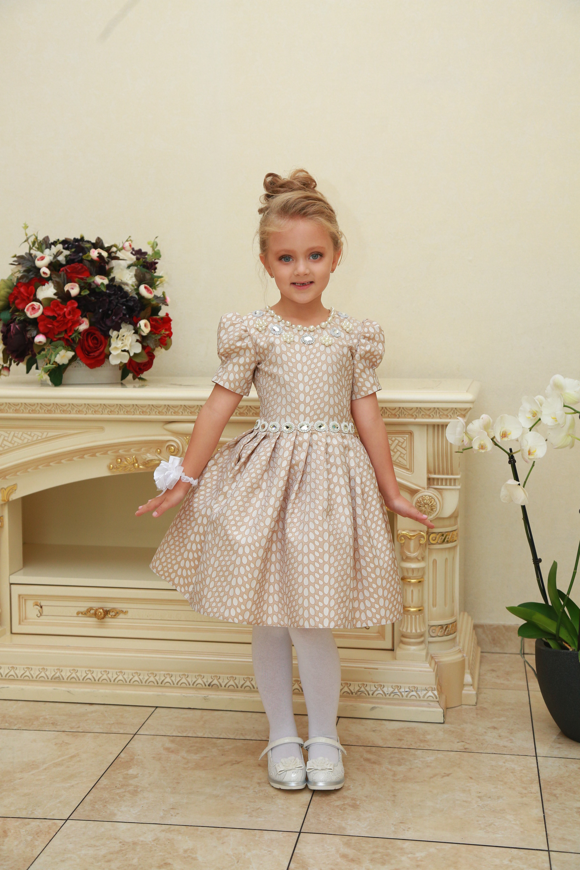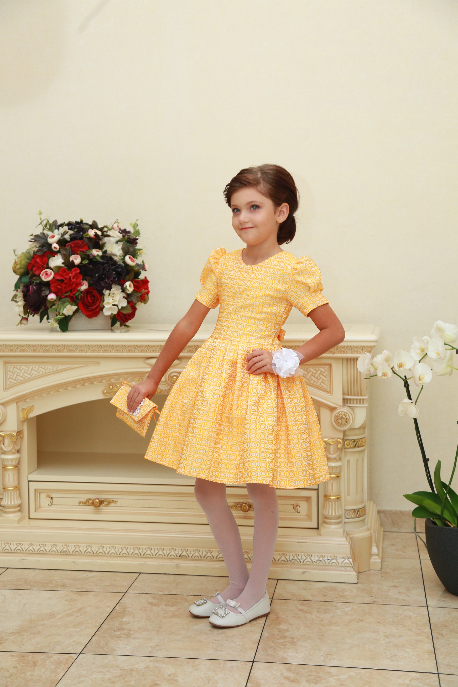 Описание модели: Ткань х/б, цветной штапель. х/б подклад. Отделка - цветок из атласной ленты с жемчужной брошью.Размеры от 4 до 8 лет