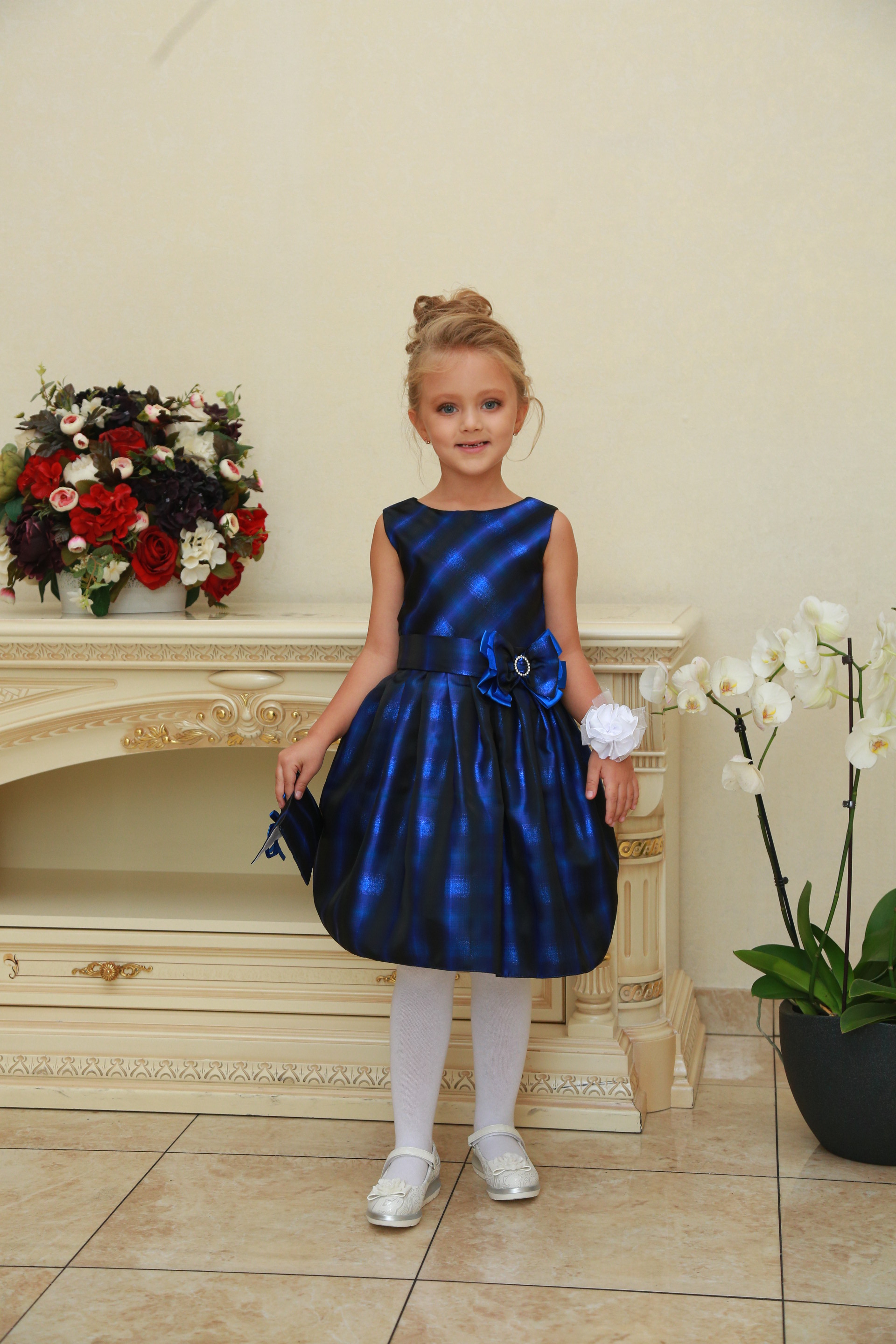 Описание модели: Ткань - штапель, Отделка - атласный бант с камнем.Размеры от 4 до 8 лет