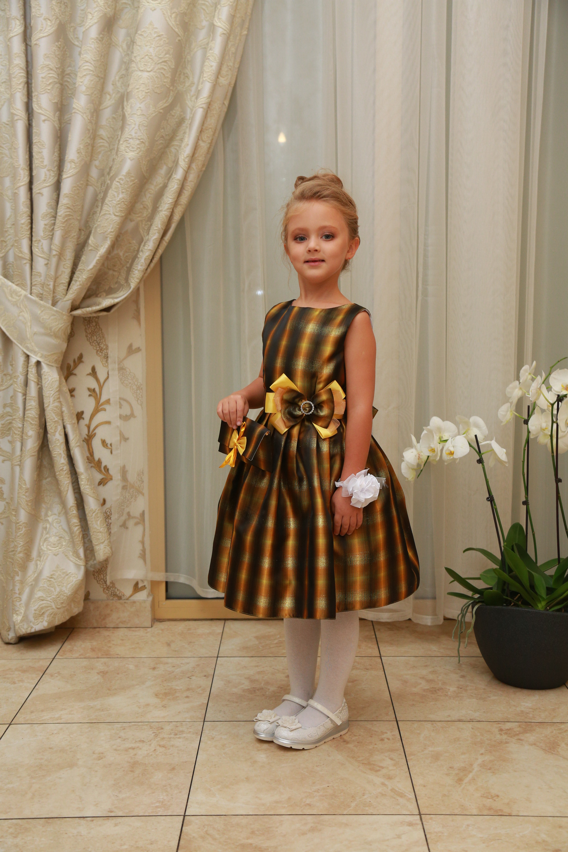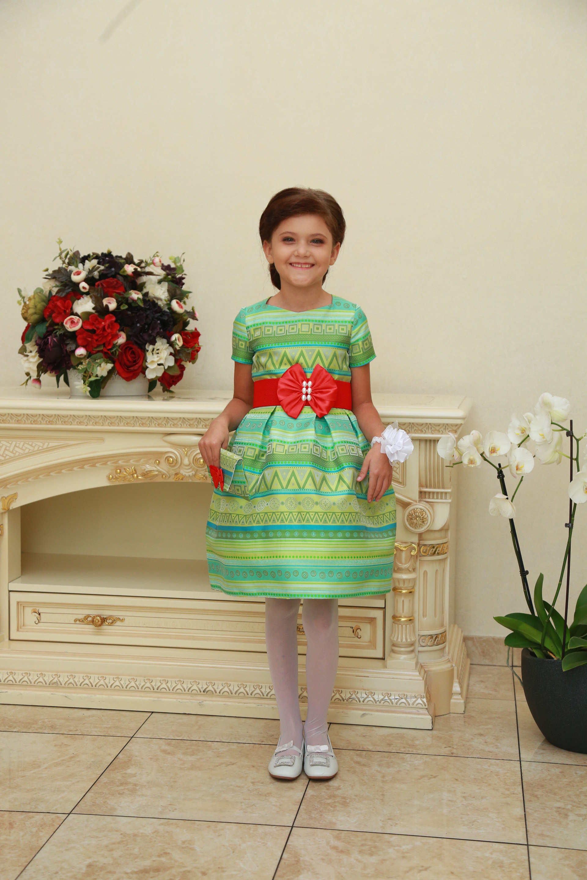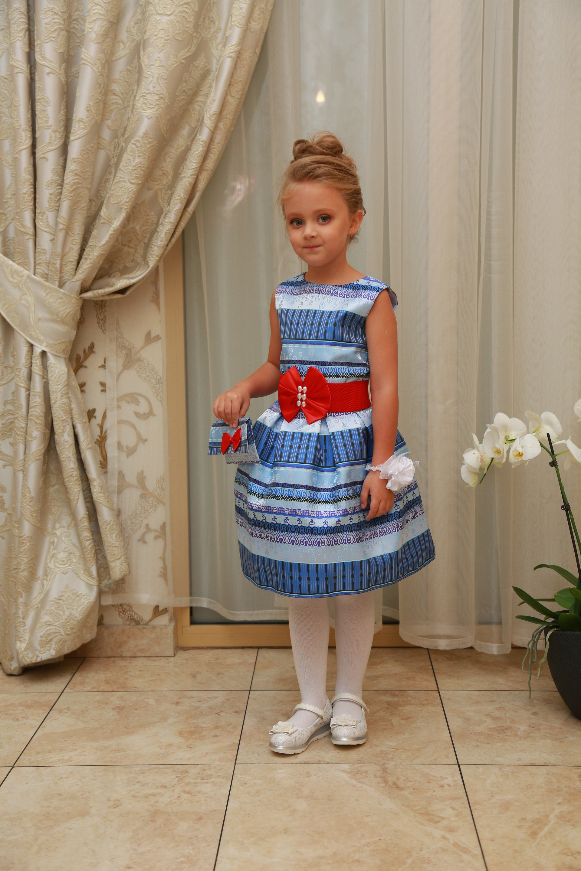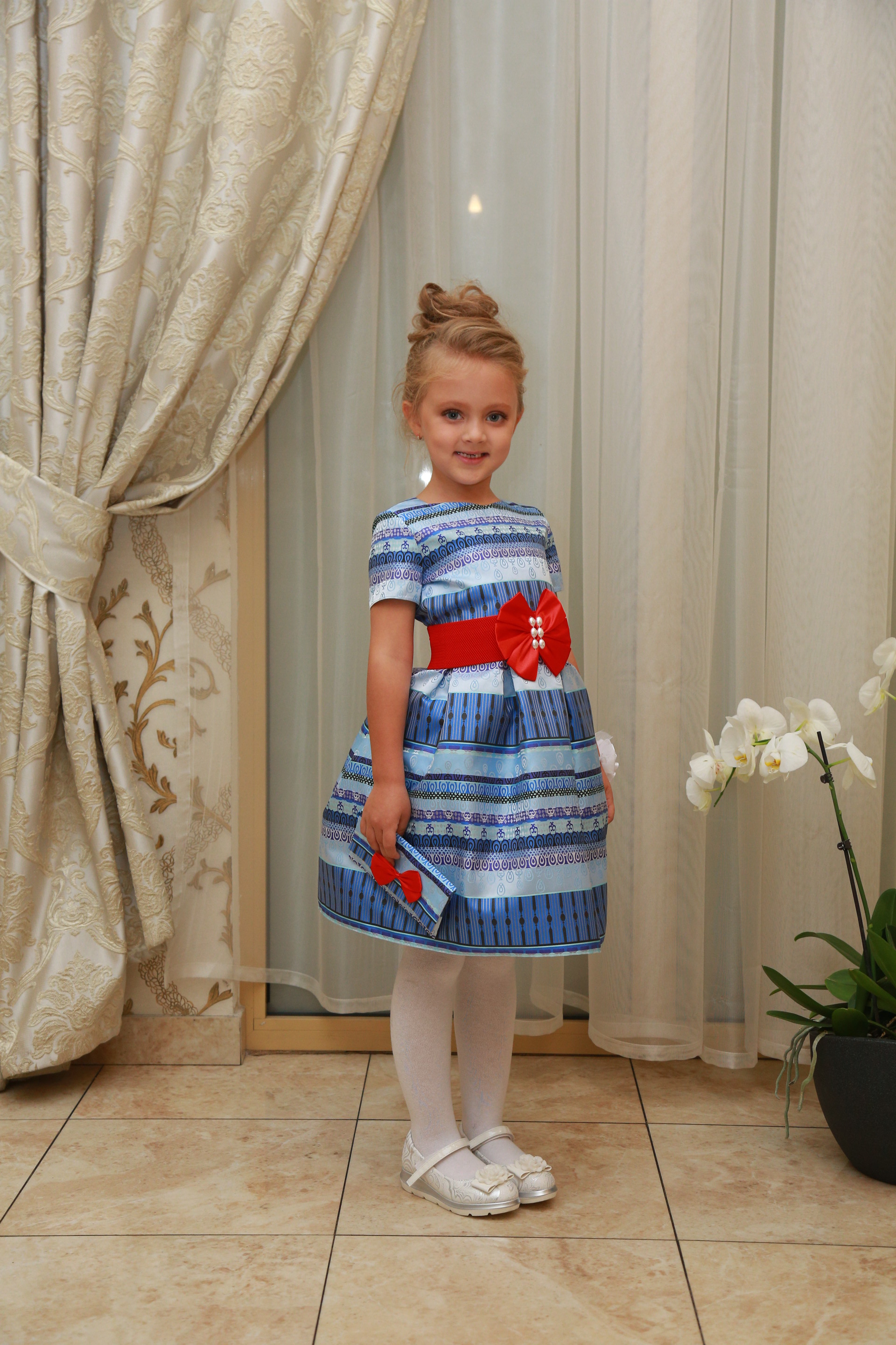 Описание модели: Ткань: 35% х/б+65% полиэстр, стрейч х/б, х/б подклад. Отделка - атласная лента, бантик.Размеры от 5 до 9 лет