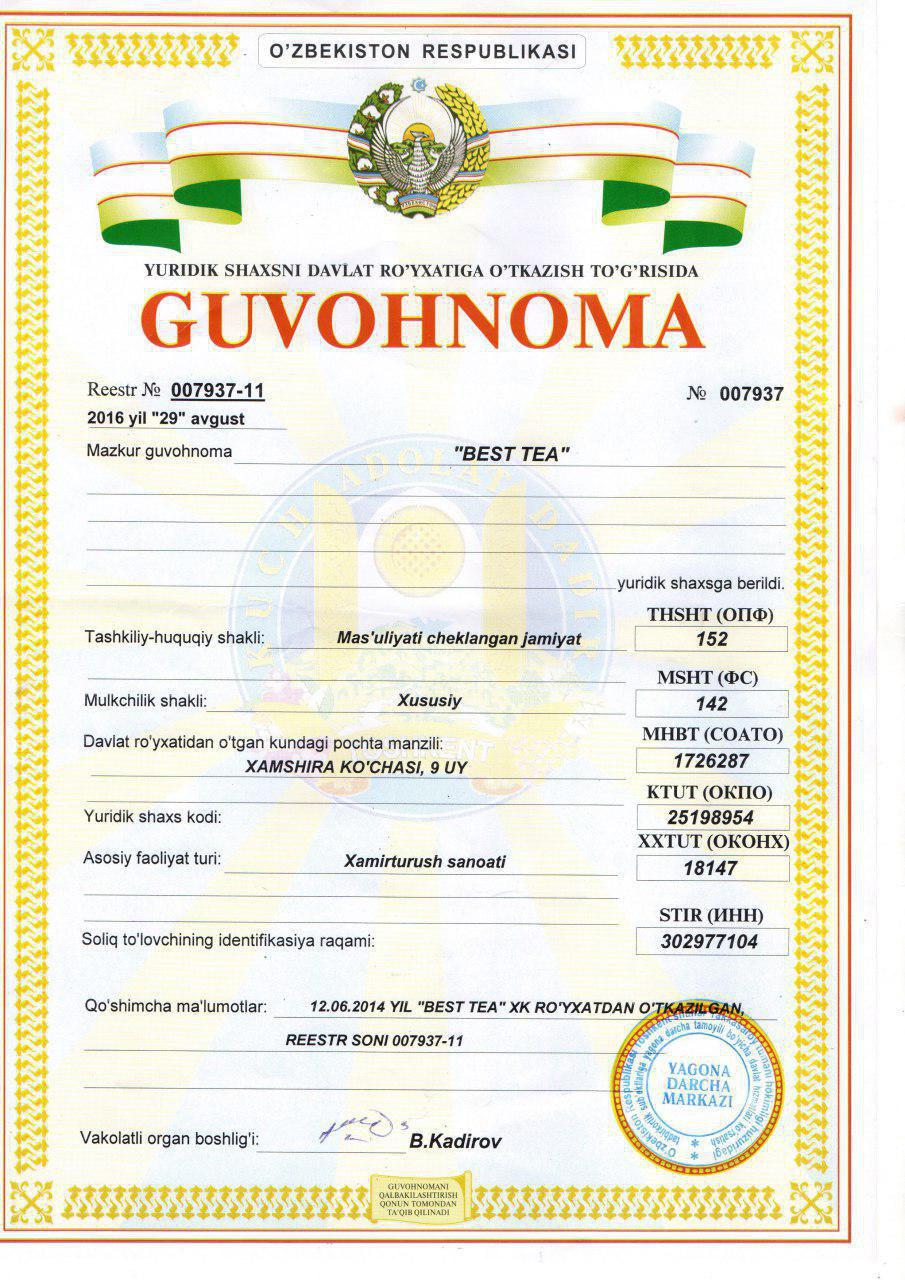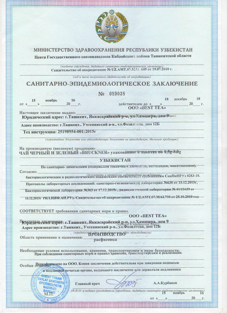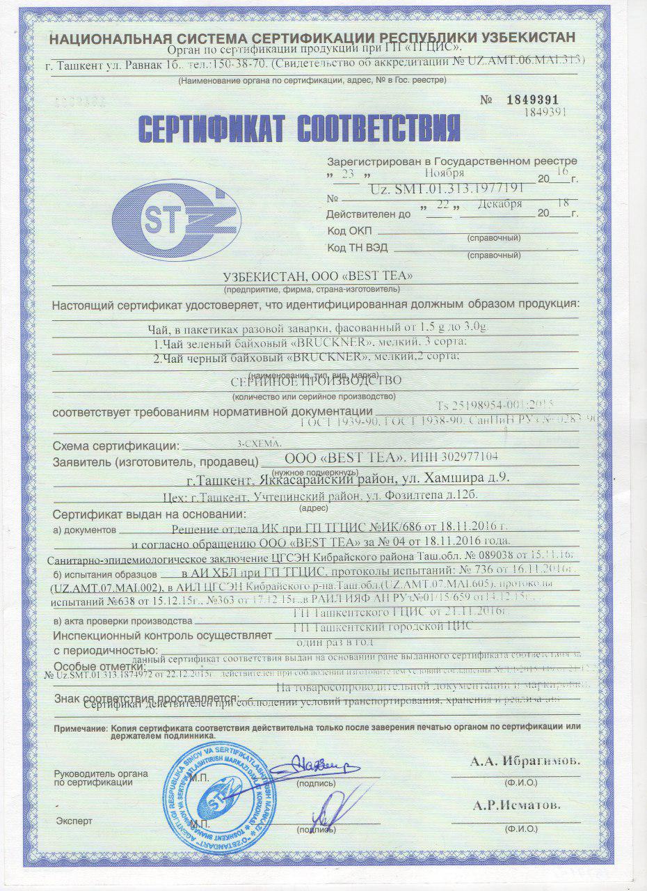 Наша компания "OOO Best Tea" занимается производством, фасовкой индийского, китайского, кенийского, иранского, цейлонского чая под брендом "BRUCKNER". Наш чай пользуется большим спросом в г. Ташкент и других регионах Республики Узбекистан. Продукция соответствует всем государственным нормативам и стандартам, не имеет красителей и каких либо химических добавок. Производство осуществляется стабильно, с 2014 года, на фирме работает 25 человек. С успехом и конкурентоспособными ценами мы попали на все рынки нашей Республики, далее хотим расширять границы сотрудничества и попасть на рынки соседних государств (Казахстан, Таджикистан, Кыргызстан и др.) найти заинтересованных дистрибьюторов за границей для реализации чая.