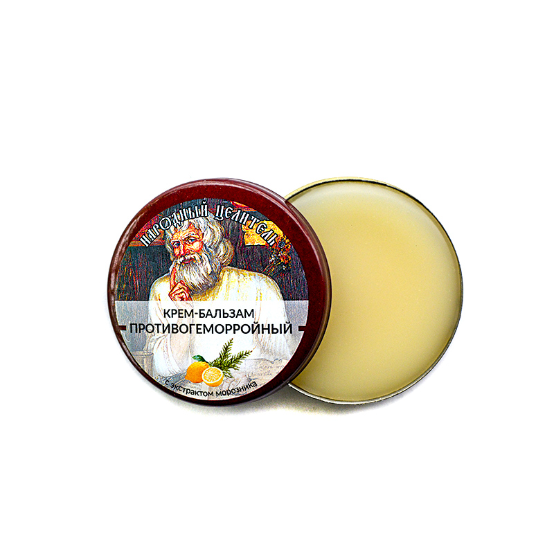 Крем-бальзам разработан на основе натуральных компонентов для лечения и профилактики геморроя. Средство обладает местным обезболивающим эффектом, позволяет снять неприятные симптомы (боль, жжение, зуд), ускоряет процесс заживления трещин, нормализует отток крови, укрепляет стенки сосудов, способствует уменьшению геморроидальных узлов. Экстракты коры дуба и чёрного тополя наделены сильными вяжущими и антисептическими свойствами, хорошо заживляют, укрепляют сосуды. Экстракт каштана улучшает микроциркуляцию, а экстракт морозника обладает выраженным противомикробным действием, способствует заживлению. В состав листьев малины входят флавоноиды, обладающие кровоостанавливающими свойствами, поэтому это растение часто применяется в народной медицине для лечения геморроя. Эфирные масла, витамины и компоненты основы обеспечивает быстрое заживление, смягчает кожу и уменьшает болевые ощущения. Сера обладает противовоспалительным, антисептическим, заживляющим и подсушивающим действием, поэтому является очень эффективным средством при геморрое (в частности, мокнущем геморрое), даёт отличные результаты на ранних сроках. Состав: вазелин, церезин, ланолин, экстракты коры дуба, черного тополя, малины, каштана и морозника, витамины А и Е, воск пчелиный, сера очищенная, эфирные масла кипариса, чайного дерева и лимона. Способ применения: при первых признаках геморроя наносить на воспаленный участок заднего прохода несколько раз в сутки, а также после дефекации и принятия гигиенического душа. Применять до исчезновения симптомов воспаления. Рекомендуется также использовать для профилактики.