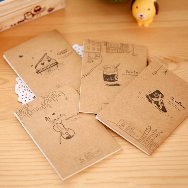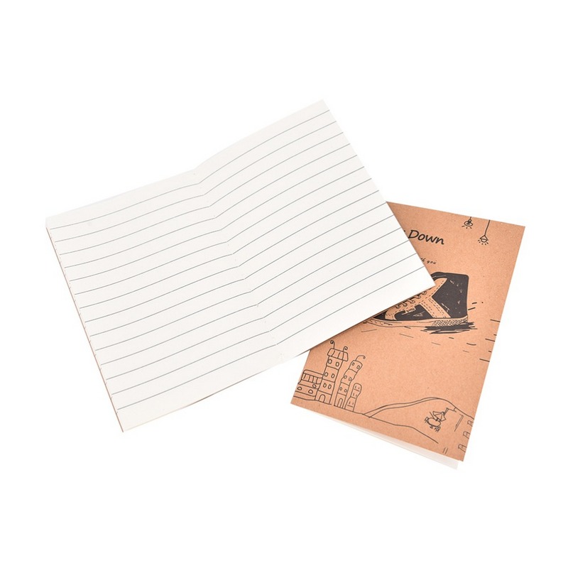 Блокнот в стиле ретро "Хобби" с прошитой обложкой из коричневой крафт-бумаги с авторскими рисунками. Все внутренние листы разлинованы в обычную школьную линейку, что очень удобно. Блокнот тонкий, всего на 20 листов, с размерами 12 см на 8.5 см.