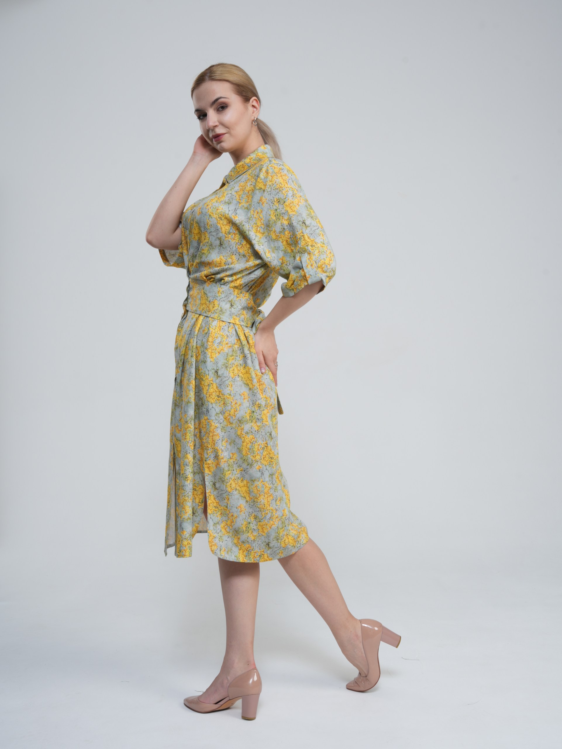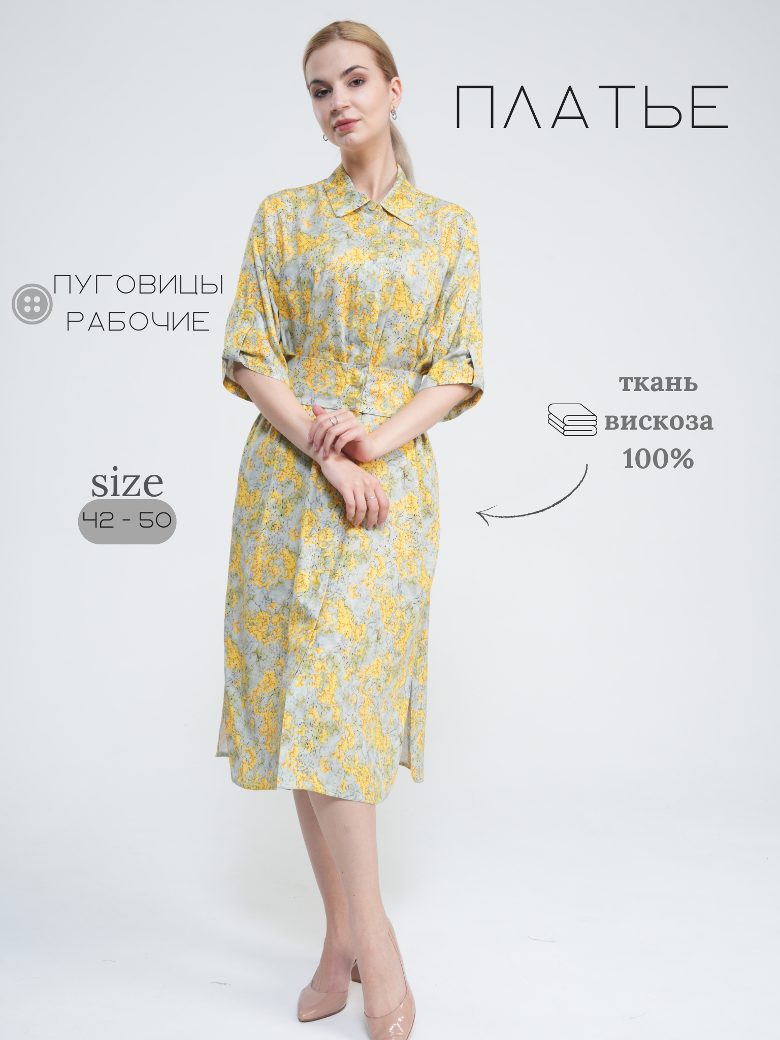 Это утонченное платье представляет собой идеальное сочетание элегантности и комфорта. Платье имеет слегка приталенный крой, который подчеркивает женственные изгибы фигуры, но при этом не слишком обтягивает. Длина платья достигает средней длины, что придает ему элегантный и универсальный вид. Изготовленное из высококачественного материала, это платье обладает приятной на ощупь текстурой и отличной структурой, что делает его удобным в носке на протяжении всего дня.