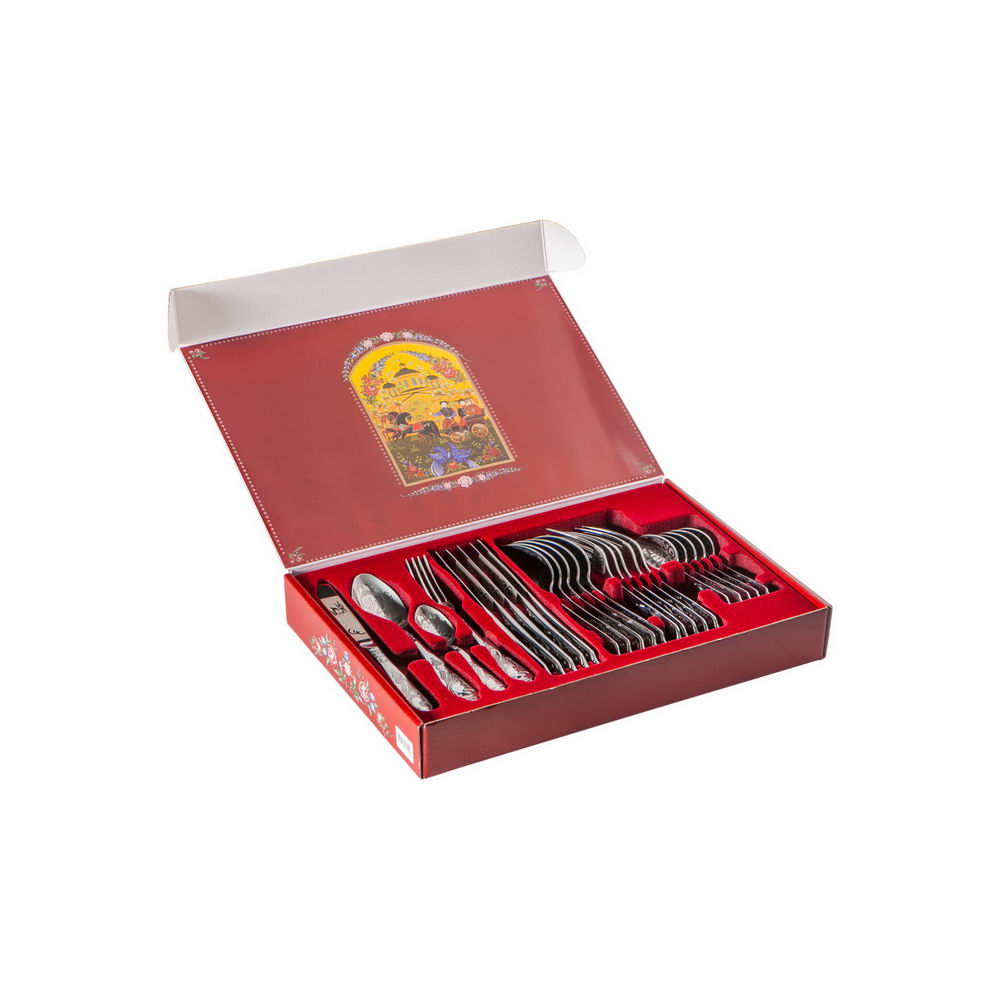 Варианты покрытия:ПокрытиеХудожественная росписьВес, гр1690Длина (мм)390Толщина (мм)263Высота (мм)58В набор входятвилки столовые - 6 шт., ложки столовые - 6 шт., ложки чайные - 6 шт., ножи столовые - 6 шт.
