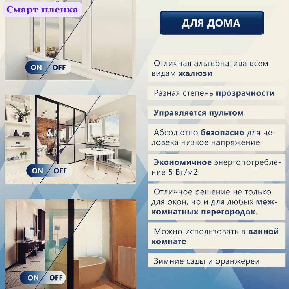 Умная тонировочная Smart (смарт) пленка PDLC - это инновационное решение, имеющее широкий спектр применения: тонирование авто, альтернатива жалюзи и шторам, конфиденциальные комнаты (комнаты переговоров, зоны отдыха, примерочные), офисные/комнатные перегородки, остекление фасадов.