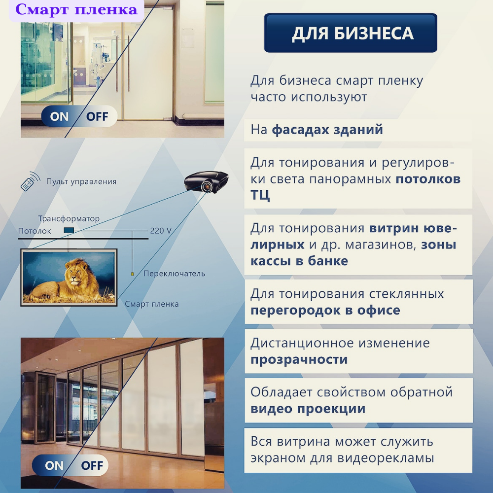 Смарт пленка Proektsia (Проекция) с функцией переменной прозрачности от матовой до прозрачной – это специальная полимерная жидкокристаллическая пленка, которая наклеивается на любые стеклянные поверхности, с целью регулировки прозрачности стекла за доли секунды с пульта : от матовой до прозрачной и от серой до прозрачной. Всего одно нажатие кнопки – и стекла могут скрыть обстановку от посторонних глаз или стать прозрачными. Умная тонировочная Smart (смарт) пленка PDLC - это инновационное решение, имеющее широкий спектр применения: тонирование авто, альтернатива жалюзи и шторам, конфиденциальные комнаты (комнаты переговоров, зоны отдыха, примерочные), офисные/комнатные перегородки, остекление фасадов. Смарт пленка обратной проекции, помимо функции изменения прозрачности стекла, может выступать в качестве поверхности для видеопроекции - неплохой бонус к основному функционалу! Смарт пленка поставляет от 1м2 до рулона (-ов).