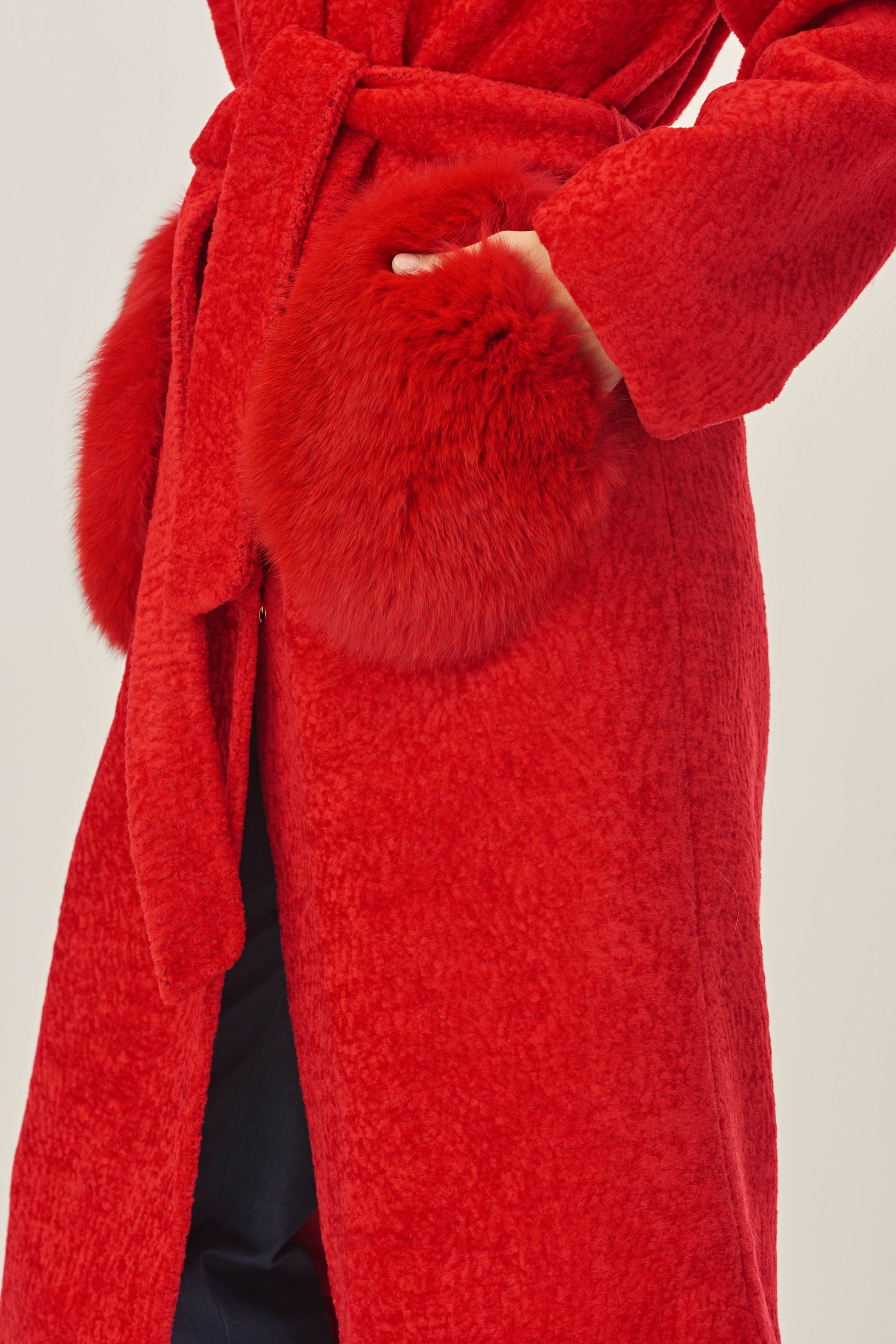 Шуба прямого силуэта, выполнена из композитного материала, с ворсом из 100 натуральной шерсти. Температурный диапазон от 3°C до -10°C. Воротник шанель, застежки кнопки, накладные карманы с боковым входом отделка натуральный мех песец. Модель с поясом.