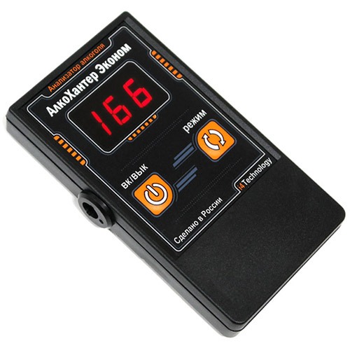Алкотестер "AlcoHunter Эконом" — это недорогая версия модели "AlcoHunter Professional+", имеющая более простой 3-символьный дисплей, и лишившаяся дополнительных функций. При этом точность измерений снизилась лишь незначительно благодаря применению высококачественного полупроводникового датчика. Цена новинки приближается к стоимости китайских аналогов, но при этом она имеет несравнимо большую точность измерений. Достоинства алкотестера "AlcoHunter Эконом": 1) Доступная цена при высокоточных результатах измерений. Применение полупроводникового датчика высокого качества позволяет проводить точные измерения с относительной погрешностью до 25%. Такой показатель существенно лучше, чем у китайских алкотестеров, да и у большинства приборов для персонального применения, представленных в магазинах России. Алкотестеры китайского производства можно скорее отнести к категории игрушек, на показания которых не стоит всерьез рассчитывать, иначе это может привести к серьезным последствиям, вплоть до лишения прав. В этом вопросе лучше не рисковать, и купить надежный и высокоточный прибор, тем более что "AlcoHunter Эконом" лишь ненамного дороже китайских устройств! При этом он является "наследником" популярной модели "AlcoHunter Professional+", которая признана эталоном точности среди персональных устройств и приближается к профессиональным приборам, которые находятся на "вооружении" инспекторов ДПС. Алкотестер "AlcoHunter Эконом" можно смело назвать лучшей моделью по соотношению параметров "цена/точность измерений". 2) Проведение измерений в широком диапазоне. Алкотестер "AlcoHunter Эконом" способен работать в широком диапазоне величин — от 0 до 5 промилле. Независимо от степени содержания алкоголя в крови, Вы получите точный результат на дисплее. Нередко китайские и другие иностранные алкотестеры "недооценивают" тягу русского человека к спиртному и имеют максимальную границу измерений в 2 - 2,5 раза меньше, чего будет определенно мало. 3) Счетчик отображает количество проведенных измерений. Прибор оснащен счетчиком, который показывает количество проведенных тестов. Это поможет Вам следить за состоянием алкотестера и своевременно проводить его калибровку, которая поможет поддерживать высокую точность измерений. Для отображения данных счетчика нажмите кнопку "Режим". 4) Большой межкалибровочный интервал — до 1000 измерений. Алкометр "AlcoHunter Эконом" может провести до 1000 измерений, прежде чем датчику потребуется калибровка. Для полупроводникового типа датчика, который используется в алкотестере, это весьма высокий показатель. Для сравнения стоит отметить, что большинство алкотестеров на основе полупроводникового датчика потребуют калибровку уже через 200-300 измерений. 5) Автоматическое отключение поможет сберечь заряд батареек. Прибор питается от двух батареек или аккумуляторов типа "ААА", и, конечно же, их ресурс не бесконечен. Функция автоотключения сработает при отсутствии выдоха в мундштук в течение 20 секунд. Поэтому Вы не окажетесь с разряженным прибором в самый неподходящий момент из-за того, что отвлеклись и забыли его выключить при проведении предыдущего тестирования. Технические характеристики: Размеры прибора 105 х 58 х18,5 мм Вес (с батарейками) 0,12 кг Измерения в диапазоне 0,00 - 5,00 промилле Источник питания 2 батарейки типа "ААА" Потребляемая мощность до 0,6 ВА Уровень погре