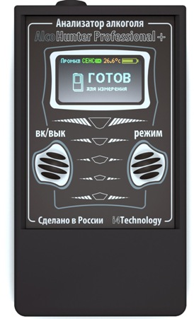 Алкометр разработан и производится в России, максимально адаптирован к отечественным условиям. Алкотестер "AlcoHunter Professional+" полностью отвечает требованиям ГК РФ, касающимся оценки уровня опьянения. Прибор снабжен качественным полупроводниковым сенсором, отличается усовершенствованной конструкцией реакционной камеры, обеспечивающей повышенную точность и чувствительность даже к самым малым дозам алкоголя (от 0,01 промилле), улучшенной системой компенсации внешних факторов. Использует контактный способ тестирования (5 мундштуков в комплекте), имеет функцию контроля полноты выдоха, выводит результаты измерения на информативный русскоязычный OLED-дисплей.