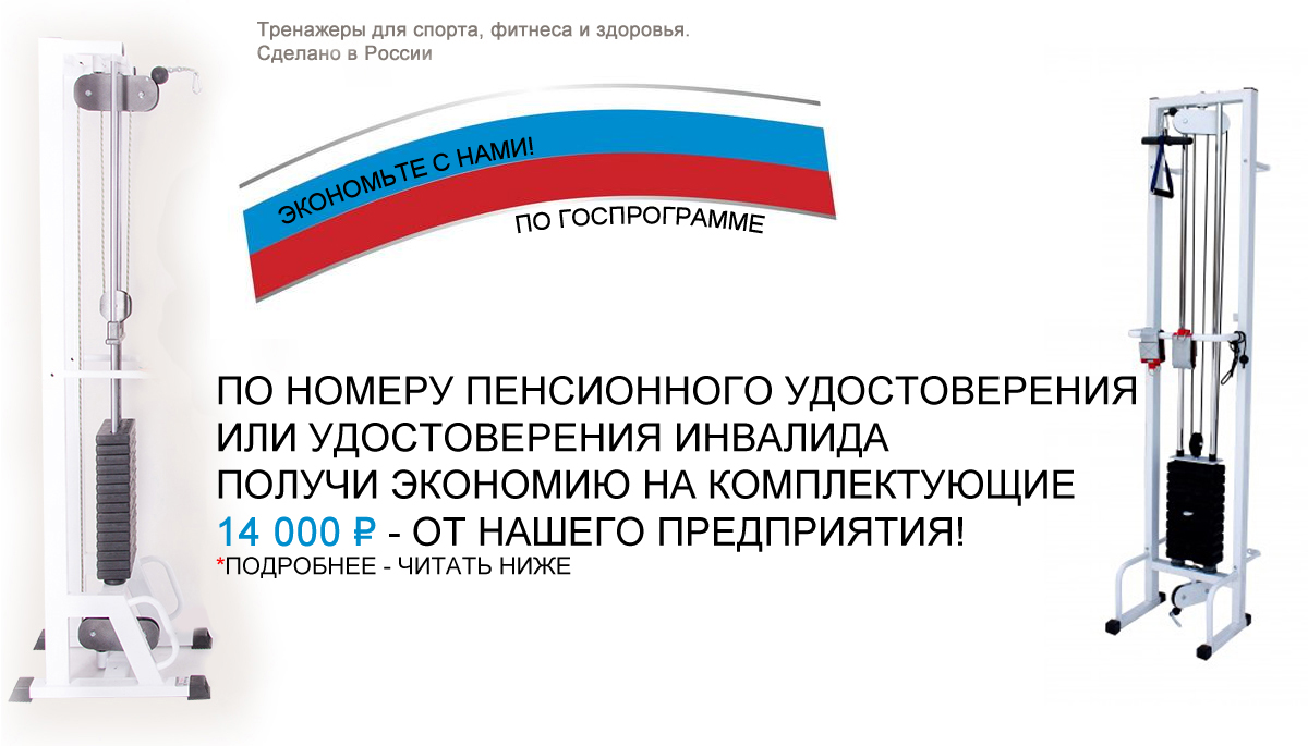АКЦИЯ! Комплектуй на 14 000 ₽ - По Госпрограмме ПРОЧТИТЕ:В рамках государственной программы поддержки социально незащищенных слоев населения - инвалидов и пенсионеров наш завод проводит акцию - предъявителю пенсионного удостоверения или удостоверения инвалида предоставляется скидка в размере 14 000 руб. на покупку дополнительного оборудования для тренировок.Чтобы воспользоваться скидкой:Выберите модель тренажера УСИЛЕННЫЙ PRO , ИЛИ АВТОНОМНЫЙ УСИЛЕННЫЙ PRO Выберите нужные комплектующиеПерейдите в корзинуНажмите "оформить заказ"Заполните данные получателяВведите номер удостоверения в поле "комментарий"Выберите способ оплаты (100% - оплаты)Введите код купона gosmtb01 в строку "Использовать купон" под бланком с заказанными товарами.Проверьте сумму к оплате (стоимость доставки и скидка будут скалькулированы автоматически)Нажмите "подтвердить заказ" - в новом окне откроется защищенная страница оплаты*Вам на электронную почту, указанную при оформлении заказа, придет уведомление с номером заказа. Ваш заказ будет укомплектован и отправлен в течение 3 дней. Доставка занимает от 2 до 14 дней в зависимости от региона. Как только заказ приедет в Ваш город, Вам на почту также придет уведомление и дополнительно менеджер позвонит на указанный номер телефона.По любым вопросам Вы также можете проконсультироваться по бесплатному номеру 8-800-30-212-81МОДЕЛИ ТРЕНАЖЕРОВ ПО АКЦИИ*(УСИЛЕННЫЕ PRO) УСИЛЕННЫЙ PRO АВТОНОМНЫЙ 35 000₽ УСИЛЕННЫЙ PRO 30 000₽УСИЛЕННЫЙ27 000₽БЮДЖЕТ25 000₽ЭКОНОМ15 000₽ Высота - 2340 мм. Высота - 2340 мм. Высота - 2340 мм. Высота - 2000 мм. Металлический трос - 5 мм - ПВХ Металлический трос - 5 мм - ПВХ Металлический трос - 4 мм. Металлический трос - 3 мм. Подшипники - Масляные Подшипники - Масляные Подшипники - Латунные Подшипники - Обычные Грузоблок - Обрезиненный Грузоблок - Обрезиненный Грузоблок - Обрезиненный Автономный - Не требует крепления к стенеВозможность комплектовать на 14 000₽Возможность комплектовать на 14 000₽