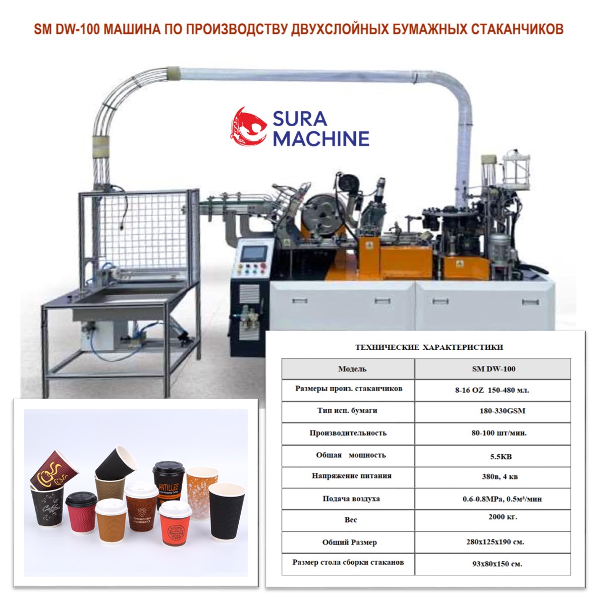 Линия По Производству Двухслойных Одноразовых Бумажных Стаканчиков Sura Machine SM-DW100   Скорость: 80-100 шт/мин Размеры производимых стаканчиков: 8-16 OZ 150-480 мл. Сырье: бумага с полиэтиленовым покрытием, гофрированная бумага, бумажный картон, серый бумажный картон и т. д. Напряжение питания: 380 В 4кв Если напряжение питания заказчика отличается, пожалуйста, сообщите нам об этом заранее. Общая мощность: 5,5 кВт Давление воздуха: 0.6-0.8MPa, 0.5м³/мин  Чистый вес: 2000 кг Размеры: 280х125х190 см. Мы можем изготовить машину и пресс-форму по индивидуальному заказу в соответствии с требованиями заказчика.