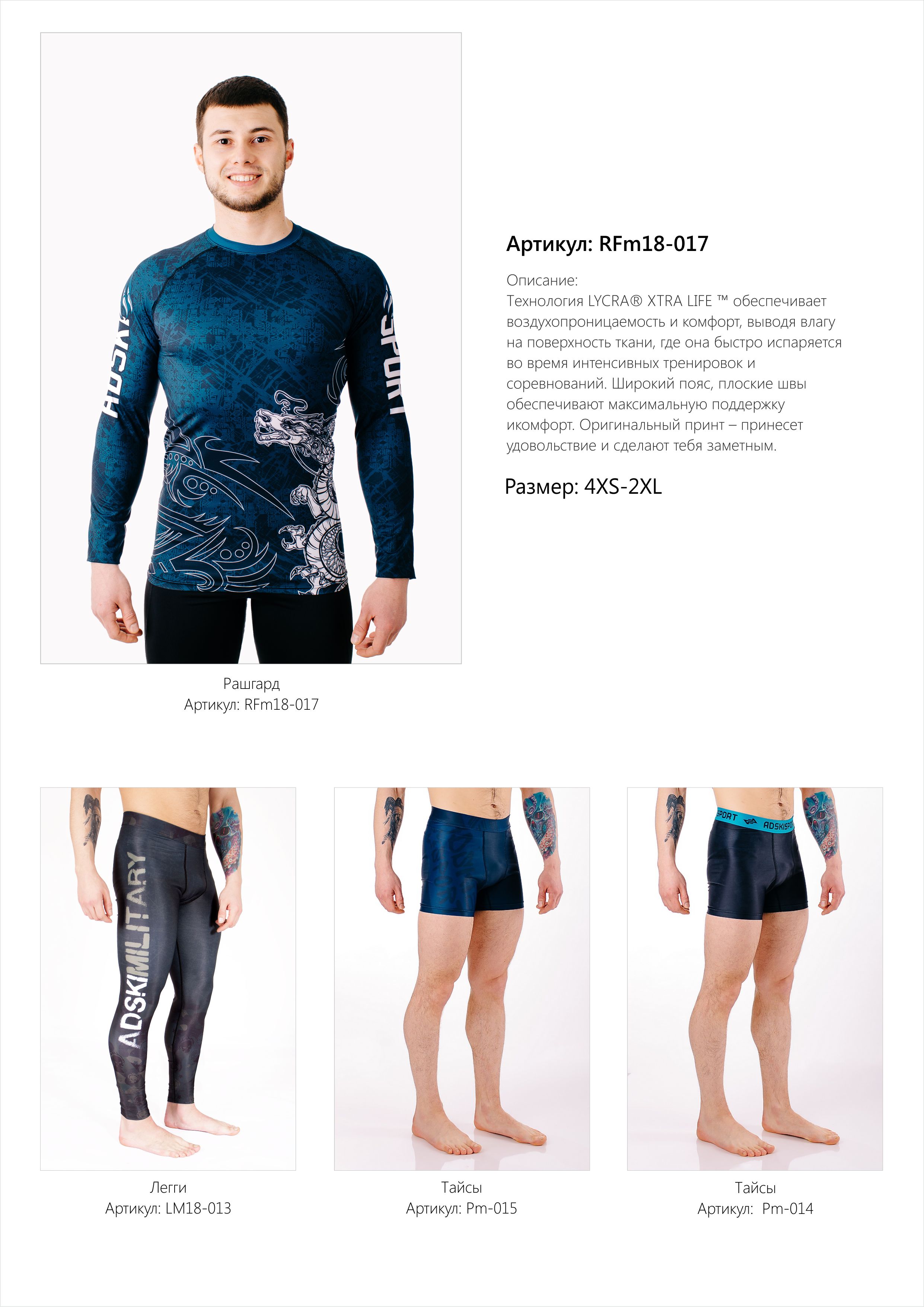 Добрый день, Компания Adski-sport занимается производством высокотехнологичной одежды для занятий спортом и фитнесом. (легги, бриджи, тайсы, рашгарды, майки-борцовки...). Наше производство находится в России, в Пермском крае. Все изделия выполнены из Итальянской ткани, с применение технологии LYCRA^XTRA LIFE, которая обеспечивает воздухопроницаемость и комфорт, выводя влагу на поверхность ткани, где она быстро испаряется во время интенсивных тренировок и соревнований. Изделия имееют коммпрессионные свойства, обеспечивают необходимую поддержку мыщцам. Отличная УФ защита и устойчивость к ультрахлорированию сохранит форму изделия при длительной эксплуатации. Широкий пояс, плоские швы обеспечивают максимальную поддержку и комфорт. Оригинальный принт принесет удовольствие и сделают заметным. Состав 82% полиэстер 18% эластан.