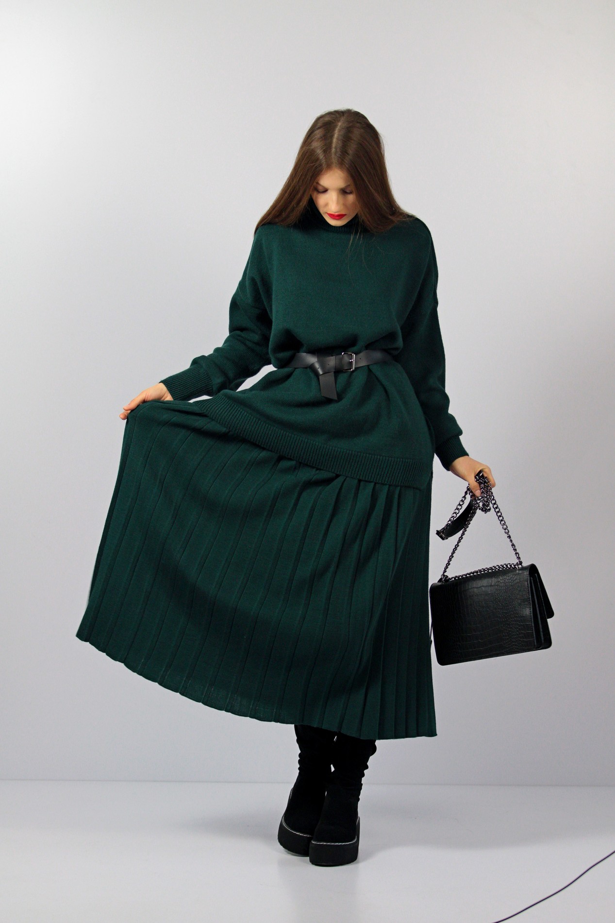 Юбка плиссе снова в моде и она твердо вошла в базовый гардероб . Сегодня плиссированная юбка прекрасно себя чувствует среди вещей любого стиля: будь то casual, деловой или романтический стиль, бохо или классика. Модницы комбинируют юбки плиссе с чем душа пожелает, а мы вам предлагаем носить юбку плиссе с объемным свитером состав 50% акрил 50 %шерсть Юбку и свитер можно приобрести как комплектом,так и раздельно