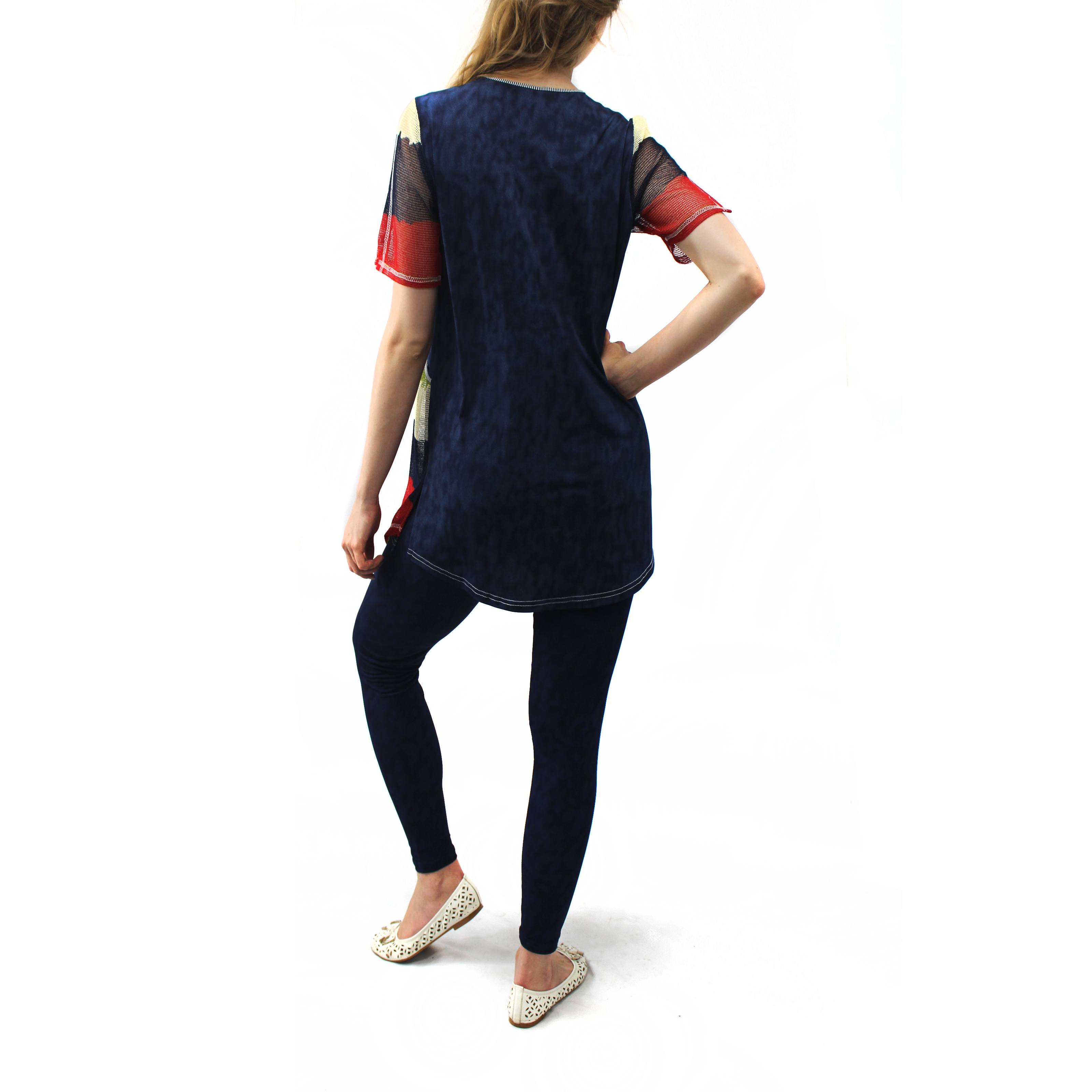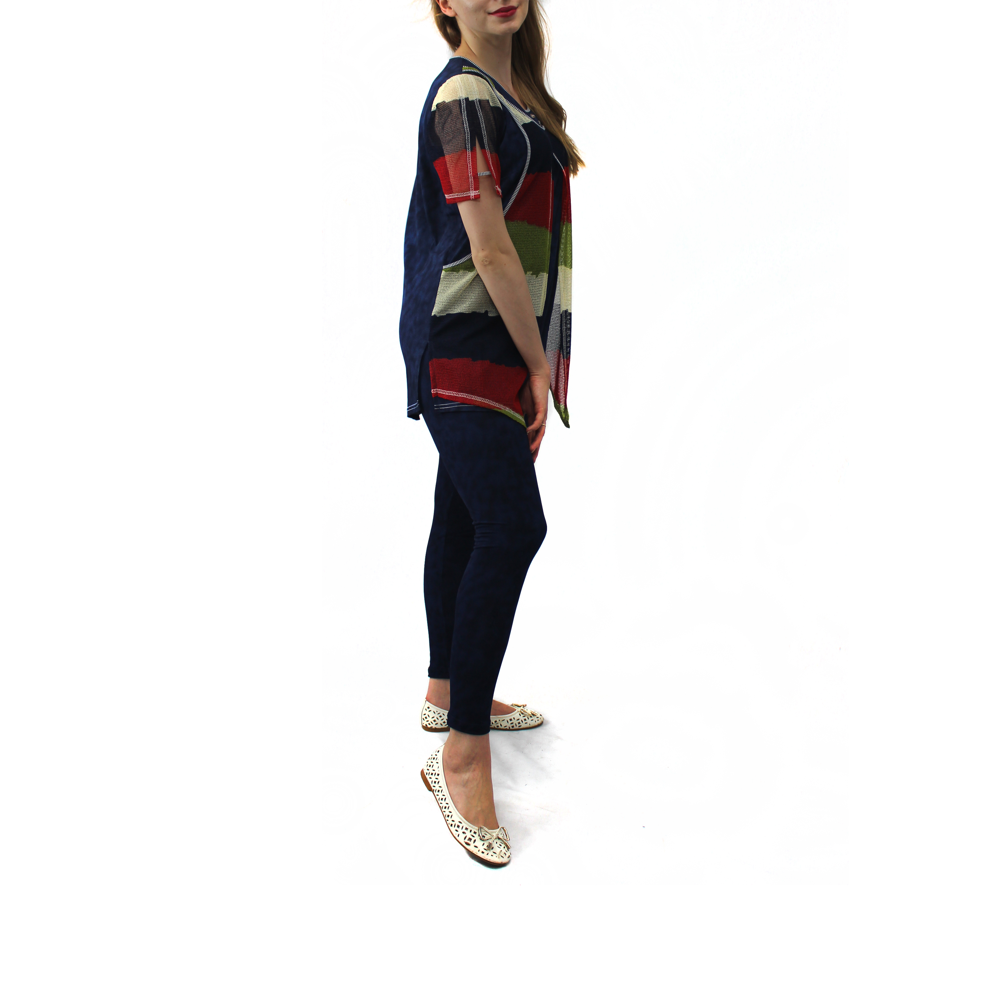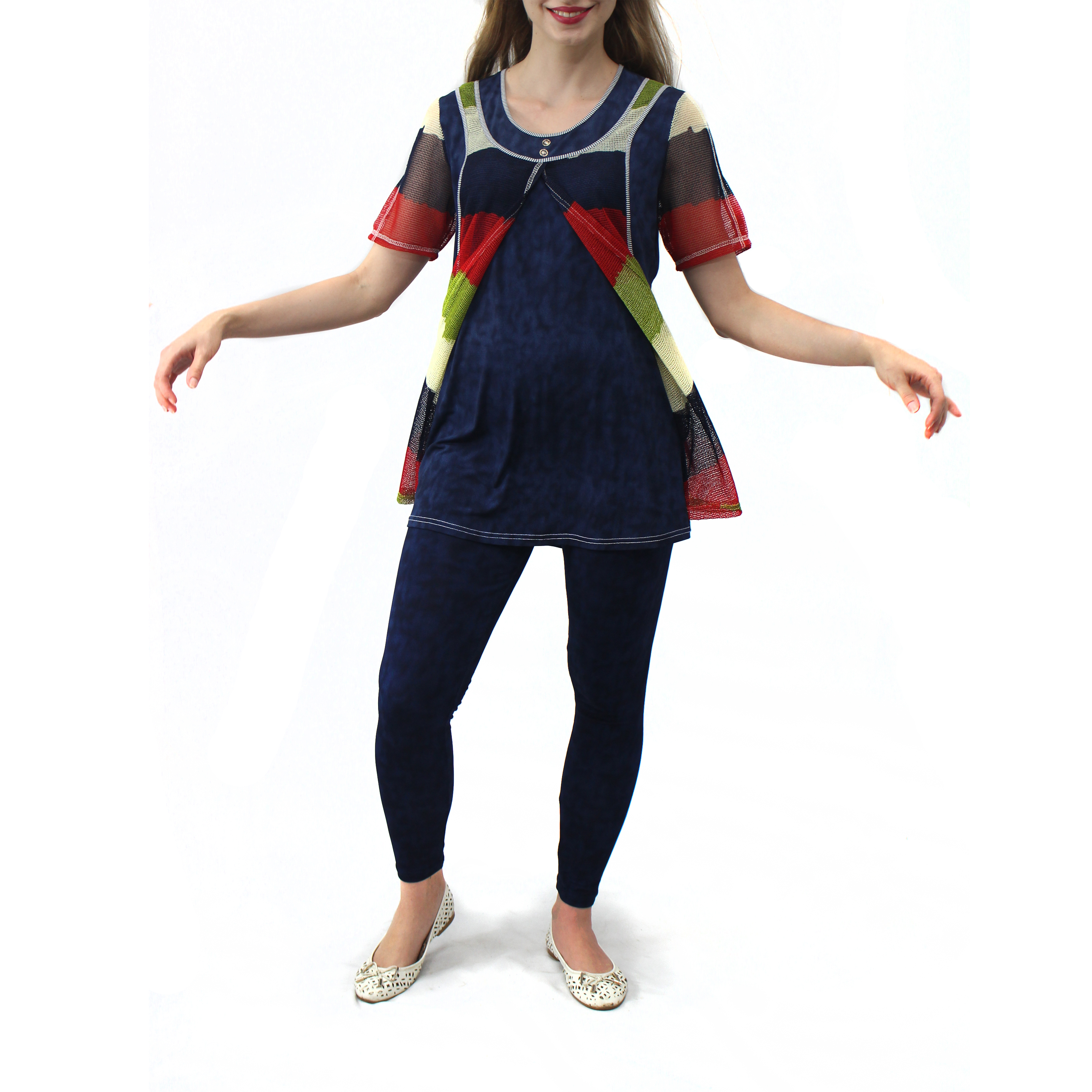 Брючный комплект "Разлетайка" . Длина туники позволяет скрыть небольшие недостатки. Позволяет одевать вместо брюк лосины или обтягивающие брюки. Ткань; корейская - джинса, варенка. добавлена цветная сетка. РАЗМЕРНЫЙ ряд 48-58..